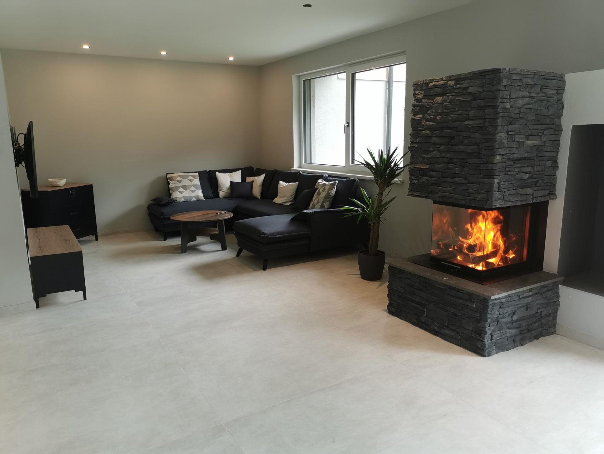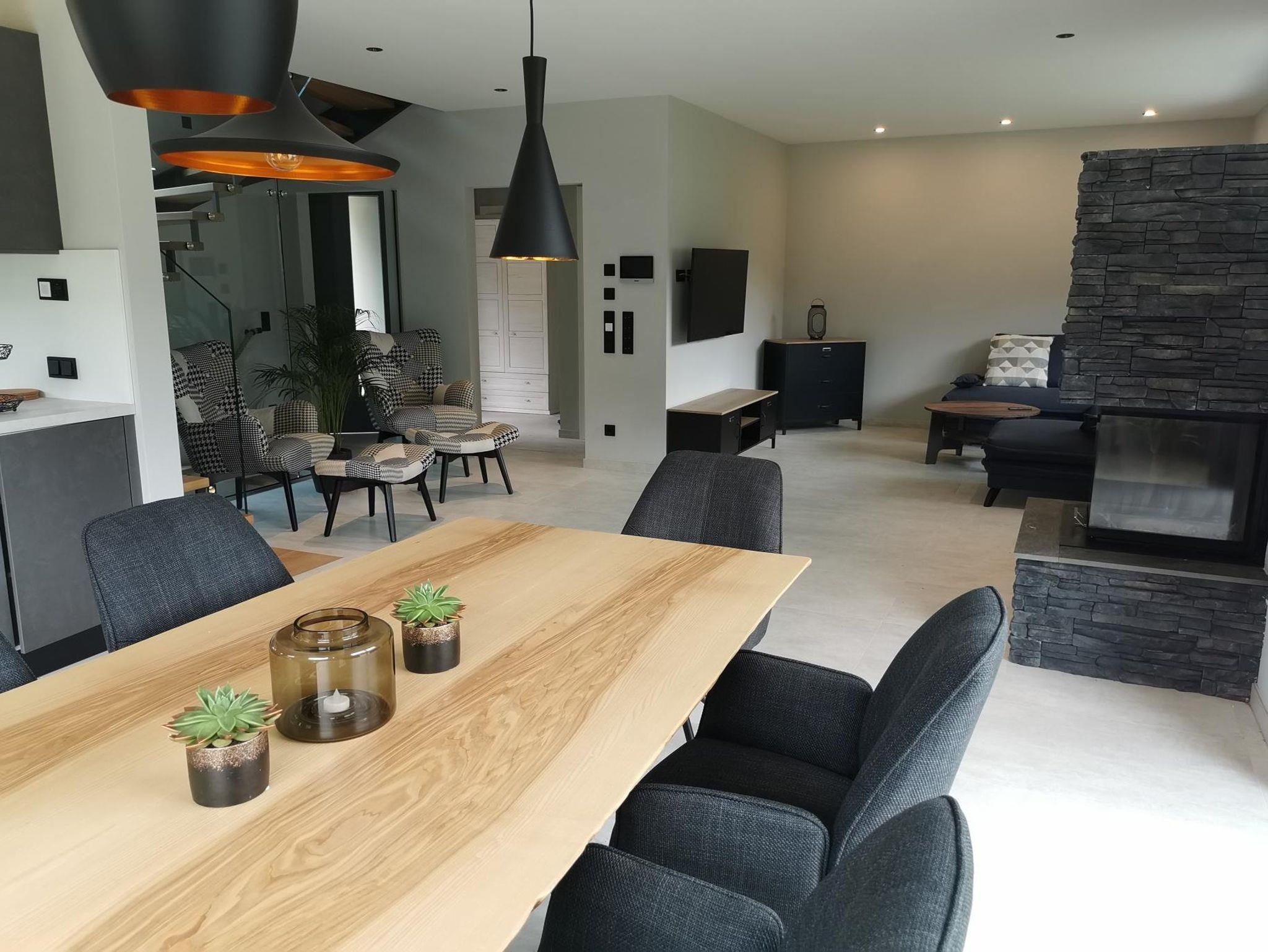 Ferienhaus bis zu 9 Personen, Küche, Esstisch, großer Wohn-Schlafraum mit offenen Kamin, Couch, drei Schlafräume, drei Bäder, ein WC extra, Gardarobe, Grosse Terrasse Sonnenliegen Grillplatz, und eigener Garten mit Spielplatz.