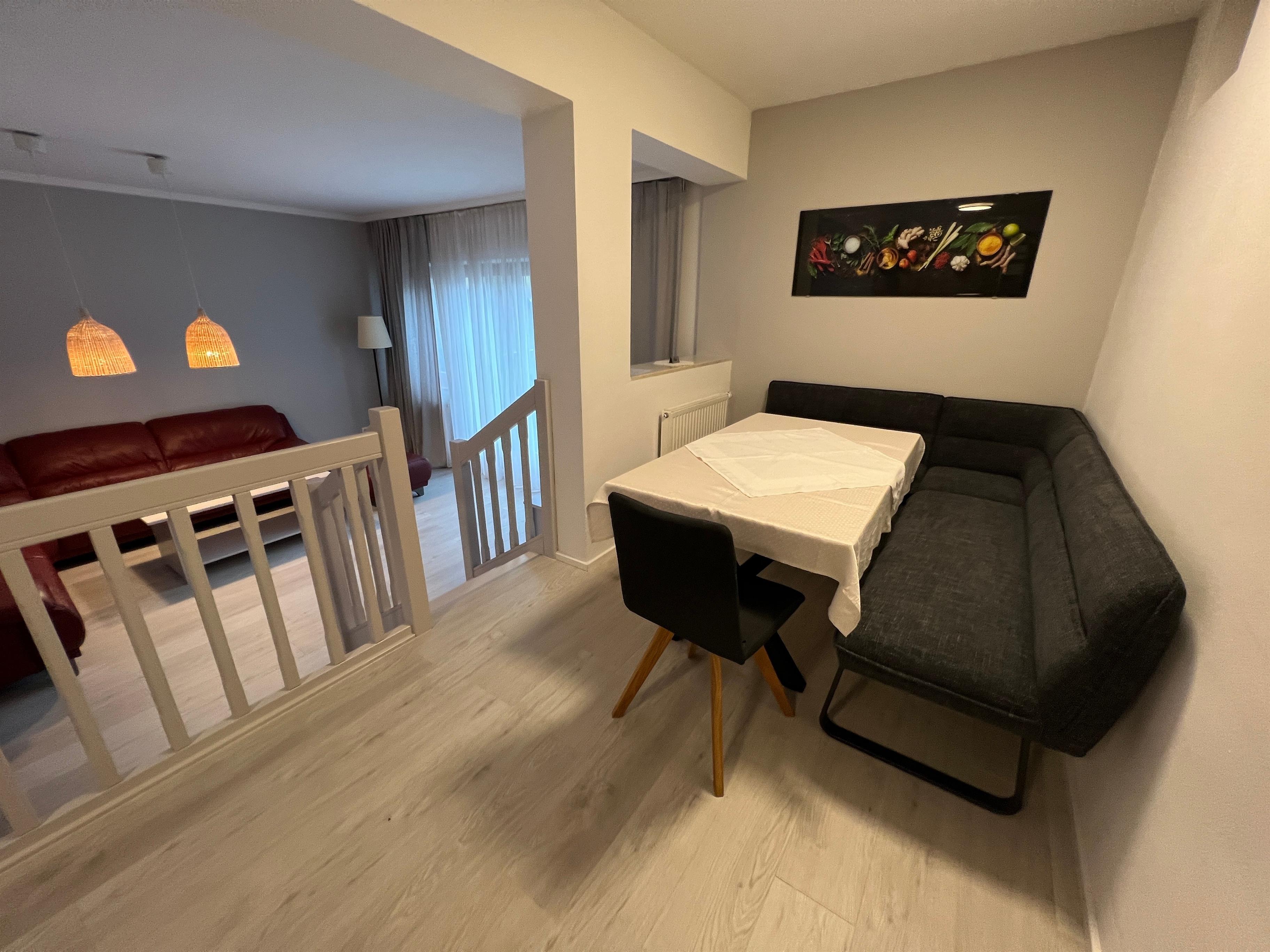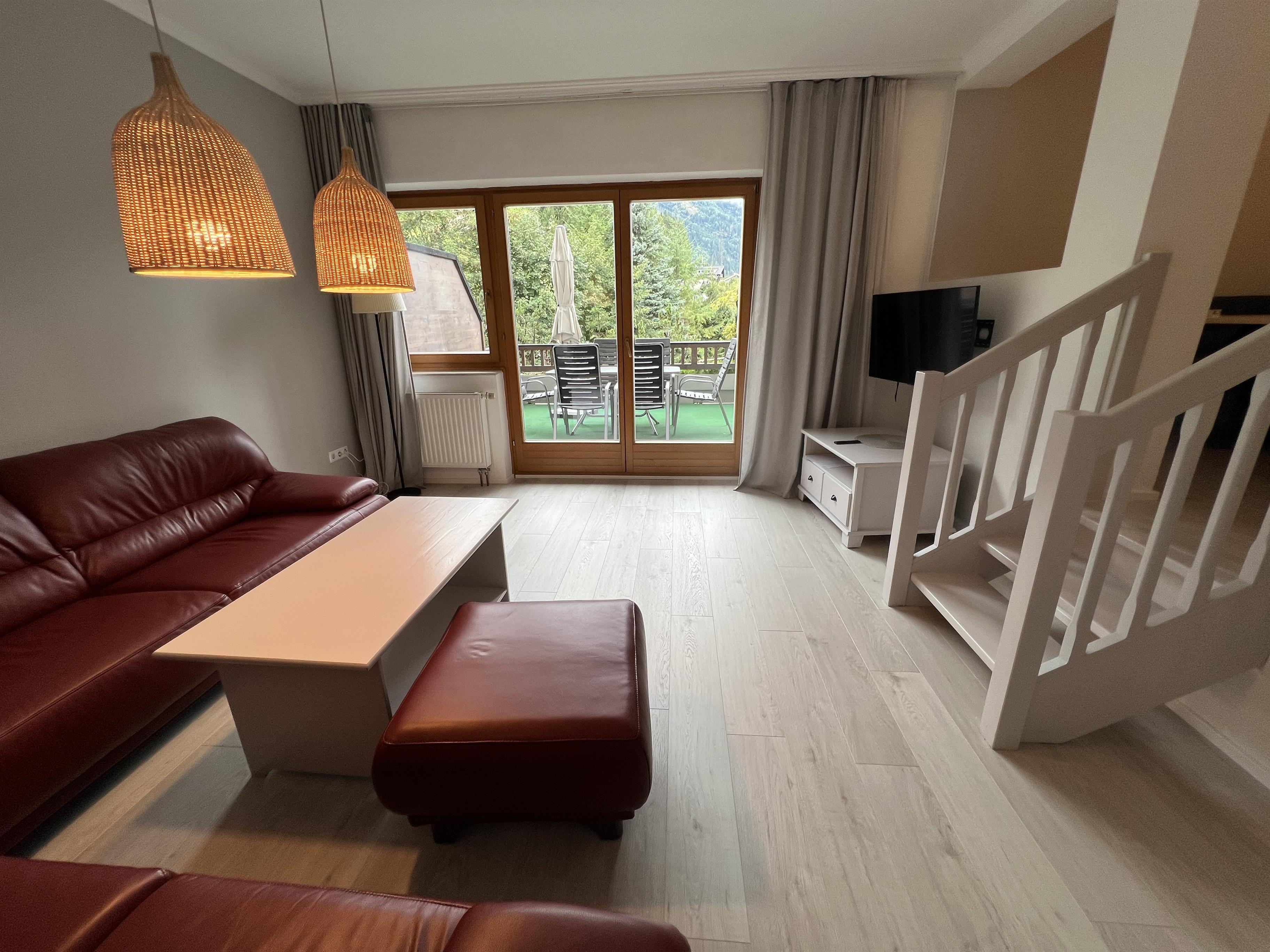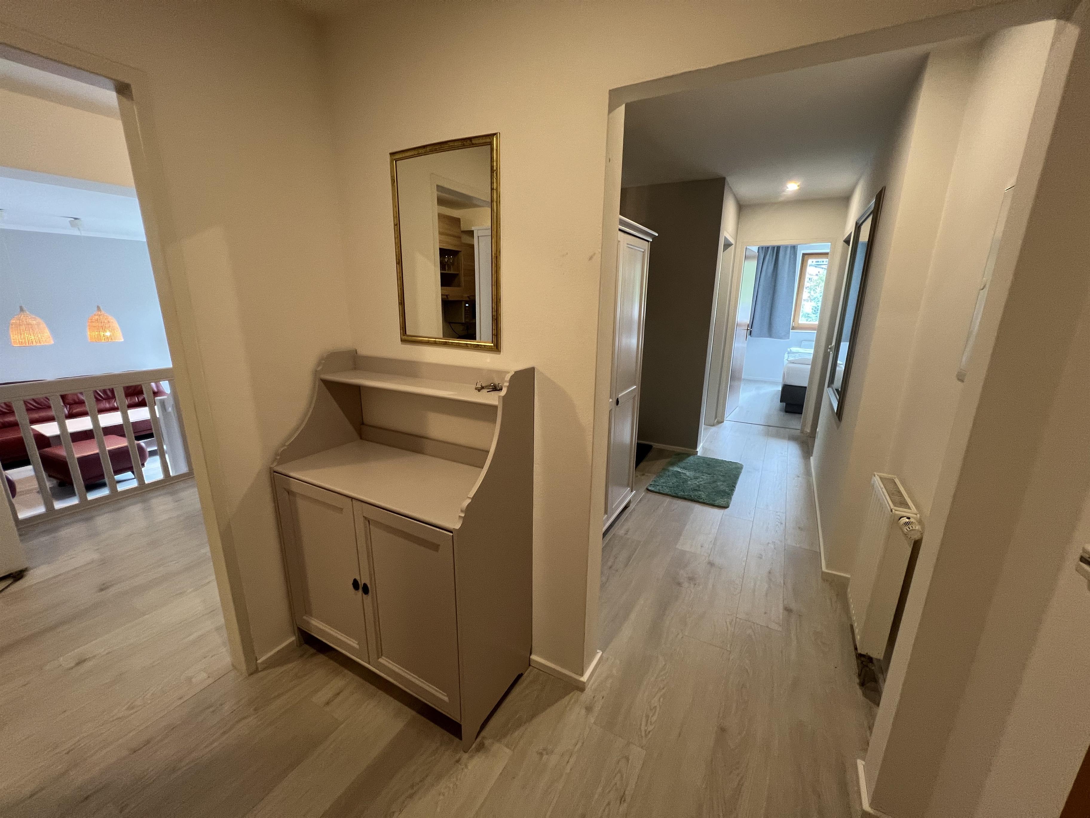 Das Apartment hat einen eigenen Wohnraum mit gut ausgestatteter Kochnische, ein Schlafraum mit einem Doppelbett, ein zweiter Schlafraum einem Doppelbett und einer Schlafsofa, ein Bad mit Badewanne/WC, ein WC extra. Vorraum und Terrasse mit Bergblick.