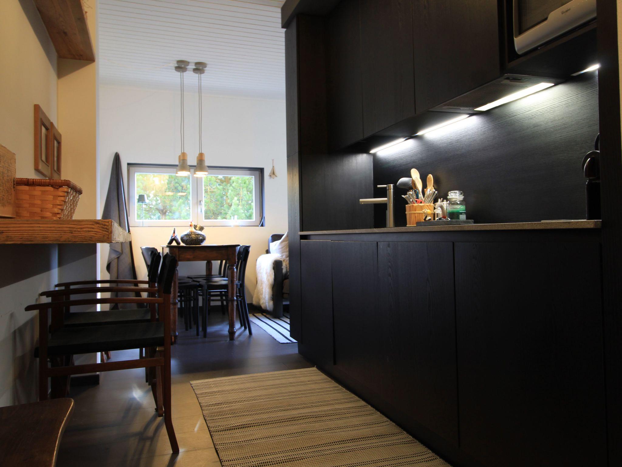 The flat features an elegant bedroom with a comfortable double bed, a modern bathroom with shower, and an open-plan living area that includes a fully equipped kitchen, dining area and cosy living room. The interior is designed for comfort and style, so you can feel right at home even when on holiday.