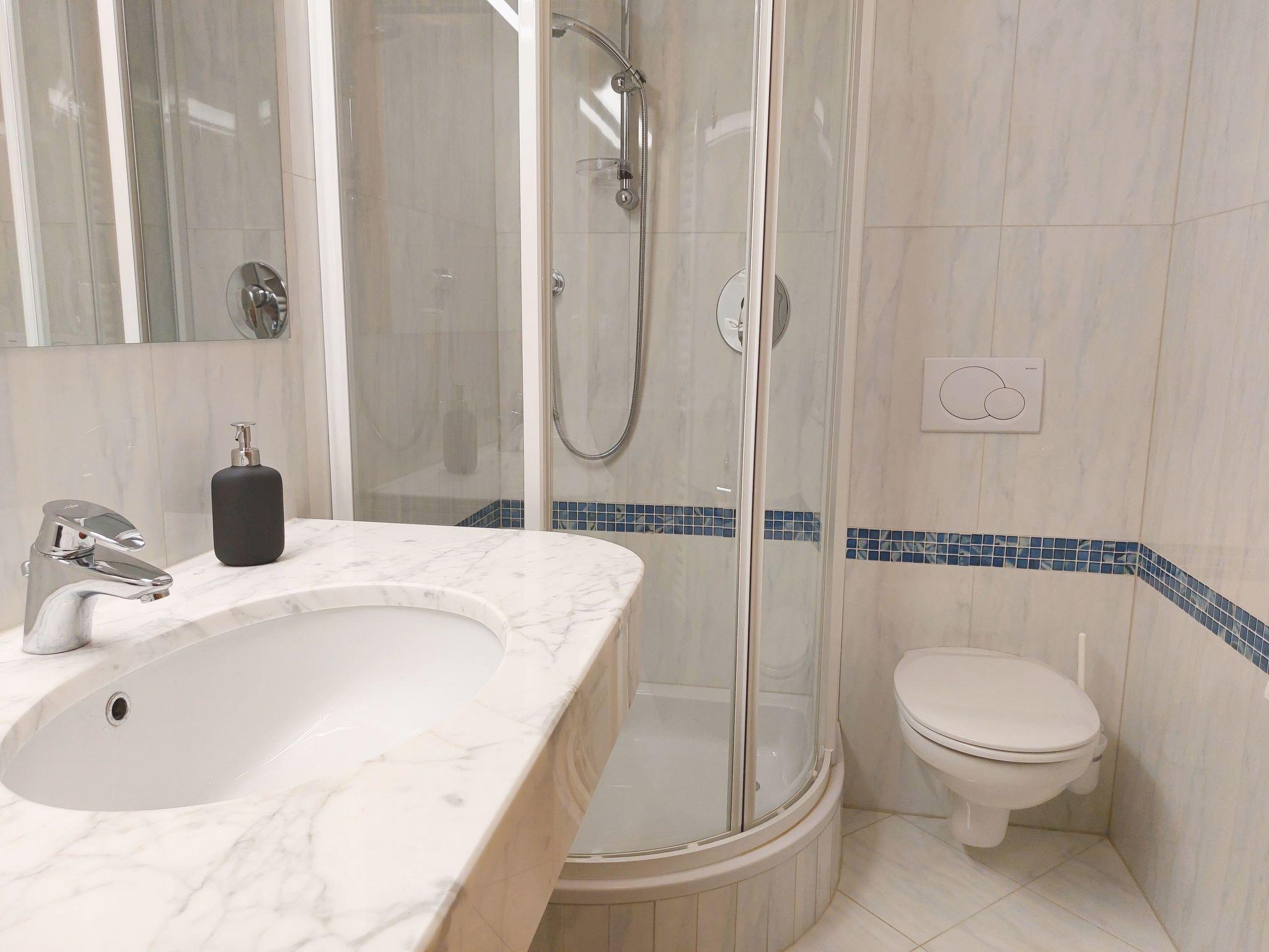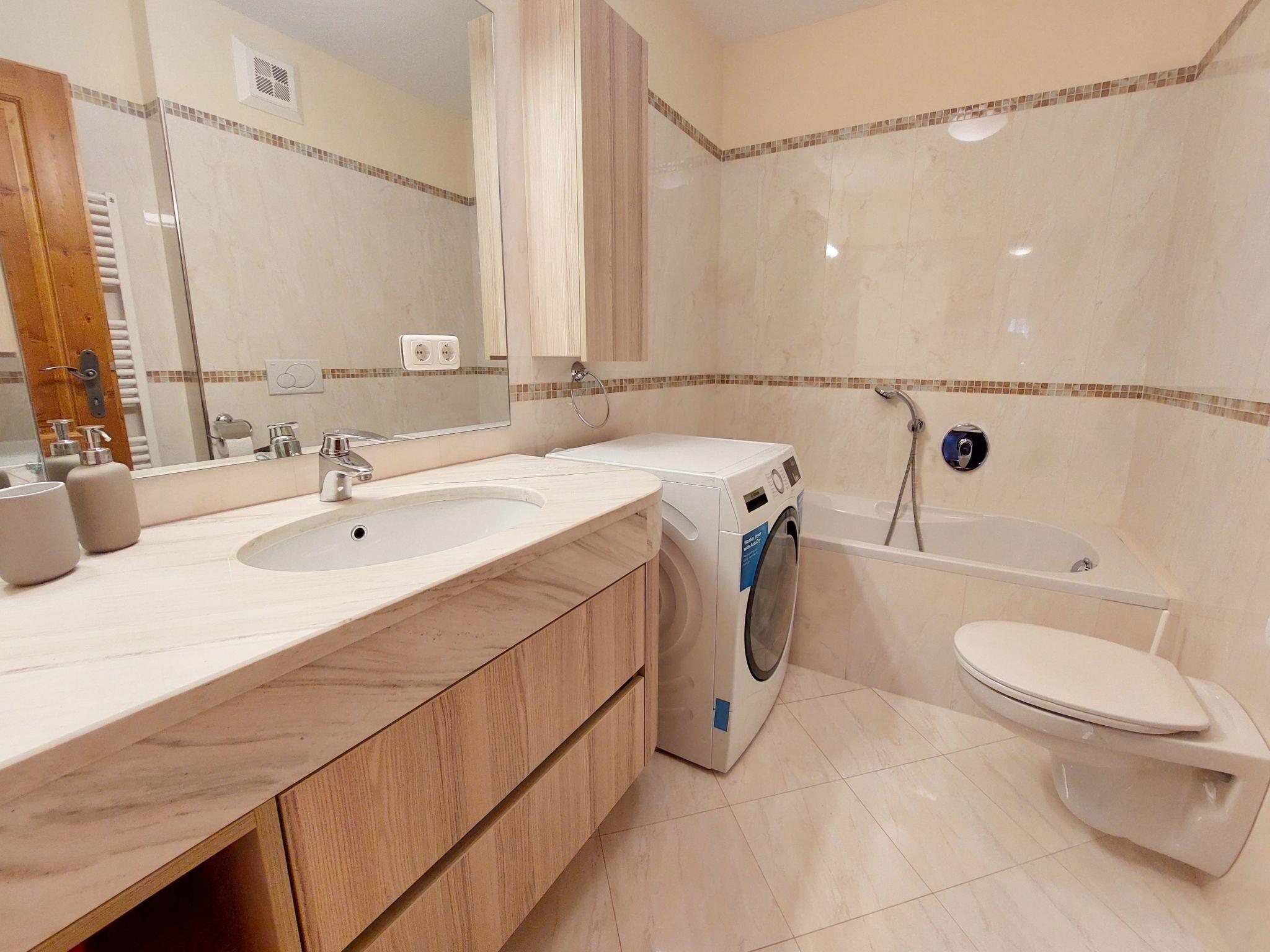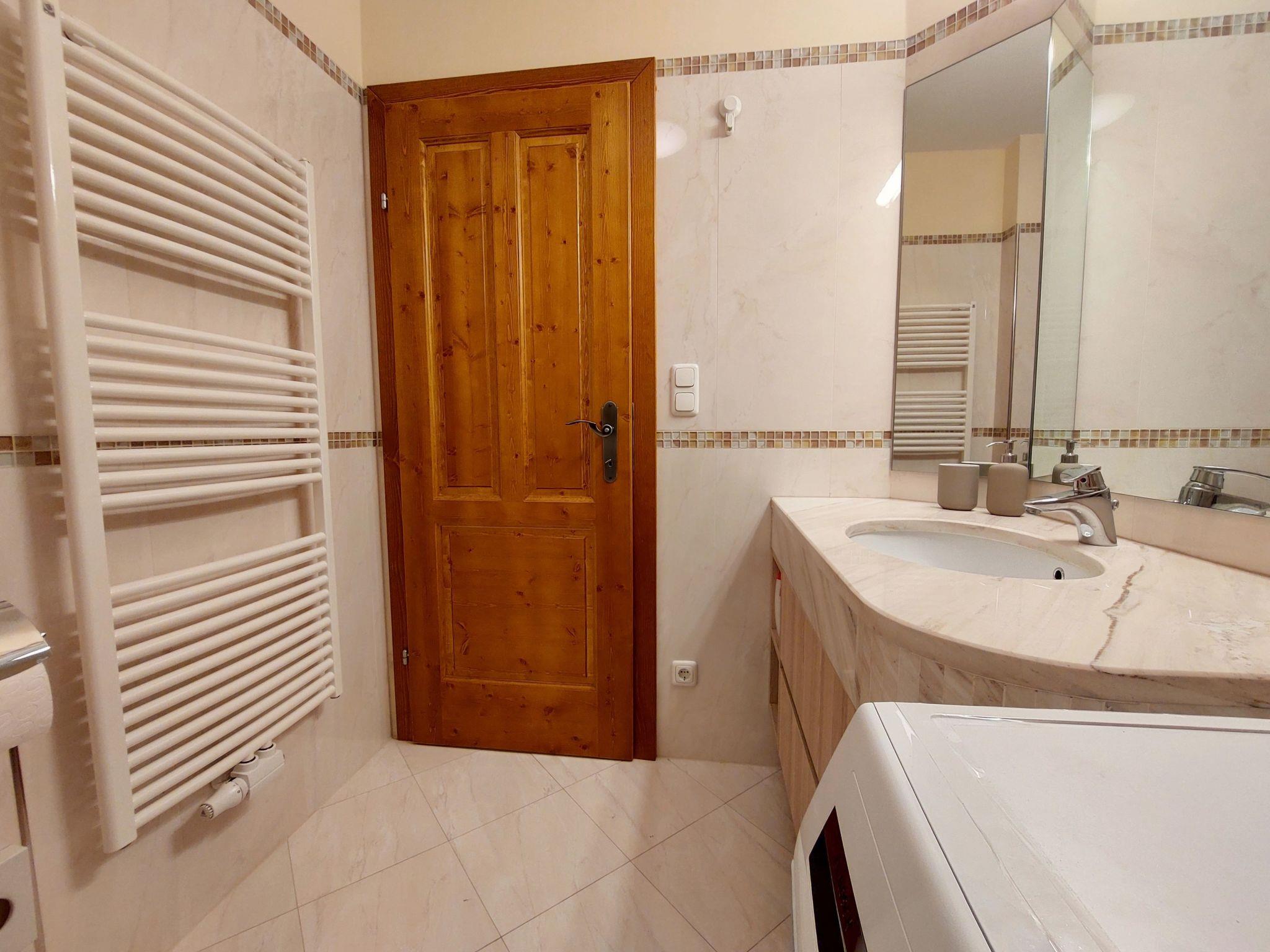 Inside the flat you will find two bedrooms and two bathrooms, one equipped with a shower and the other with a bathtub, ensuring privacy and comfort for all guests. Underfloor heating spreads a pleasant warmth throughout the flat on colder days. The practical facilities also include a washing machine, a fully equipped kitchen with a ceramic hob, a filter coffee machine, a kettle and a dishwasher, making self-catering a pleasure.