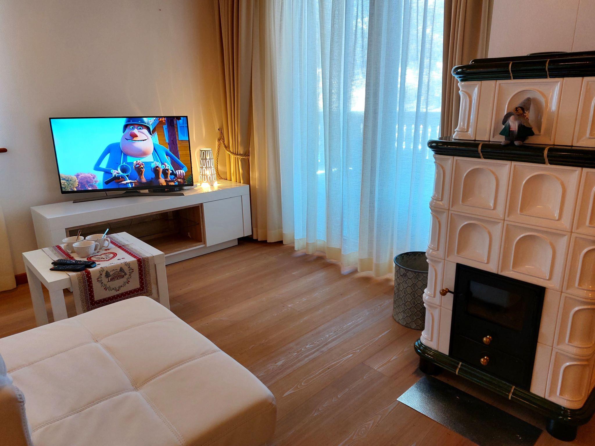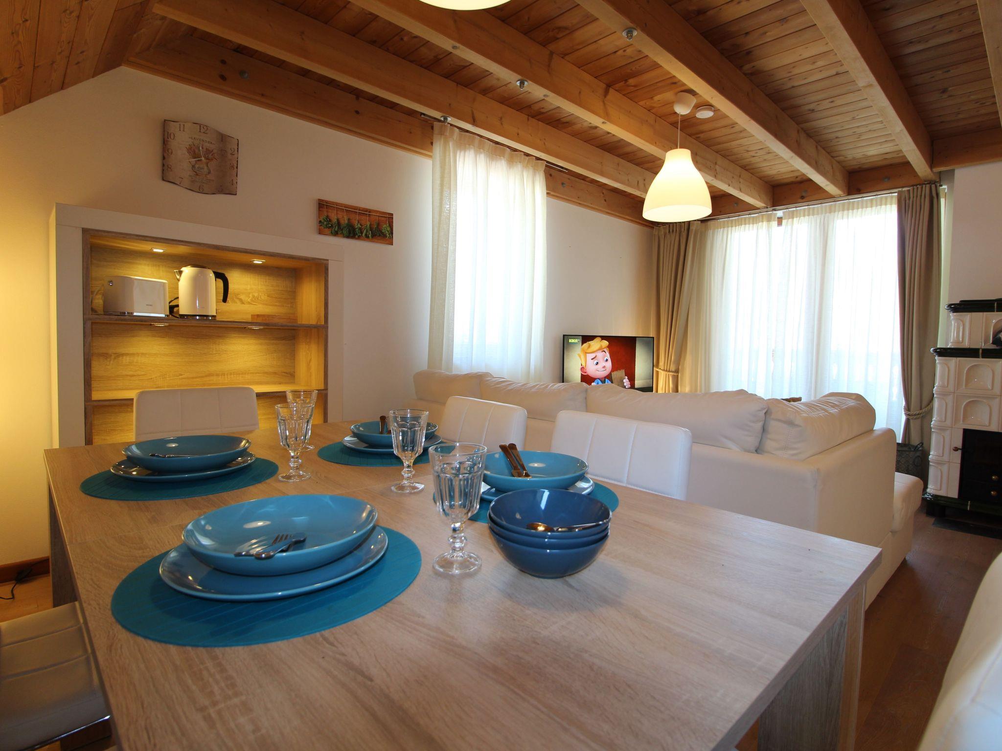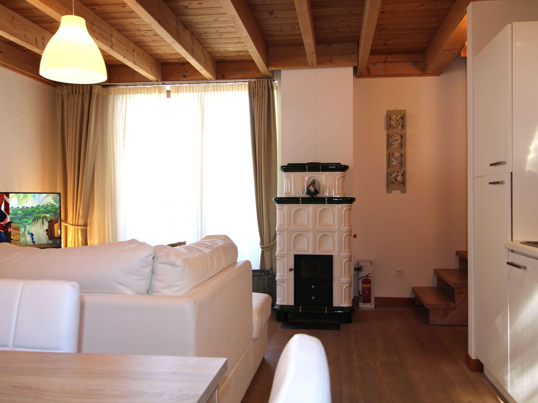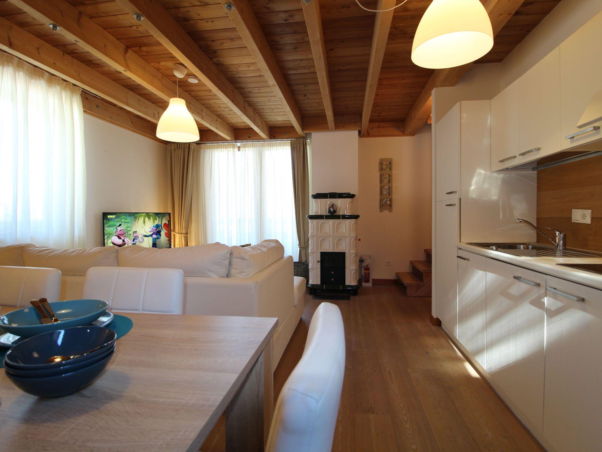 Inside, the flat has an inviting and warm atmosphere. It has three cosy double bedrooms that promise rest and relaxation after a long day on the slopes. Two complete bathrooms offer all the necessary amenities such as a toilet, washbasin, shower and bidet. The heart of the flat is the cosy living room, which is equipped with an integrated kitchen, a dining table for 6 people and a sofa. A special highlight is the traditional wood-burning stove, which provides cosy warmth. Access to a large balcony invites you to enjoy the fantastic view of the idyllic valley and the lively ski piste.