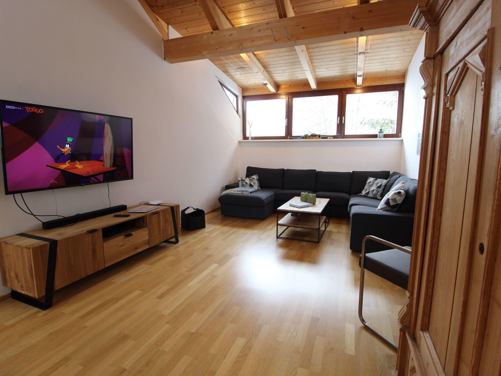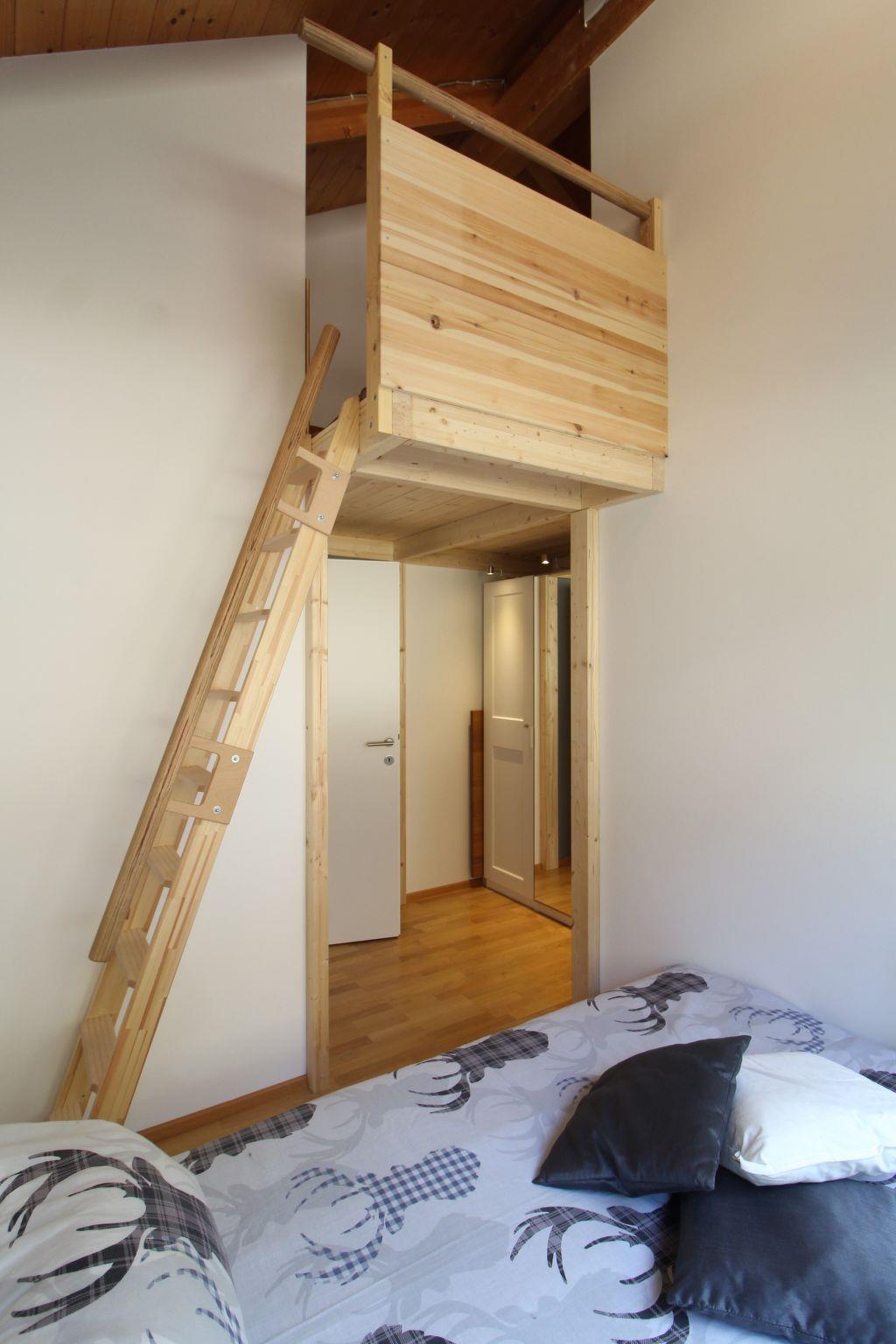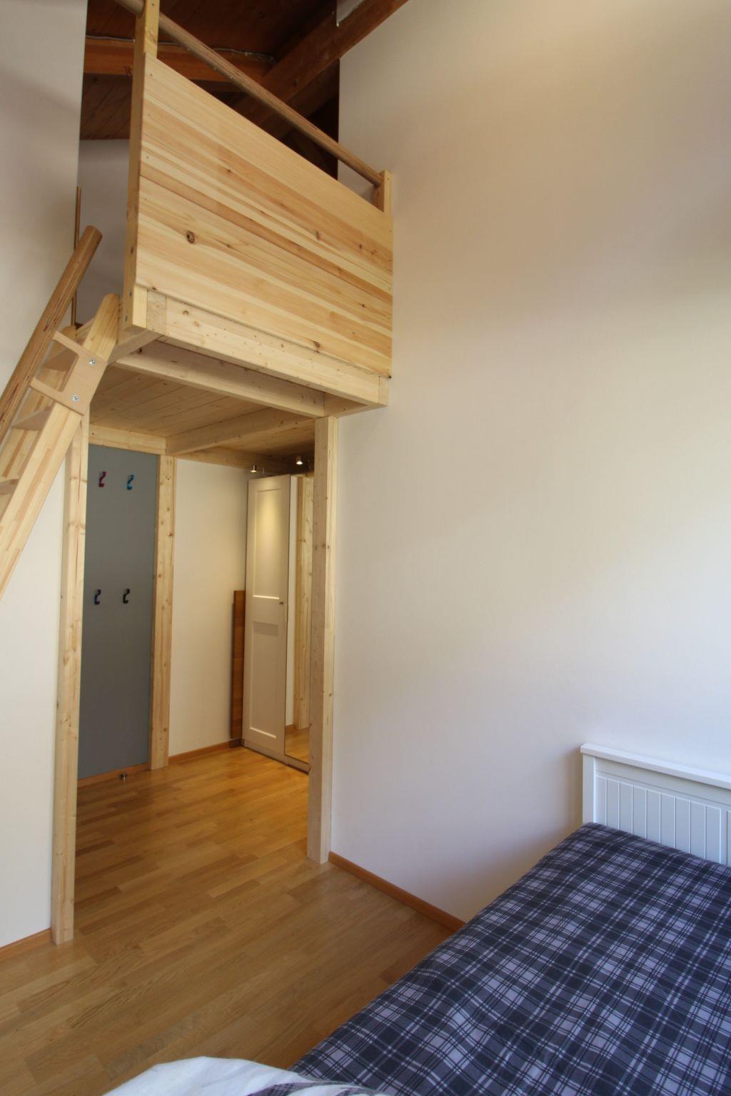 The interior of the flat welcomes you with a practical cloakroom including a ski storage corner and boot warmer. A WC, an inviting double bedroom with balcony and en-suite bathroom with shower are also located on the entrance level. The upper level fascinates with its spaciousness and open-plan concept, which skilfully combines a fully equipped kitchen, a dining table and a relaxation area with sofa and TV. A further bedroom with a double bed, a luxurious bathroom with jacuzzi and shower, a separate toilet and the children's room, which has a single bed that can be converted into a double bed and a delightful play mezzanine, complete the offer.