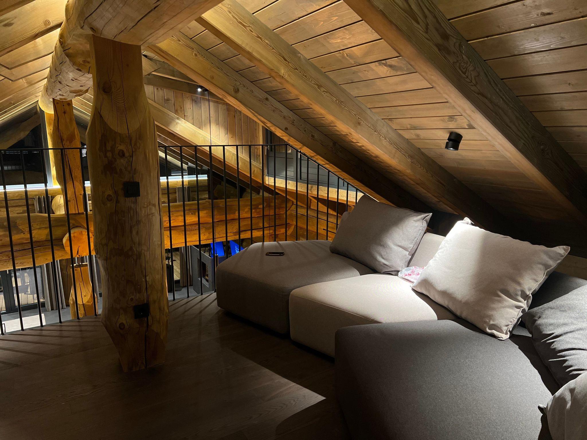Upstairs is a very large, double high ceiling, living area with wonderfully exposed logs and an open fireplace. The whole floor is surrounded by a large terrace with a town view. There is a fully equipped kitchen with a cosy dining area. The heated ski room is accessible directly from outside and a guests toilet is also located on the same floor.