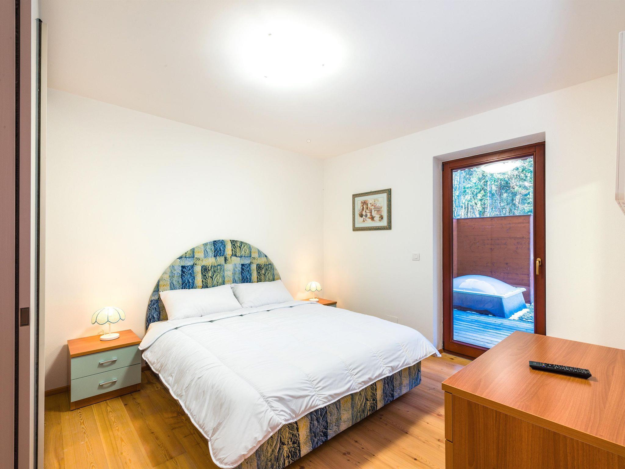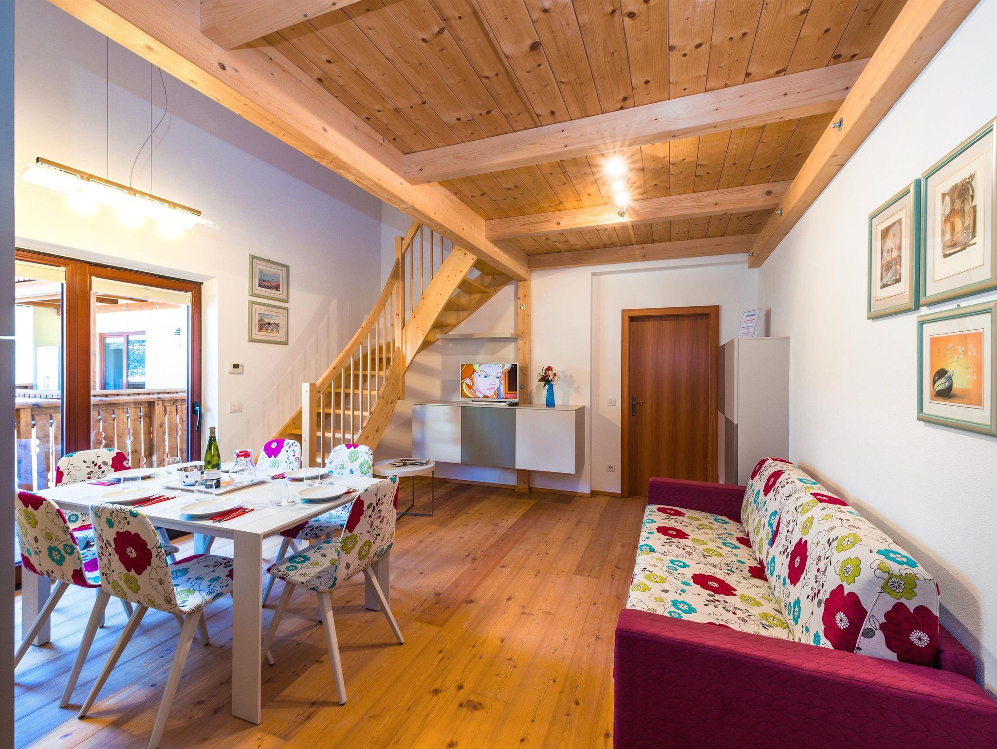 Wohnraum/Essraum mit offener Kochnische sowie Doppelschlafcouch und Balkon, ein Schlafzimmer mit Doppelbett, Badezimmer (Dusche/WC/Bidet) und einen Schistall.