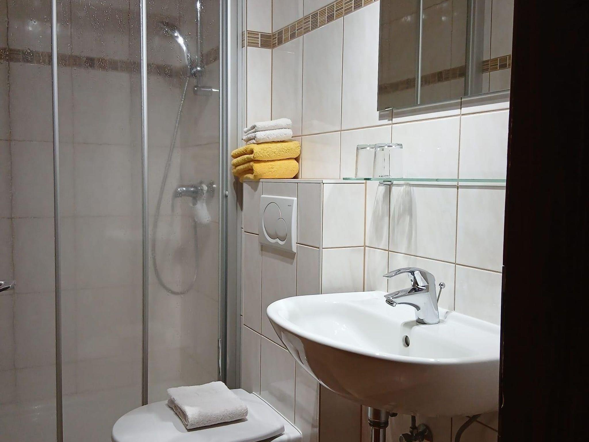 Schlafzimmer Die Schulbank 2 mit einem Doppelbett und einem Einzelbett im 1. Stock mit Fichtenholzmöbel, Parkett-Holzboden, Fliesenboden im Badezimmer, 3 Fenster, 1 Balkon-Fenstertür, Dusche/WC, Radio, Sat-TV, Balkon, WLAN, Bademäntel, Kosmetikprodukte