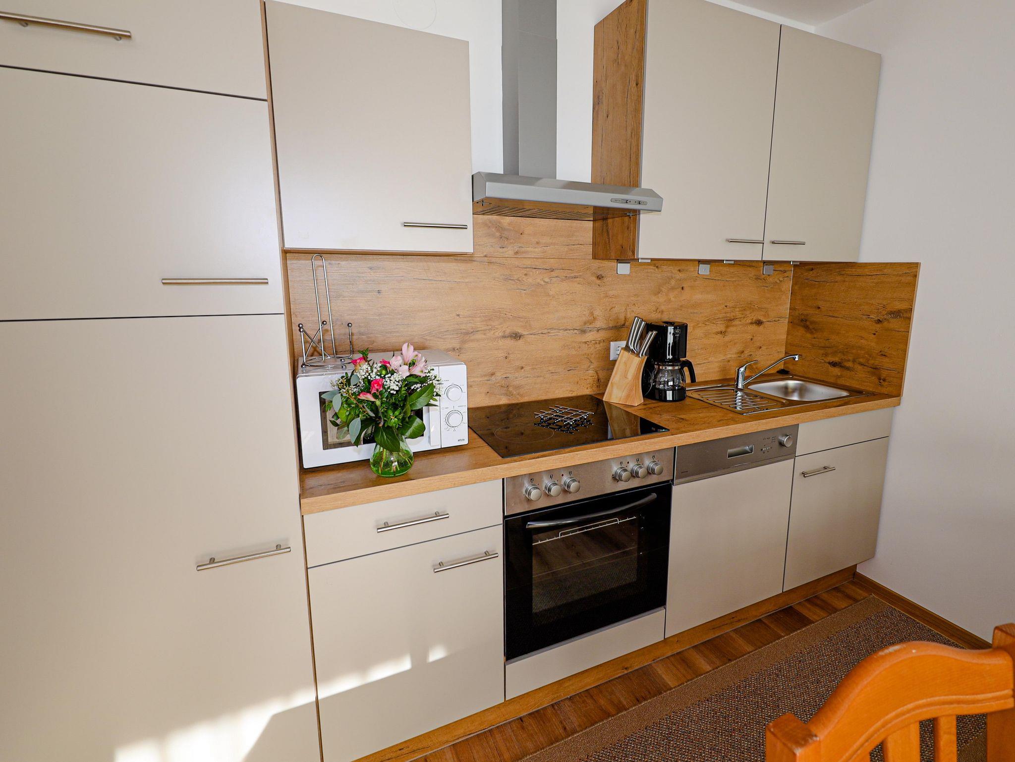 • Eine Wohnküche mit ausziehbarer Doppelcouch, ideal für zusätzliche Schlafgelegenheit