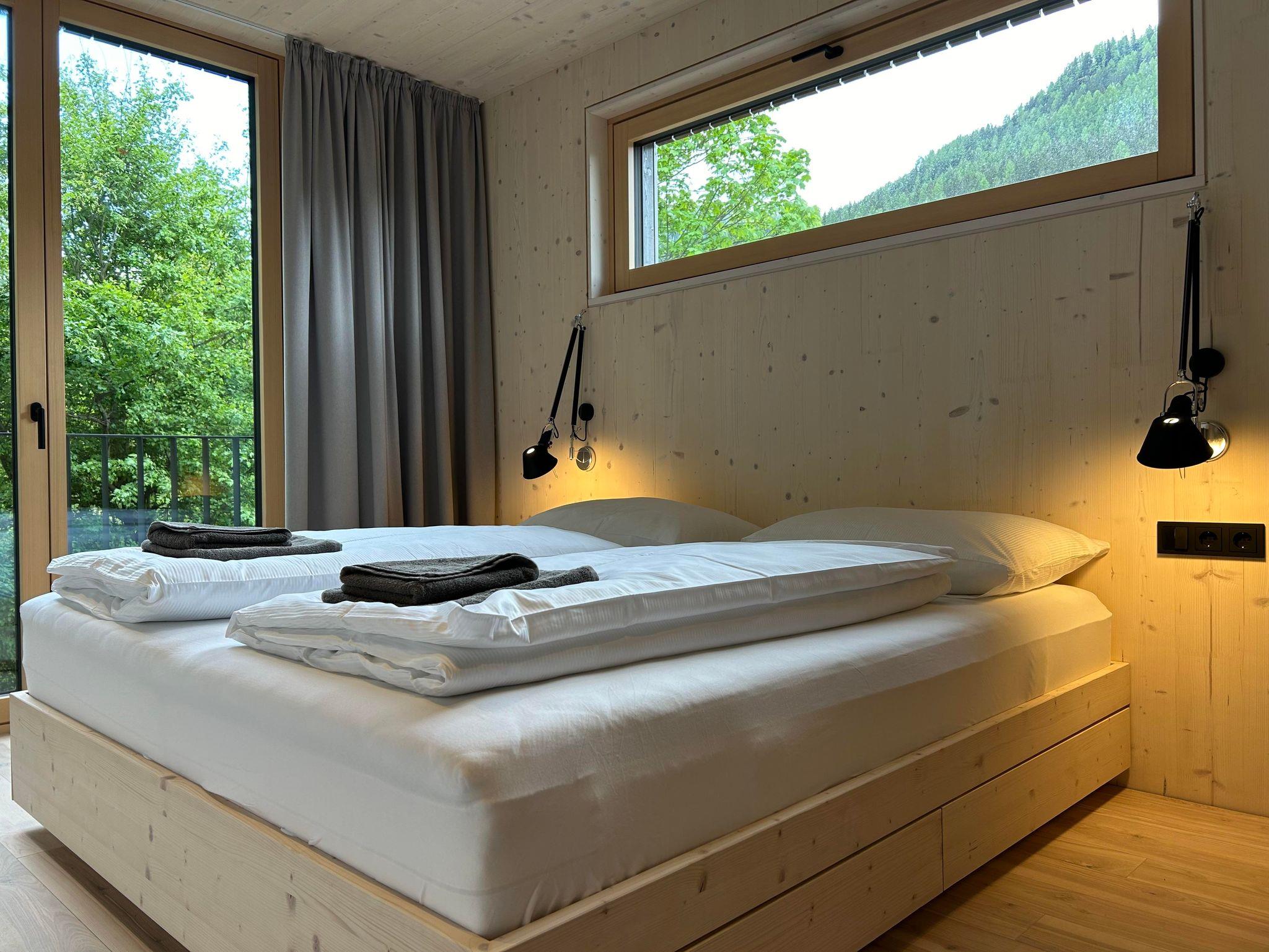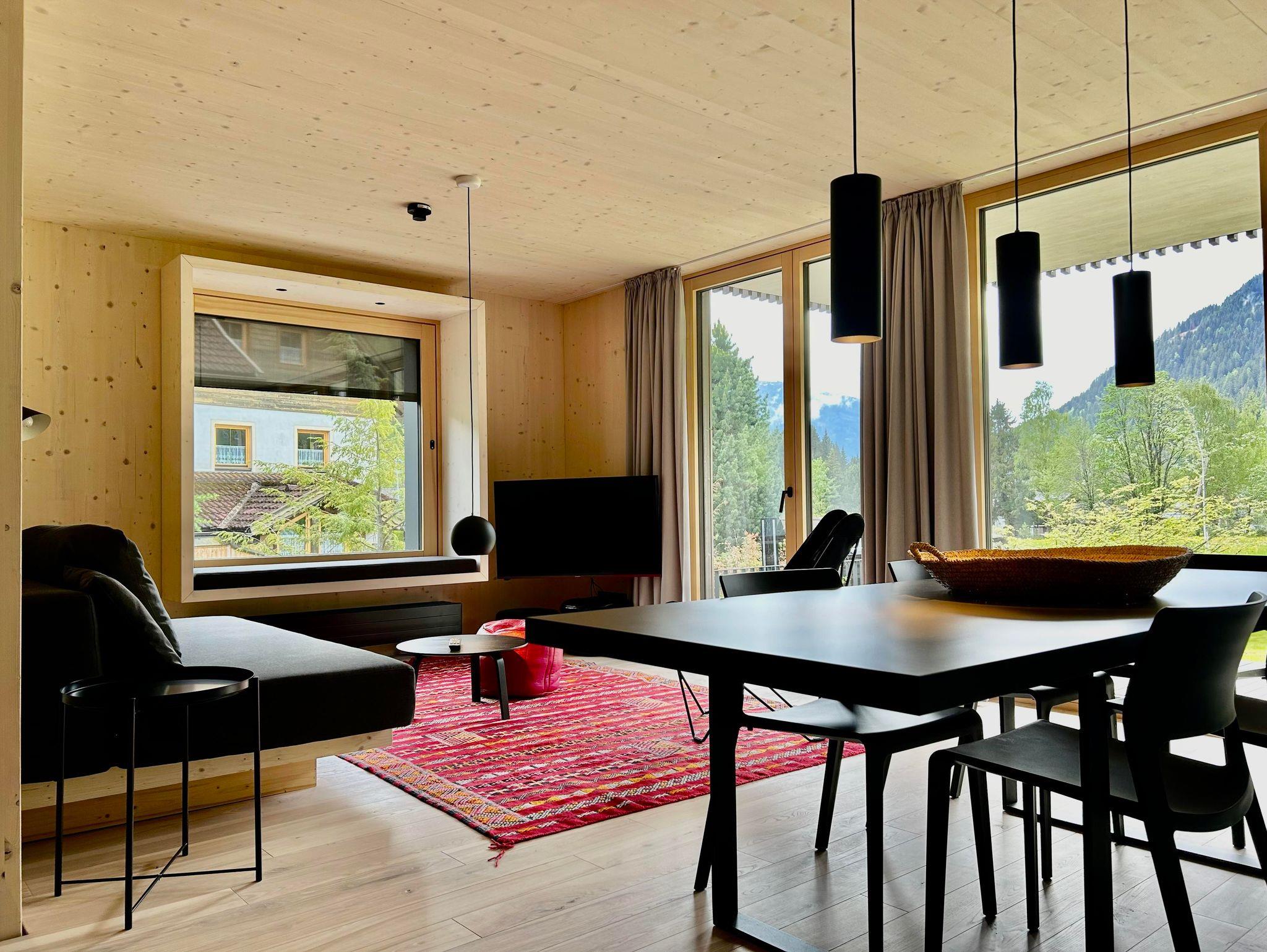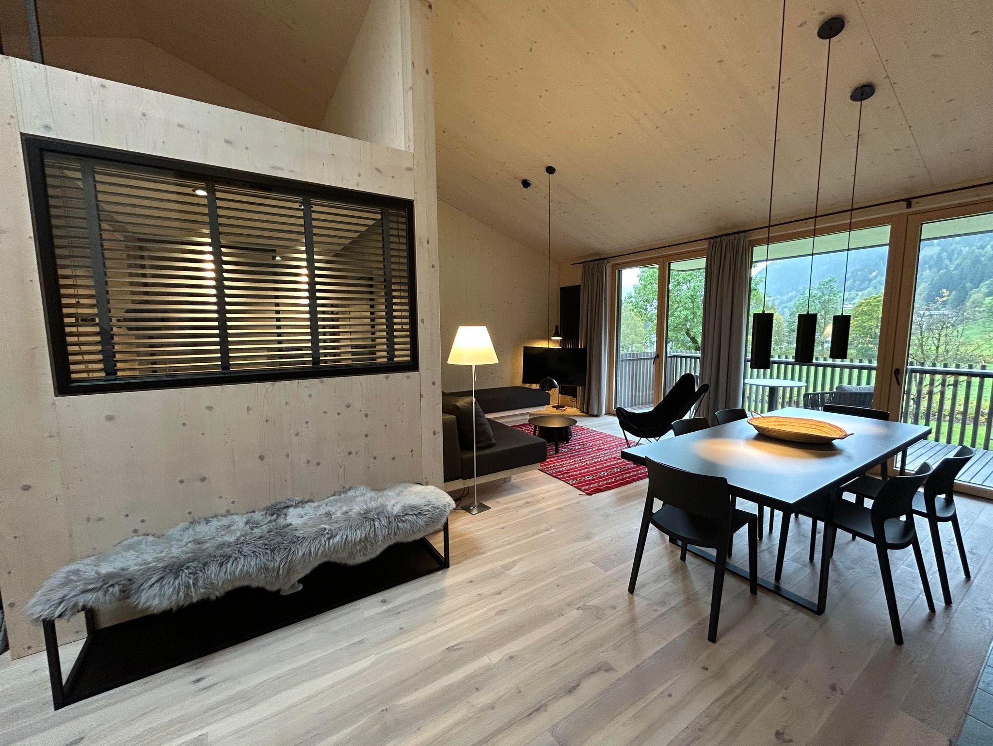 Das Interior-Design der Wohnbereiche ist in warmen Erdtönen gehalten und mit natürlichen Materialien gestaltet. Boden, Decke und Fenster sind in Echtholz ausgeführt. Die Küchennische ist in frischem Quellwassergrün gehalten und öffnet sich einladend zum Wohnbereich. Ein Kaminofen sorgt bei kühlen Temperaturen für behagliches Knistern.