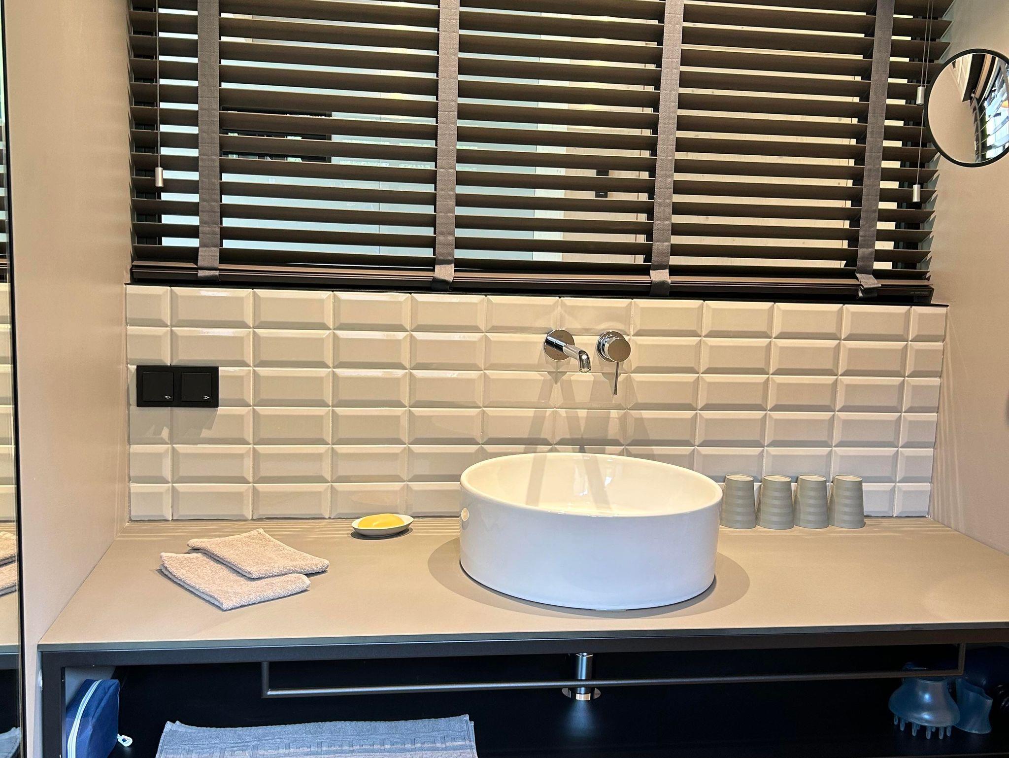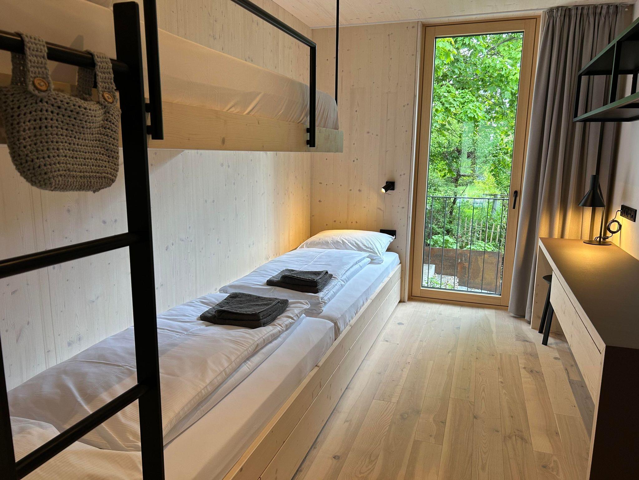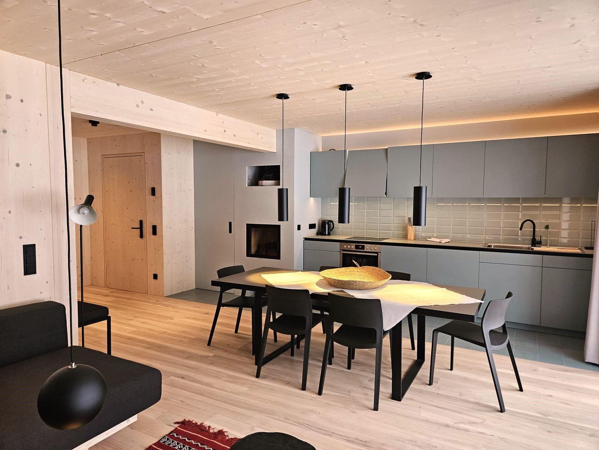 Das Interior-Design der Wohnbereiche ist in warmen Erdtönen gehalten und mit natürlichen Materialien gestaltet. Boden, Decke und Fenster sind in Echtholz ausgeführt. Die Küchennische ist in frischem Quellwassergrün gehalten und öffnet sich einladend zum Wohnbereich. Ein Kaminofen sorgt bei kühlen Temperaturen für behagliches Knistern.