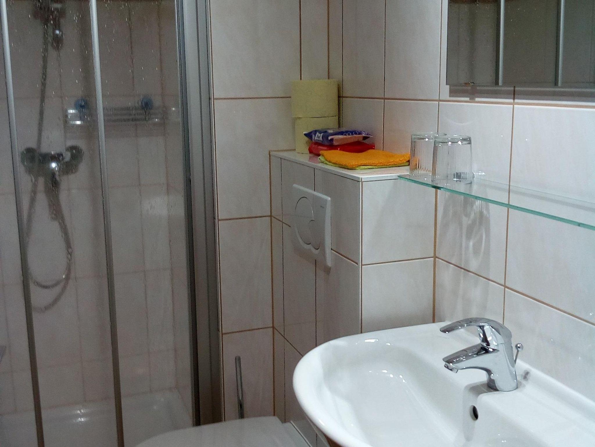 Schlafzimmer Die Schulbank 1 mit einem Doppelbett und einem Einzelbett im 1. Stock mit Sat-TV, Radio, Dusche/WC, Balkon, 1 Fenster, 1 Balkon-Fenstertür, Fichtenholzmöbel, Holz-Parkettboden, Fliesenboden im Badezimmer, WLAN, Bademäntel, Kosmetikprodukte