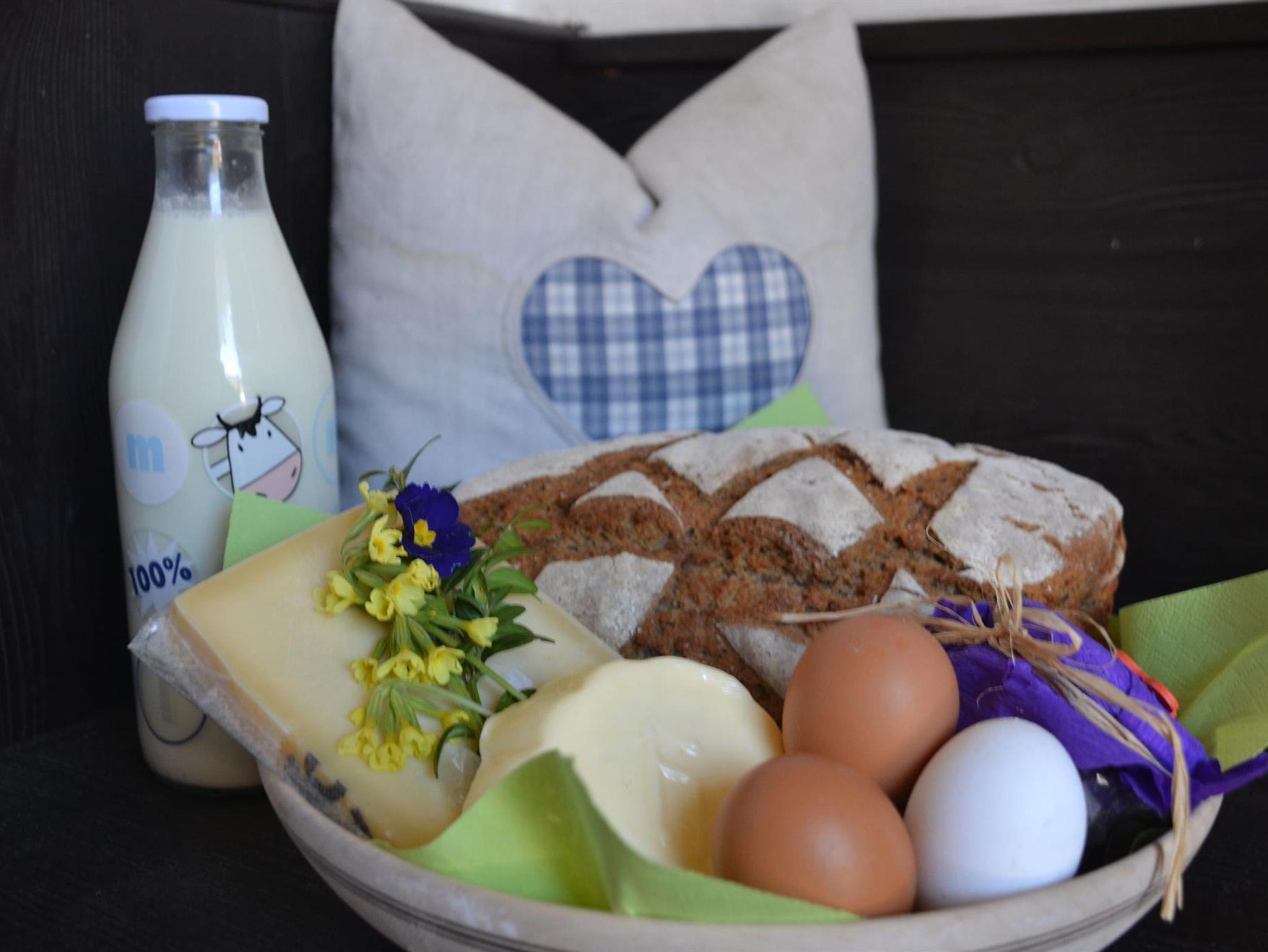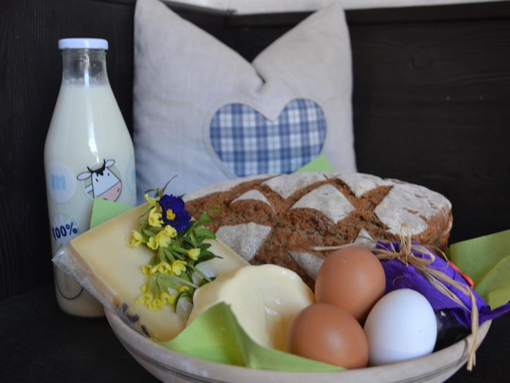 Morgens bringen wir Ihnen gerne frische Semmel sowie frische Milch und Brot aus eigener Erzeugung direkt zum Appartement.