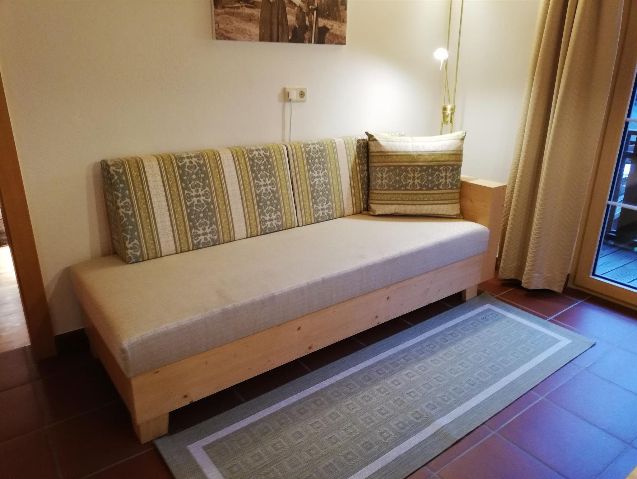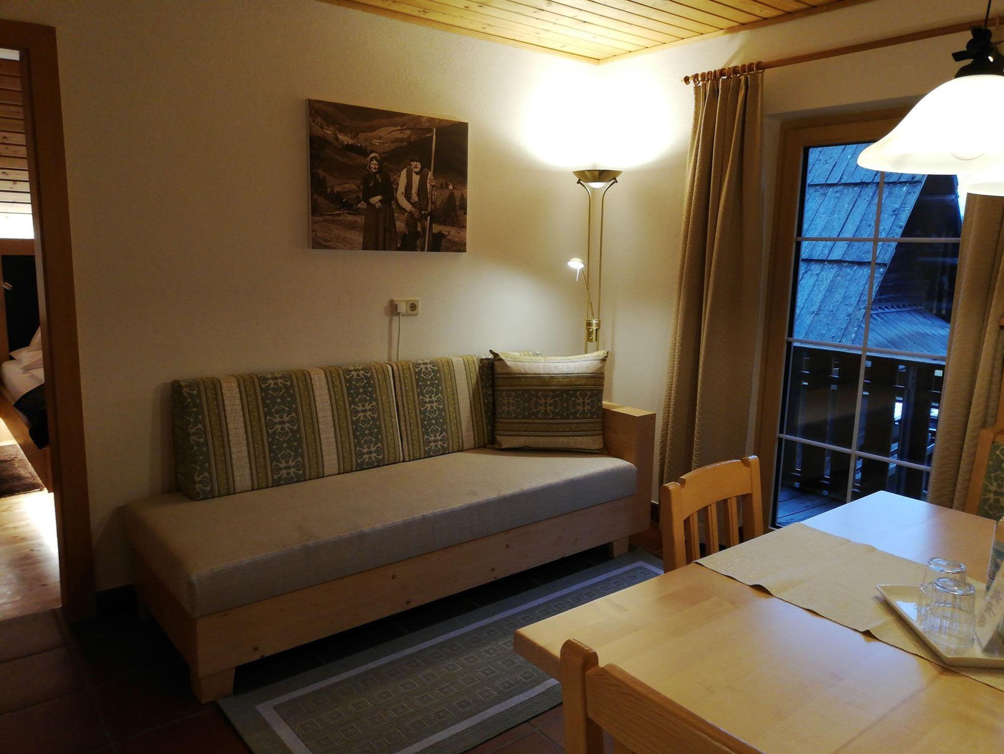 Wunderschönes, 35m² Familienappartement aus heimischen Zirbenholz. Wohnschlafzimmer mit Doppelbett aus Zirbe, Zirbenkleiderschrank, Flexinno Couch (als Stockbett umwandelbar), 1 Cocktailsessel mit Zirbenholztisch, Flat-TV. Küchenzeile mit Geschirrspüler, Mikrowelle, Kühlschrank, Zweiplattenherd, gemütliche Zirbenessecke, Dusche/WC, Garderobe, Südbalkon und kostenloses W-Lan im gesamten Haus.