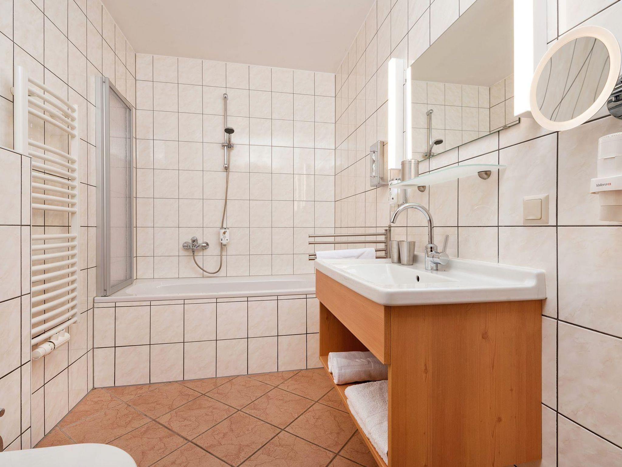 • Badezimmer mit Dusche, WC, Föhn und Kosmetikspiegel