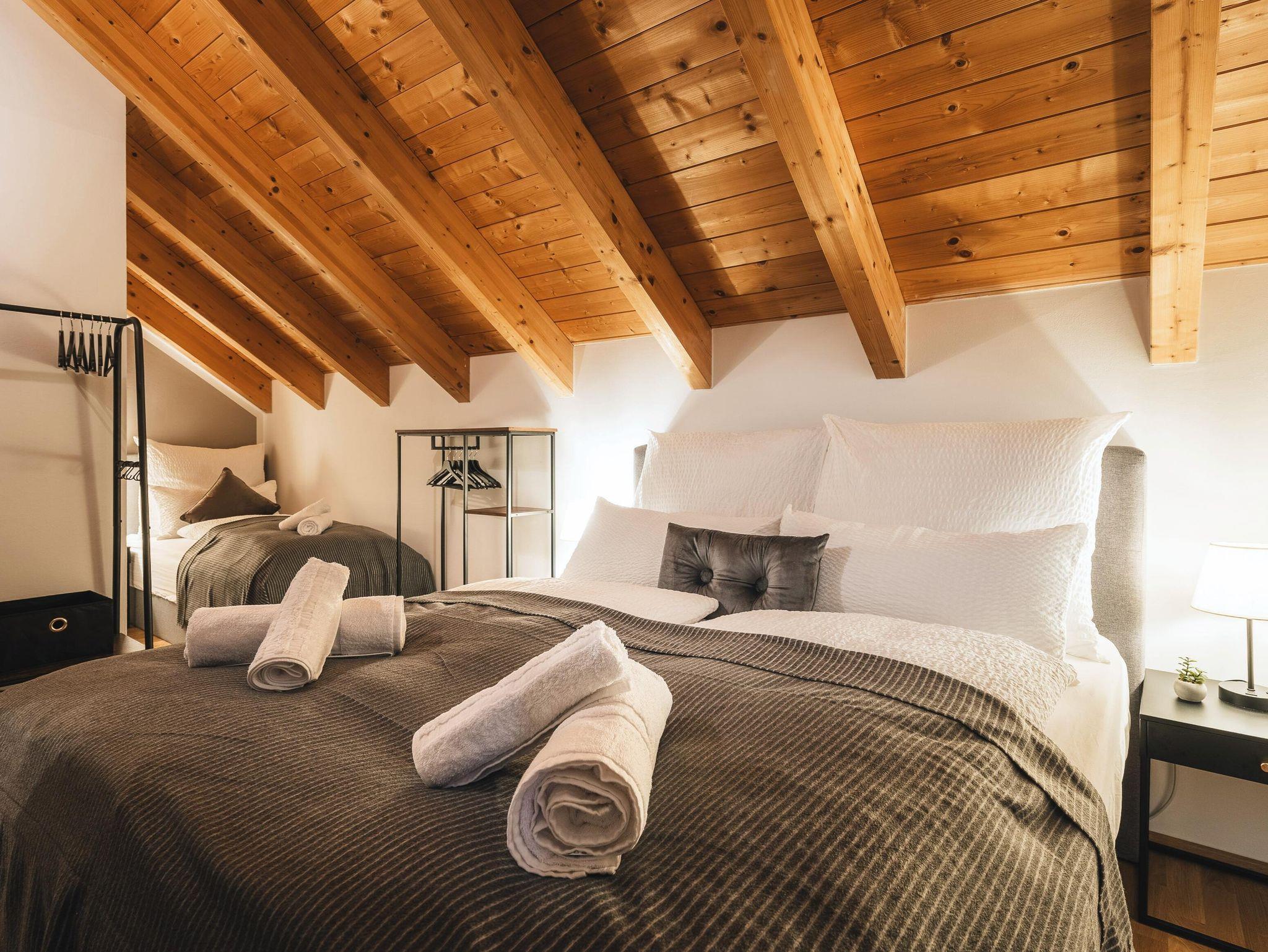 Es besitzt zwei separate Schlafzimmer und bietet somit genug Platz für bis zu 5 Personen. In allen Zimmern befinden sich hochqualitative und gemütliche Boxspringbetten (Zimmer 1: 1x Queensize / Zimmer 2: 1x Queensize + 1x Single). Des Weiteren gibt es zwei Bäder mit Dusche, ein separates WC sowie eine herrliche Eck-Terrasse mit großem Garten. Hier könnt ihr euren ereignisreichen Tag am Berg ideal Revue passieren lassen.