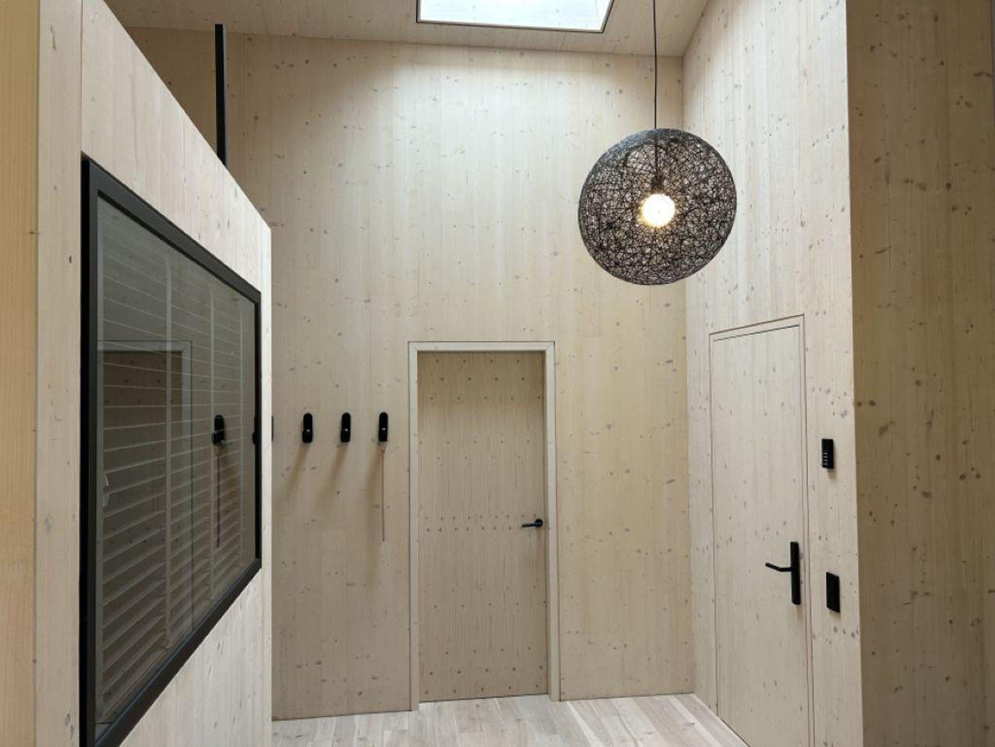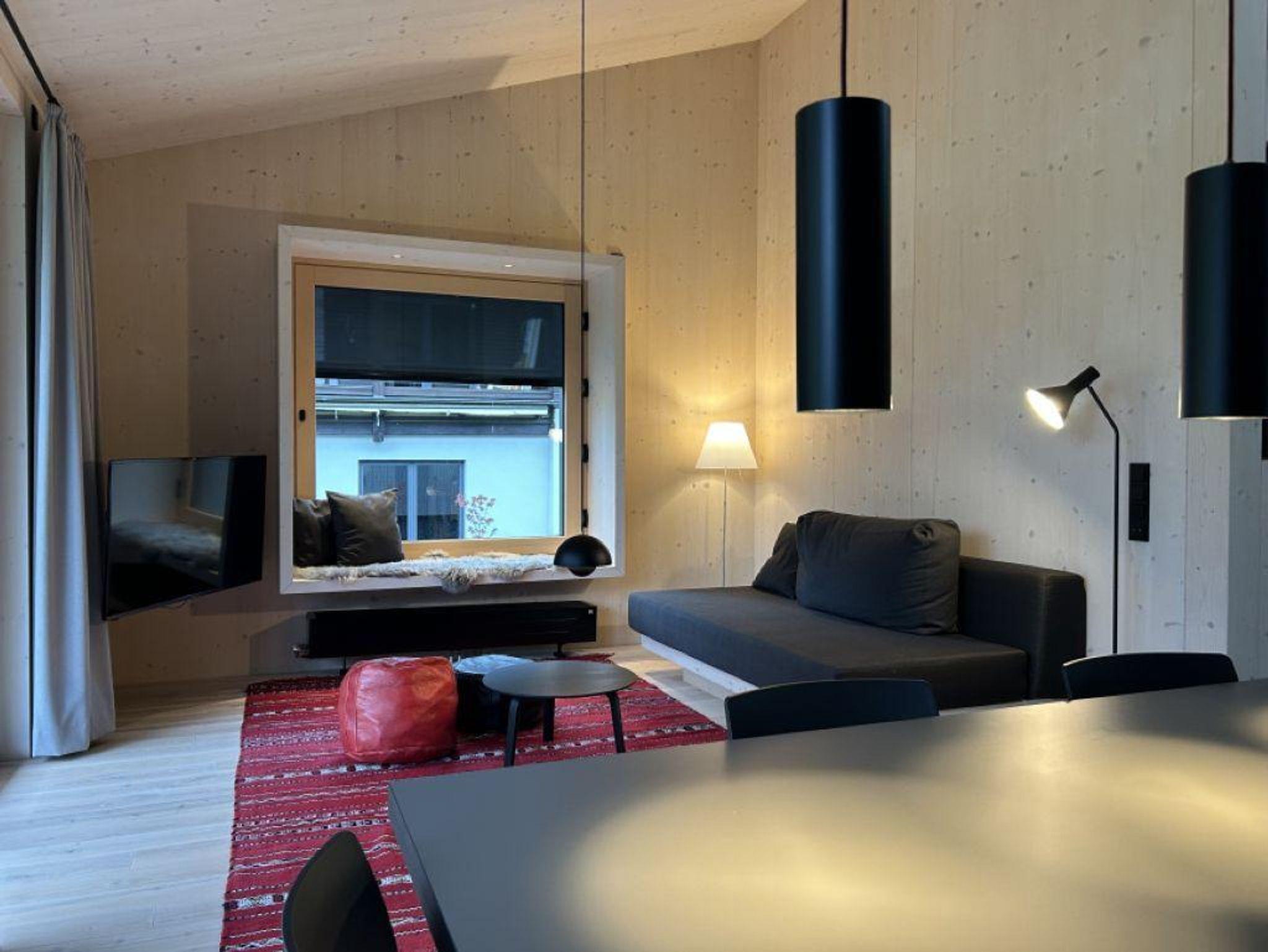 Helle Räume, große Fensteröffnungen und Balkone verbinden die Wohnungen mit der Landschaft. Natürliche Materialien, schöne Details, heimisches Holz, flauschige Stoffe und atmosphärische Beleuchtung sorgen für ein behagliches Ambiente.