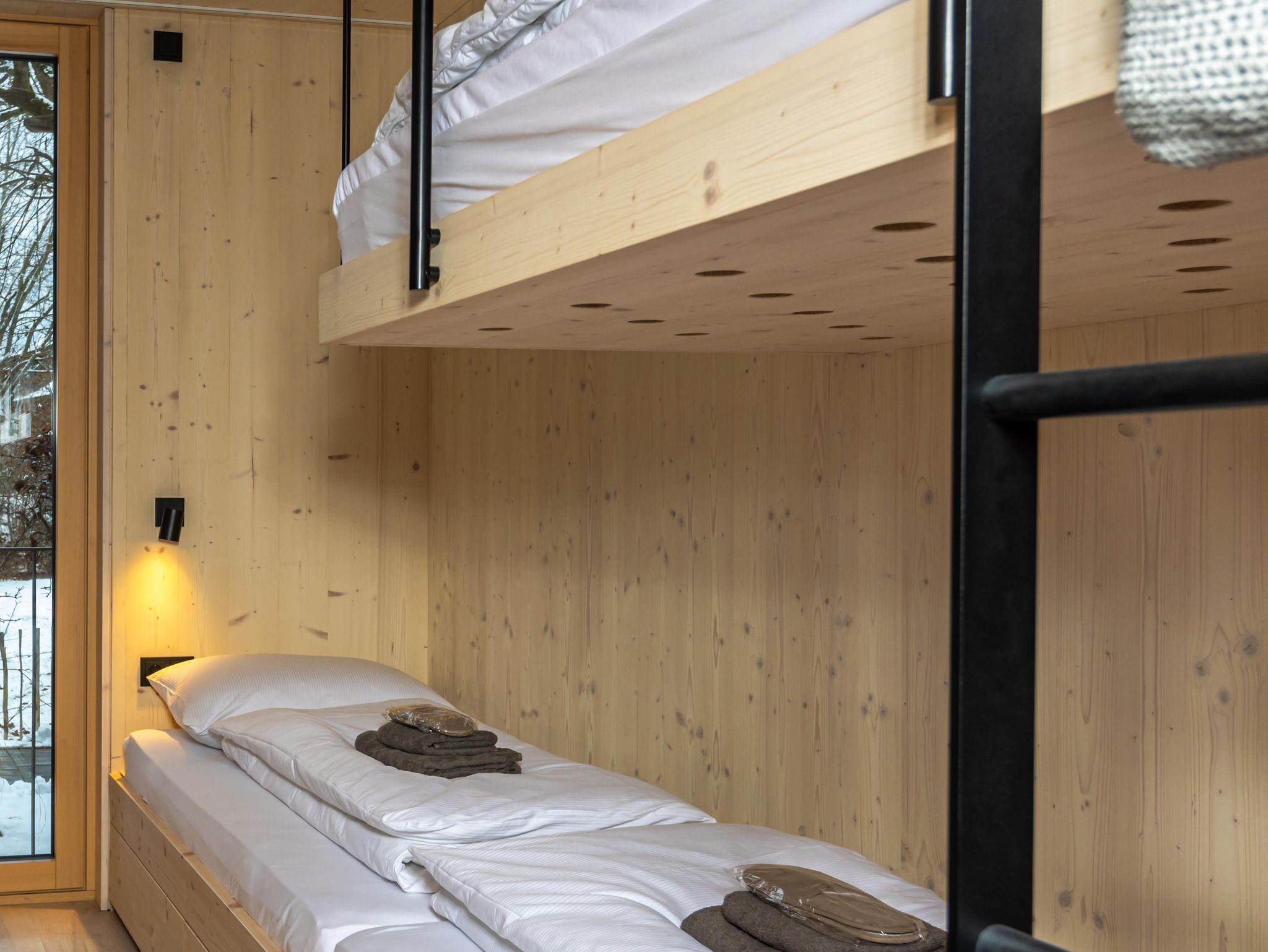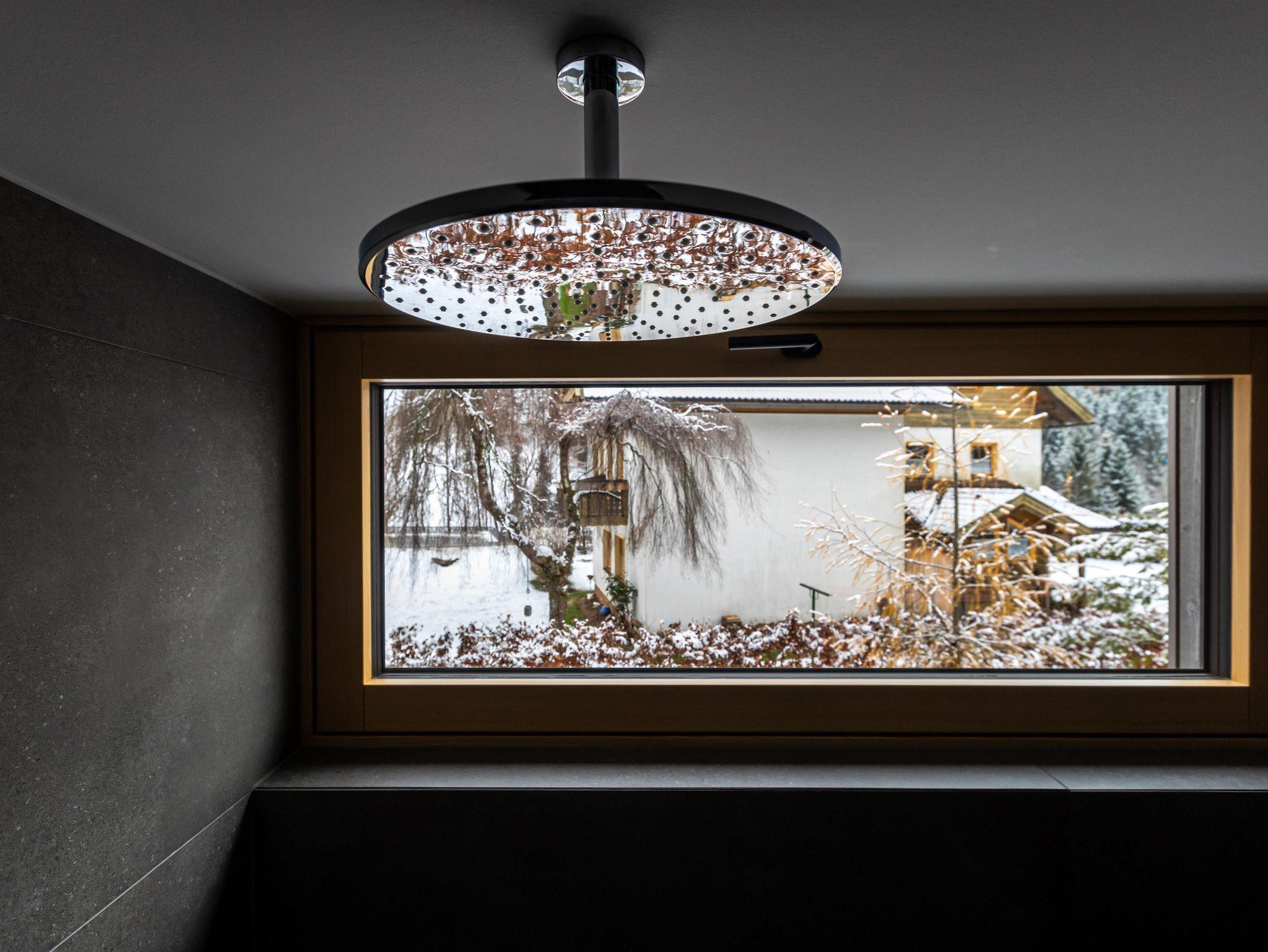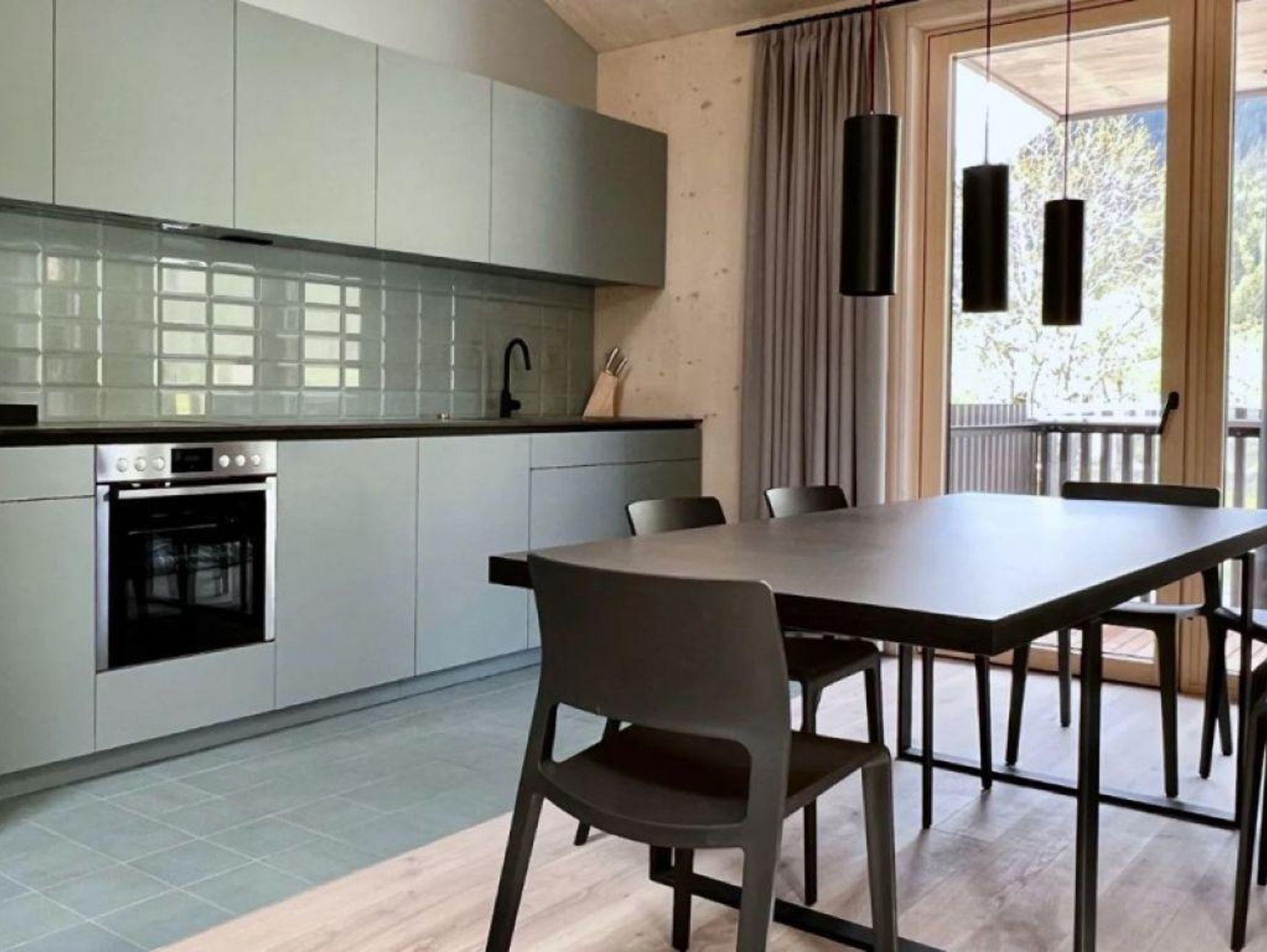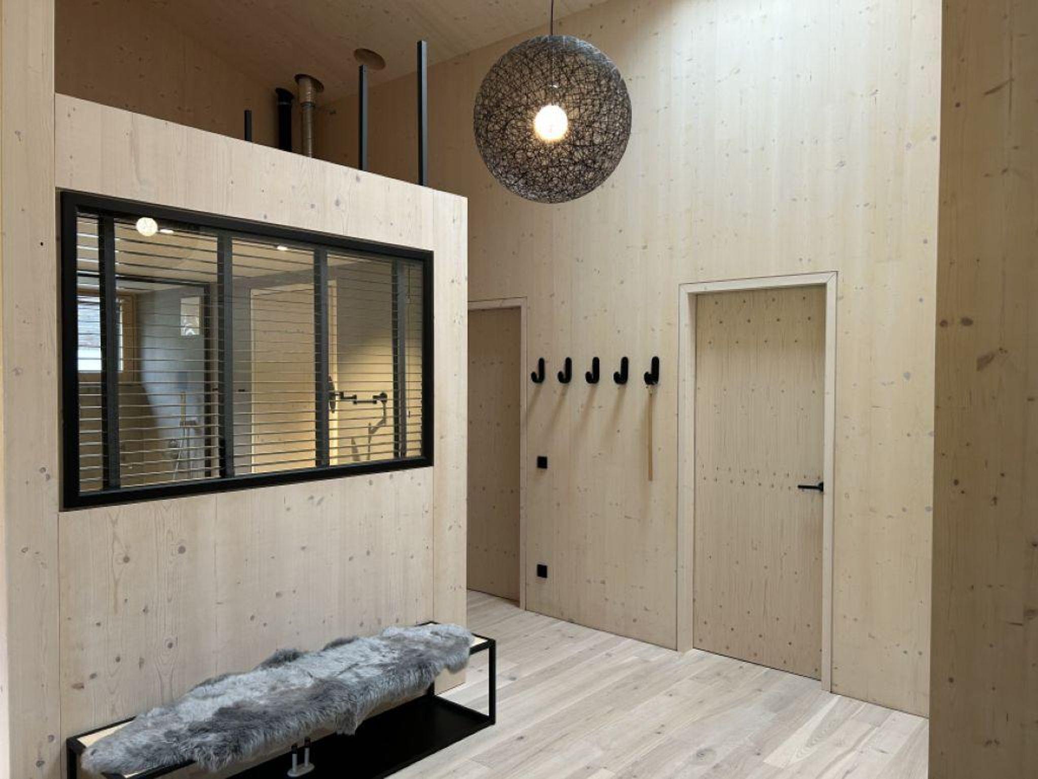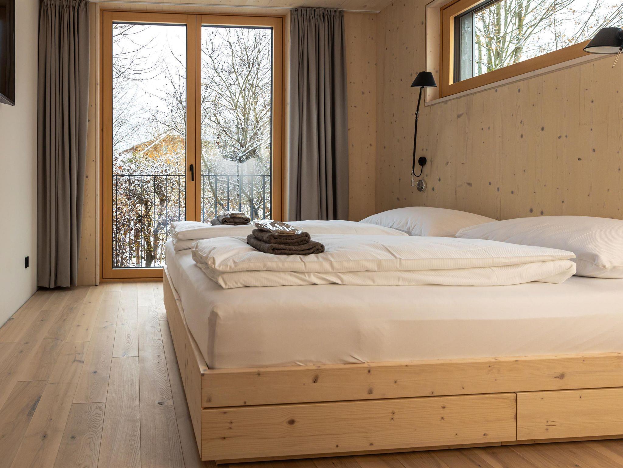 Das Interior-Design der Wohnbereiche ist in warmen Erdtönen gehalten und mit natürlichen Materialien gestaltet. Boden, Decke und Fenster sind in Echtholz ausgeführt. Die Küchennische ist in frischem Quellwassergrün gehalten und öffnet sich einladend zum Wohnbereich. Ein Kaminofen sorgt bei kühlen Temperaturen für behagliches Knistern.