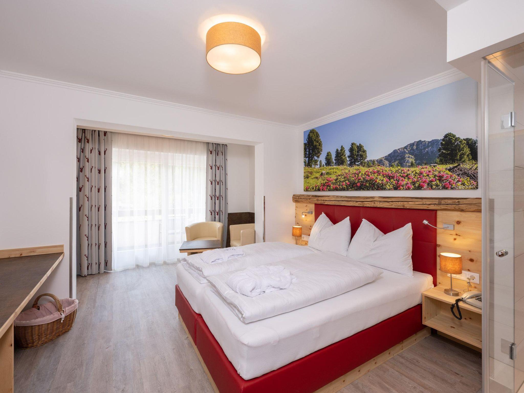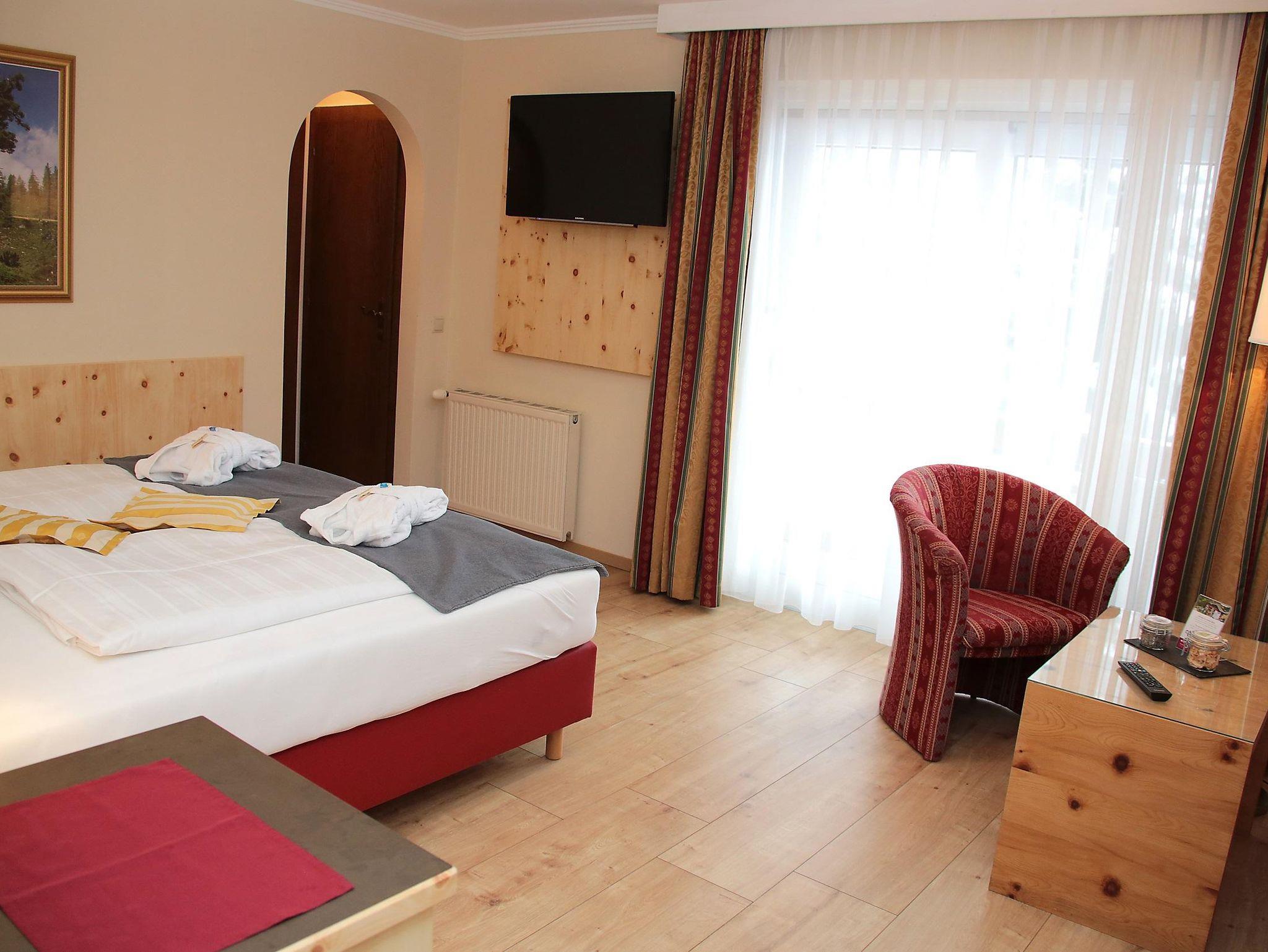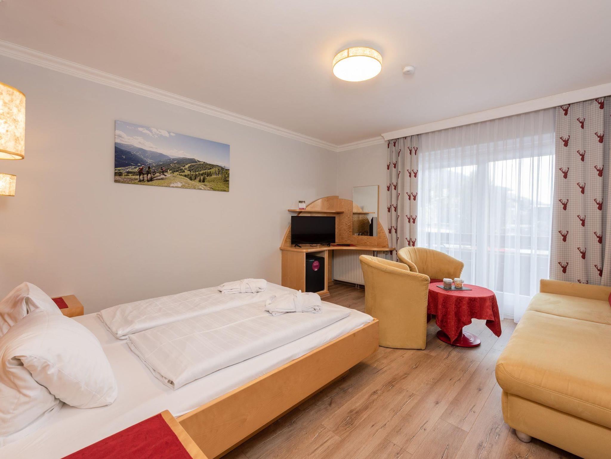 Junior Suite Sonnwiesen, Ca. 37 m² (für 2 bis 4 Personen) Gemütlicher Schlafraum und Wohnecke - abtrennbarer zweiter Schlafraum, 2 Kabel-TV´s, Safe, Badezimmer mit Badewanne und WC, Kosmetikspiegel, Föhn, Bademantel, Wellness-Korb, GRATIS WLAN