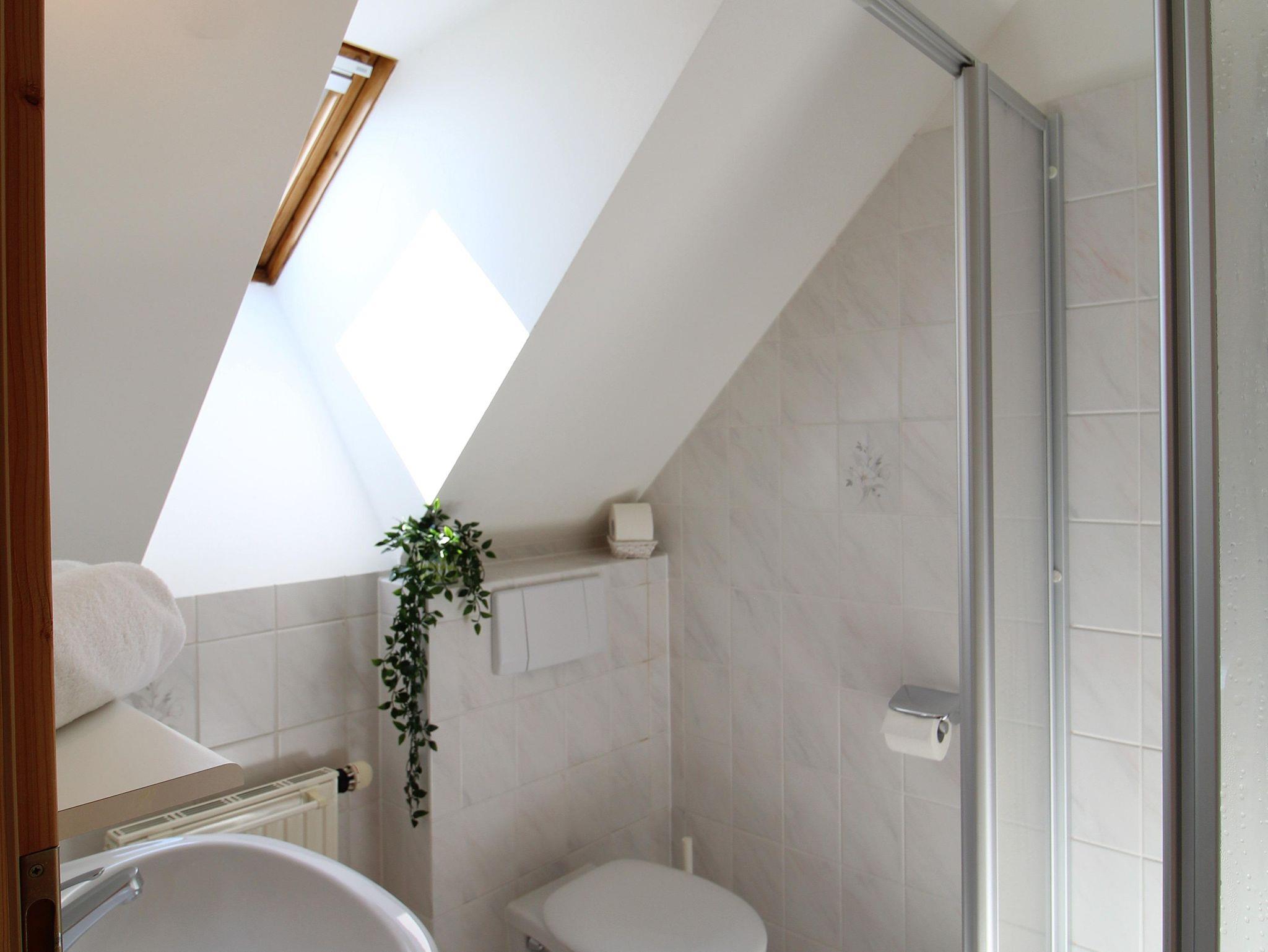 Das Bad bietet Ihnen eine Dusche und ein Waschbecken sowie ein separates WC.