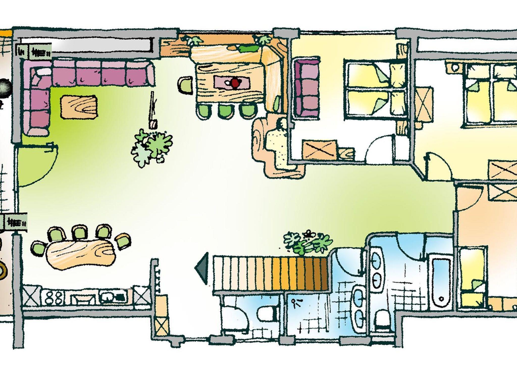3 Getrennte Schlafräume, 2 getrennte Bäder und getrenntes WC, sowie einen exklusiven Wohnraum mit Sitzecke und Esstisch XL.