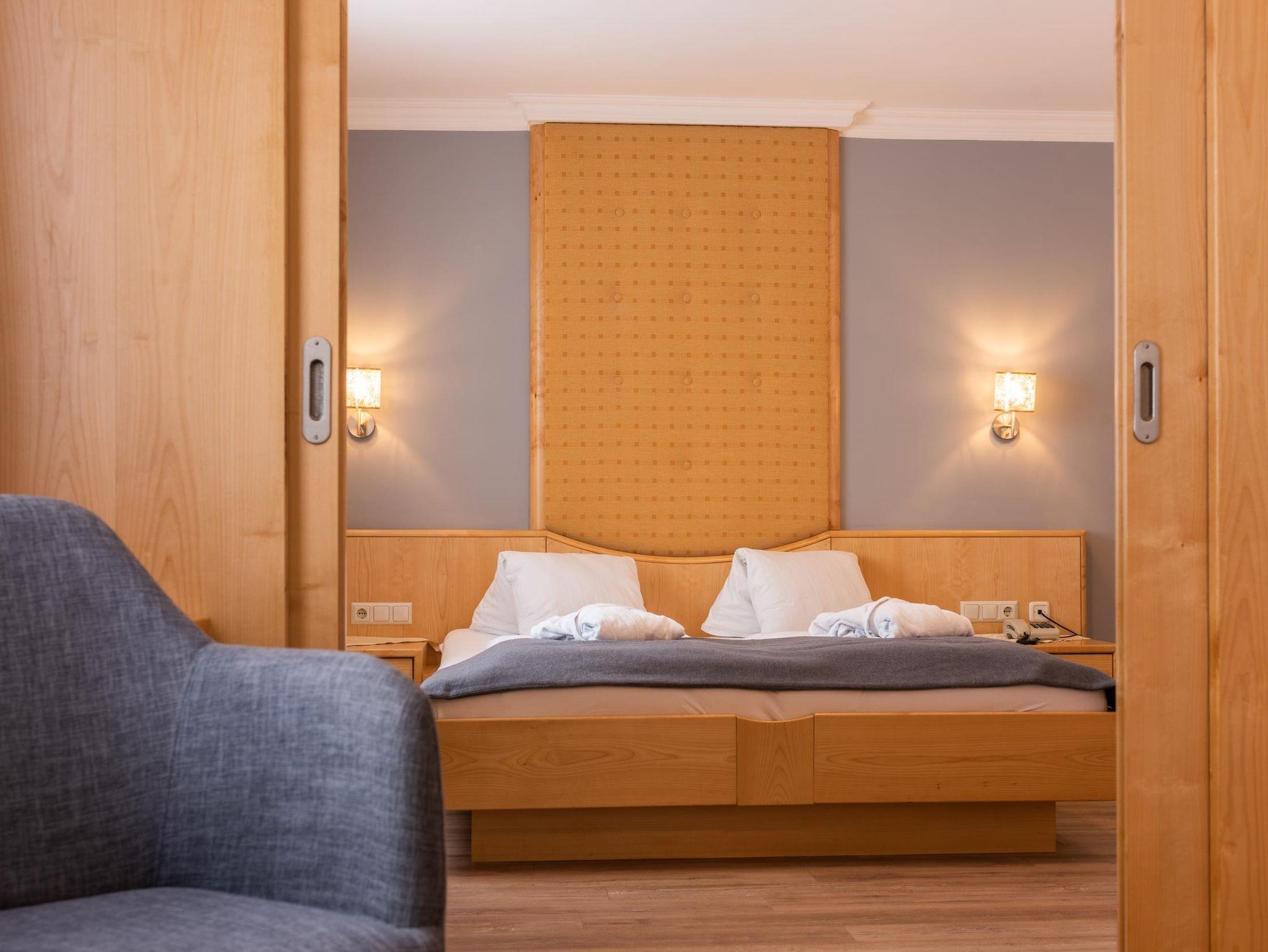 Junior Suite Sonnwiesen, Ca. 37 m² (für 2 bis 4 Personen) Gemütlicher Schlafraum und Wohnecke - abtrennbarer zweiter Schlafraum, 2 Kabel-TV´s, Safe, Badezimmer mit Badewanne und WC, Kosmetikspiegel, Föhn, Bademantel, Wellness-Korb, GRATIS WLAN