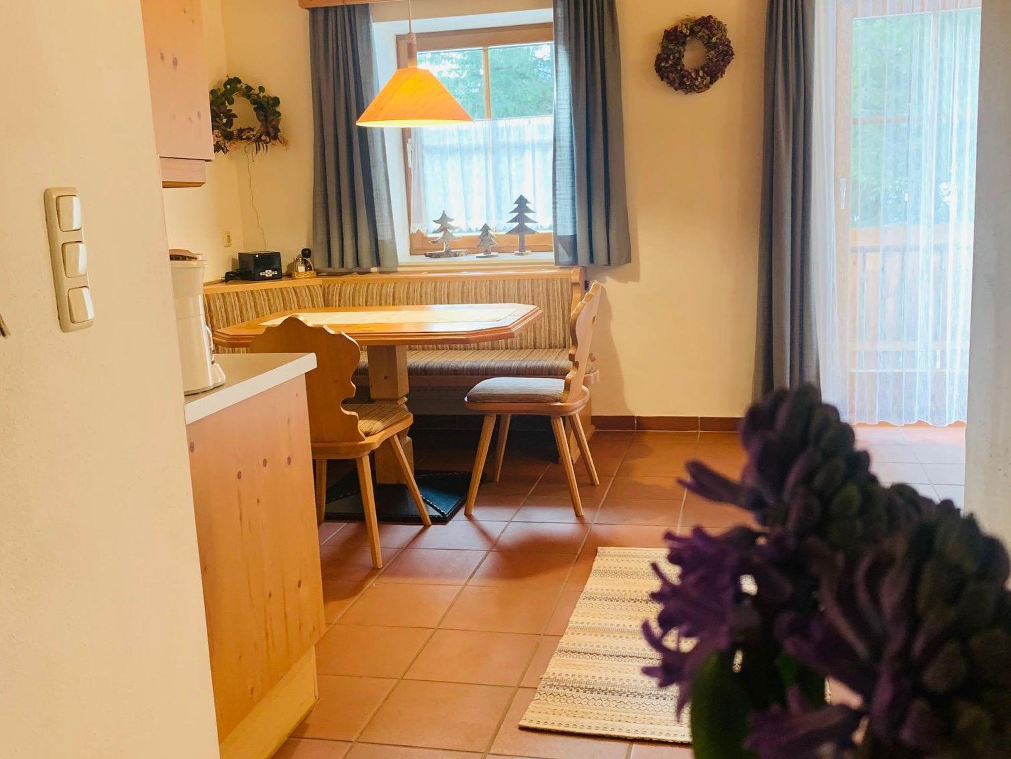 Appartement Lärche für 4 Personen (50 m²) im ersten Stock mit Balkon. Ausgestattet mit erstklassigen Möbeln in Massivholz verfügt das Appartement über zwei Schlafzimmer (ein Doppel- und ein Zweibettzimmer), ein Badezimmer mit Dusche und WC, einen großen Wohnraum mit Couch (auch als Einzelbett verwendbar), Relax-Sessel, SAT-TV, Radio, gratis WLAN, einer gemütlichen Eckbank und einen Küchenblock mit Kühlschrank, Geschirrspüler, Mikrowelle, Kaffeemaschine, Toaster und Kochherd.