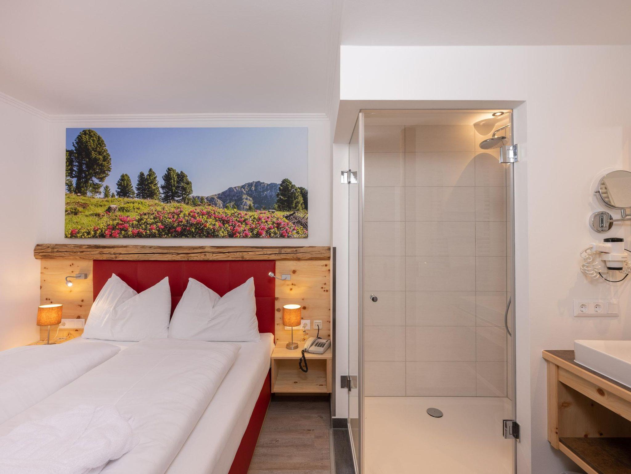 Doppelzimmer Zirbe-Birke Ca. 22 m² (für 1 bis 2 Personen), Ostbalkon oder Loggia, Gemütlicher Schlafraum und Wohnecke, Safe, Badezimmer mit Dusche und WC, Kosmetikspiegel, Föhn, Bademantel, Wellness-Korb, GRATIS WLAN