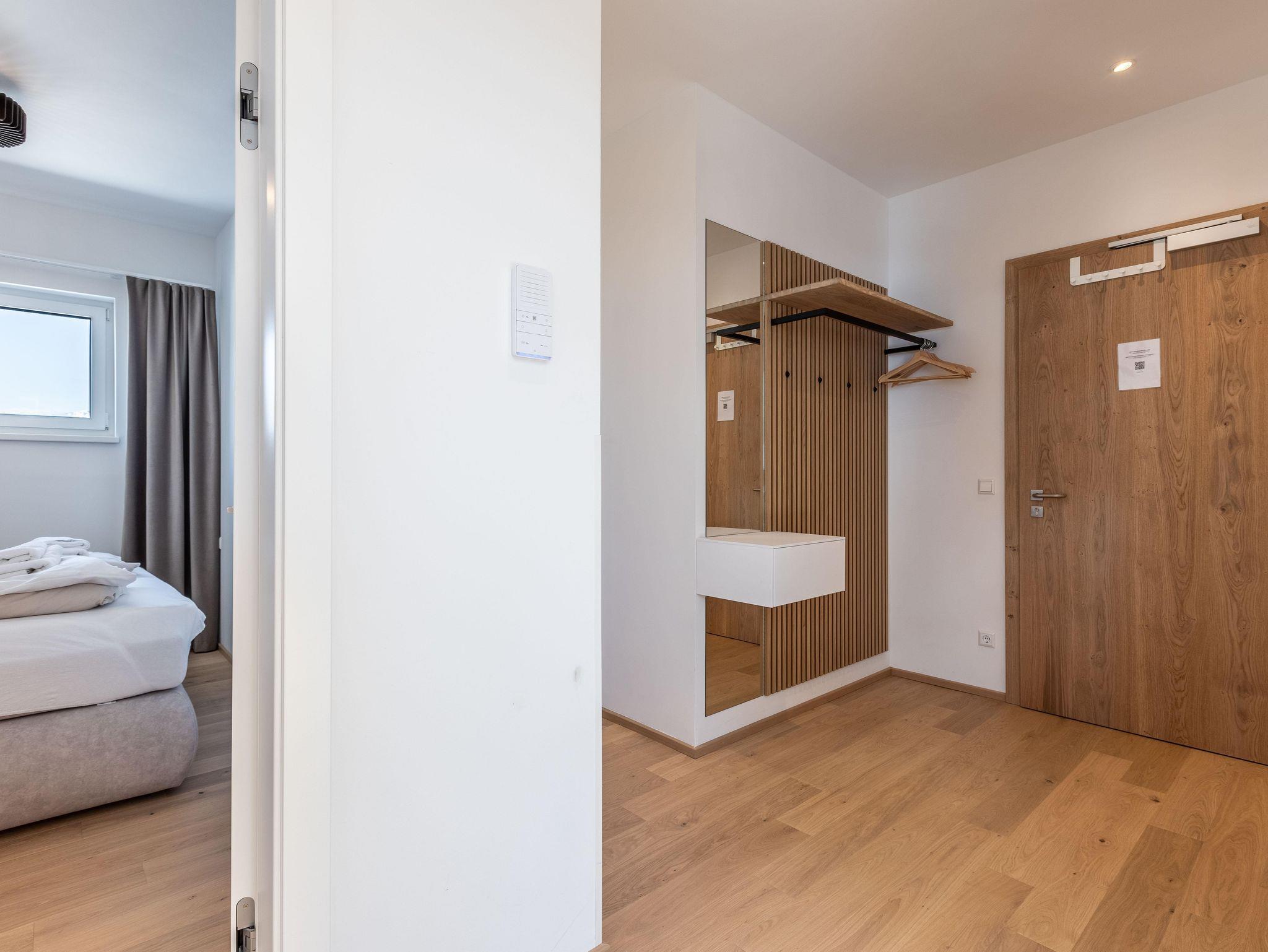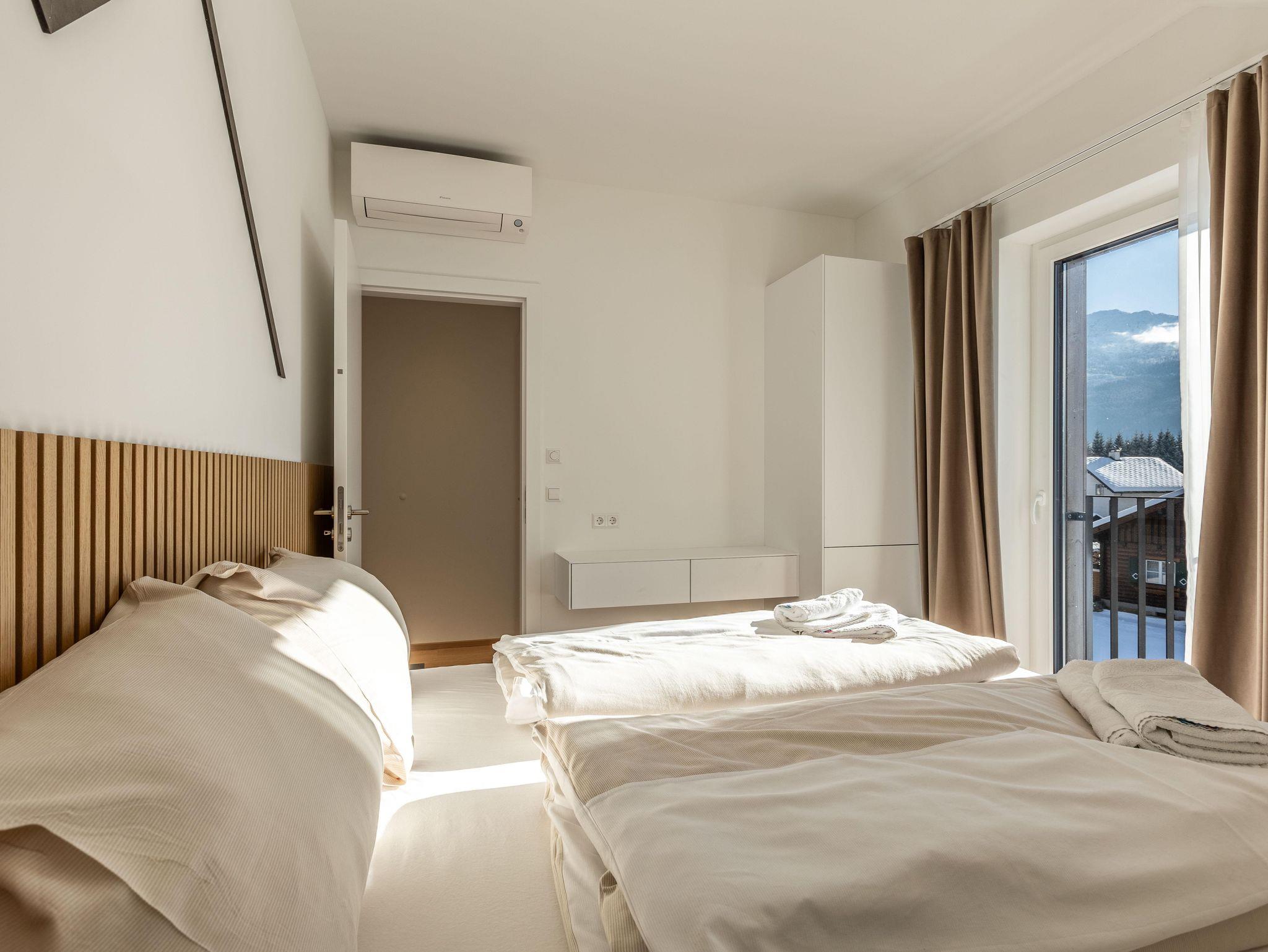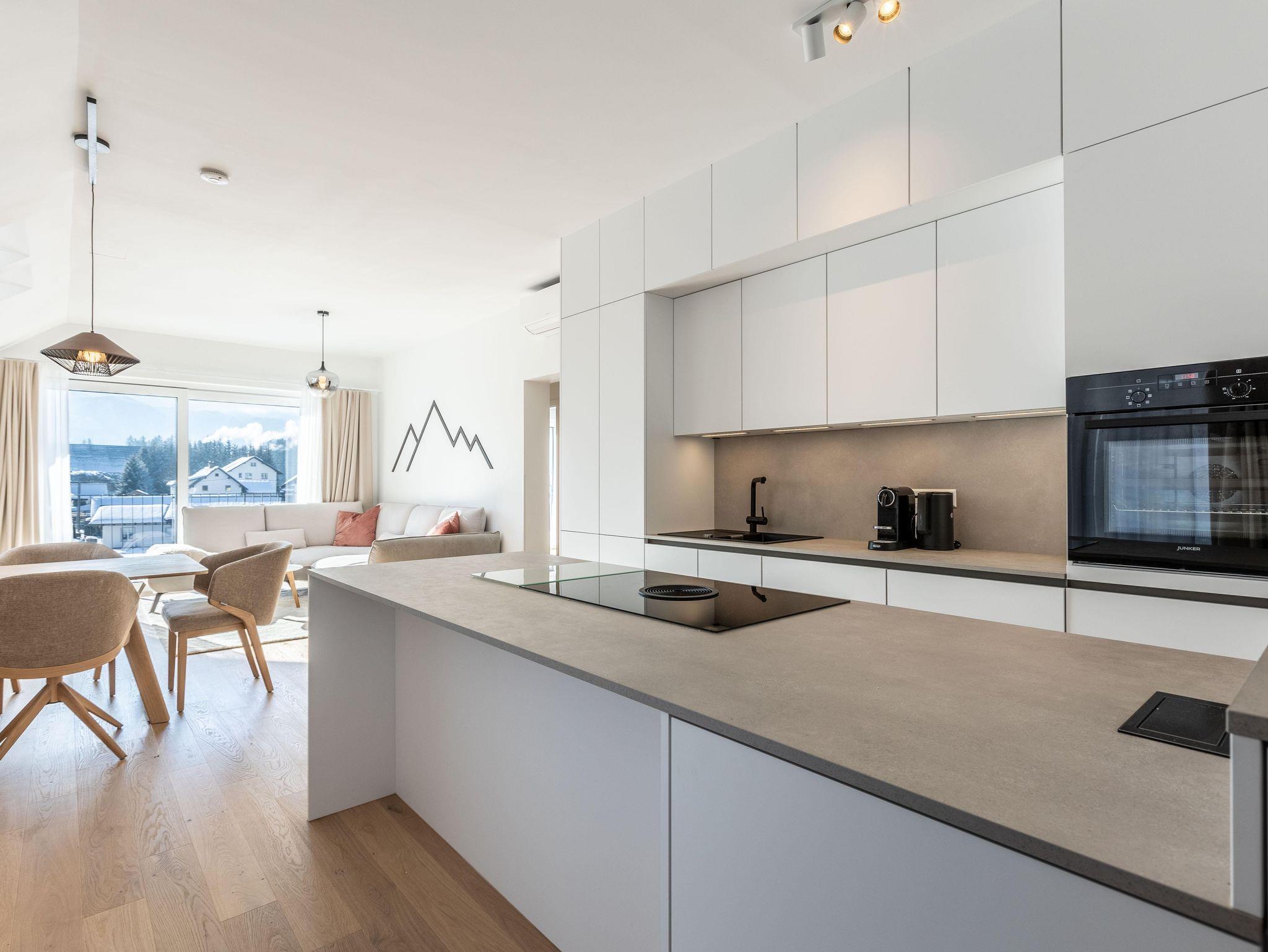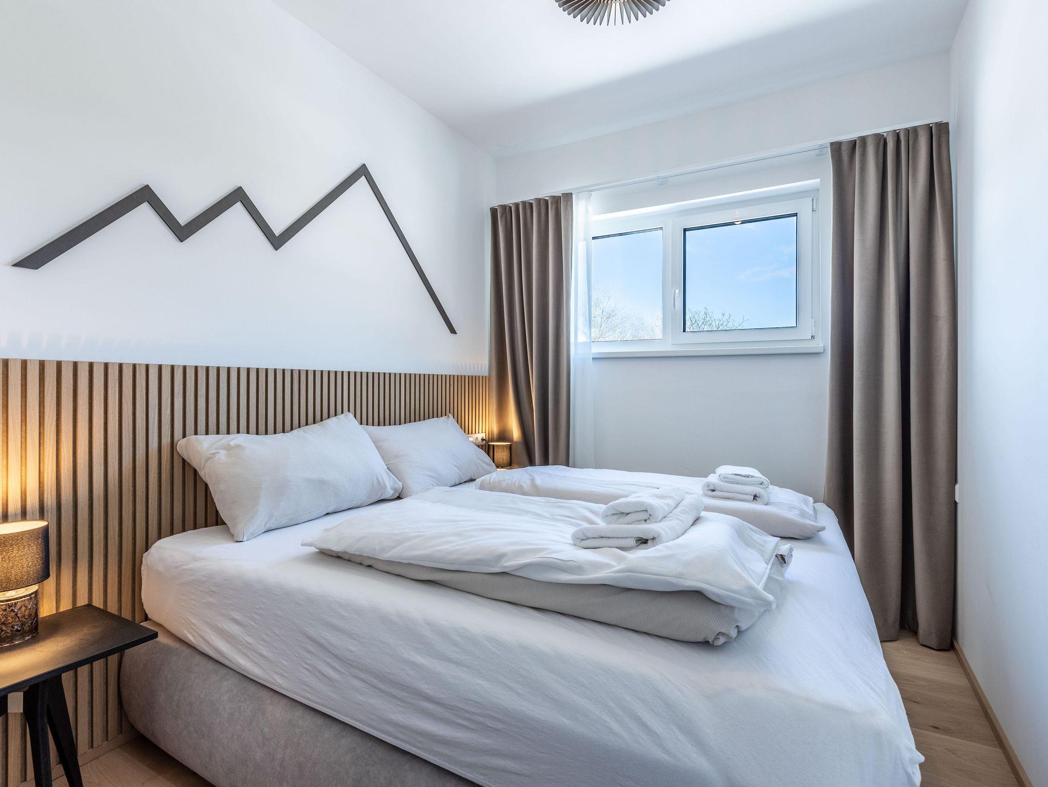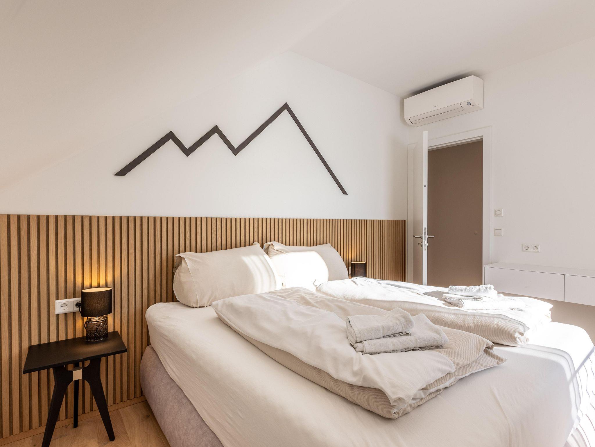Suite Delight ist die größte Wohnung im Alpine Suite Spot mit eigener Terrasse und Sauna. Es gibt drei Schlafzimmer mit Doppelbett, sowie eine Schlafcouch im Wohnzimmer. Die Küche ist vollausgestattet. Es gibt zwei Badezimmer.