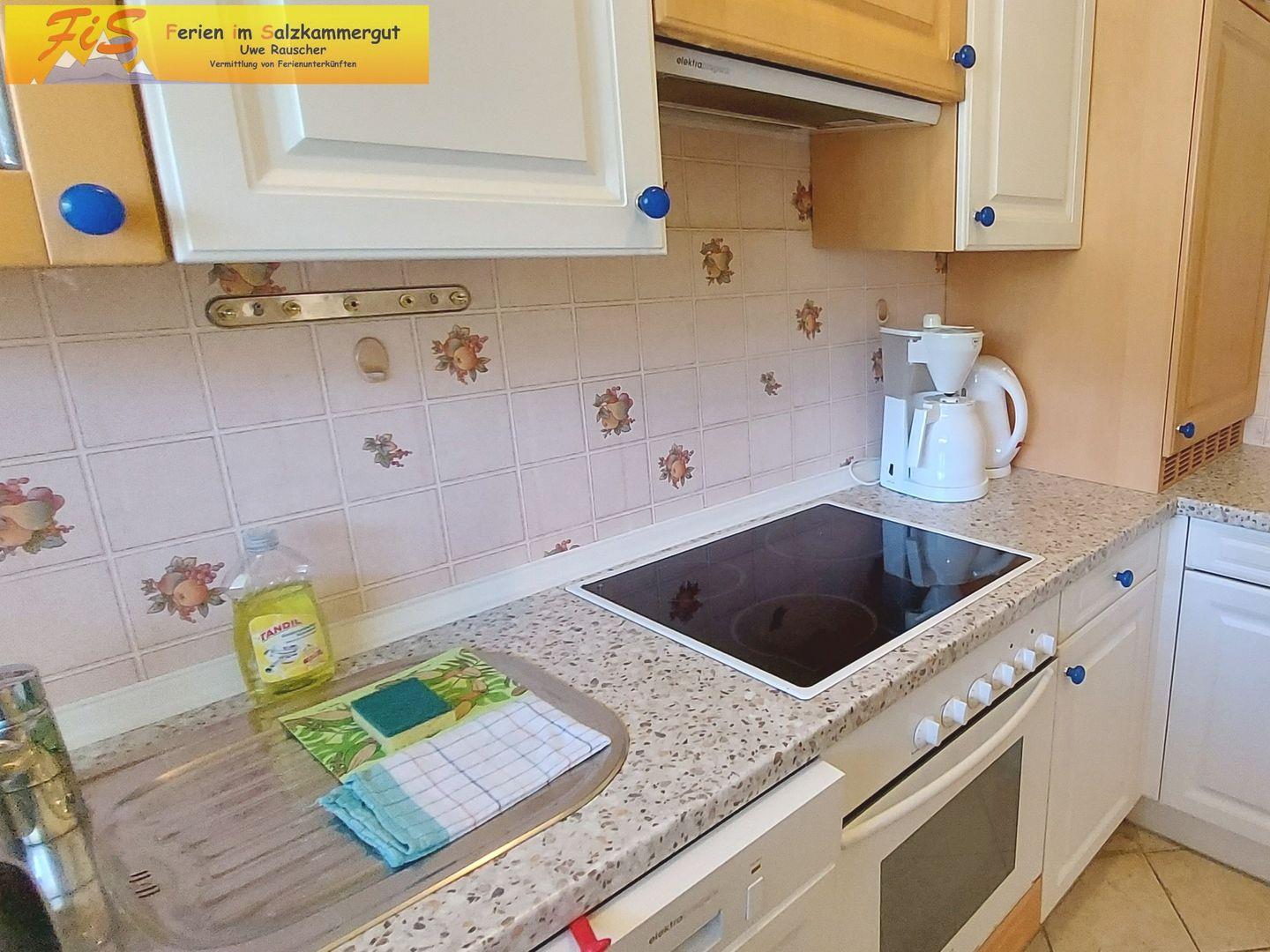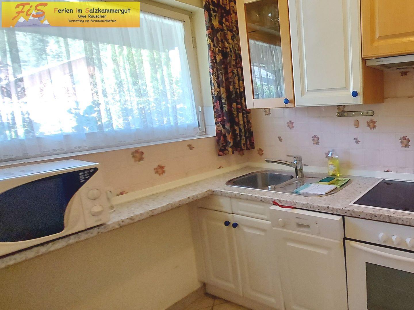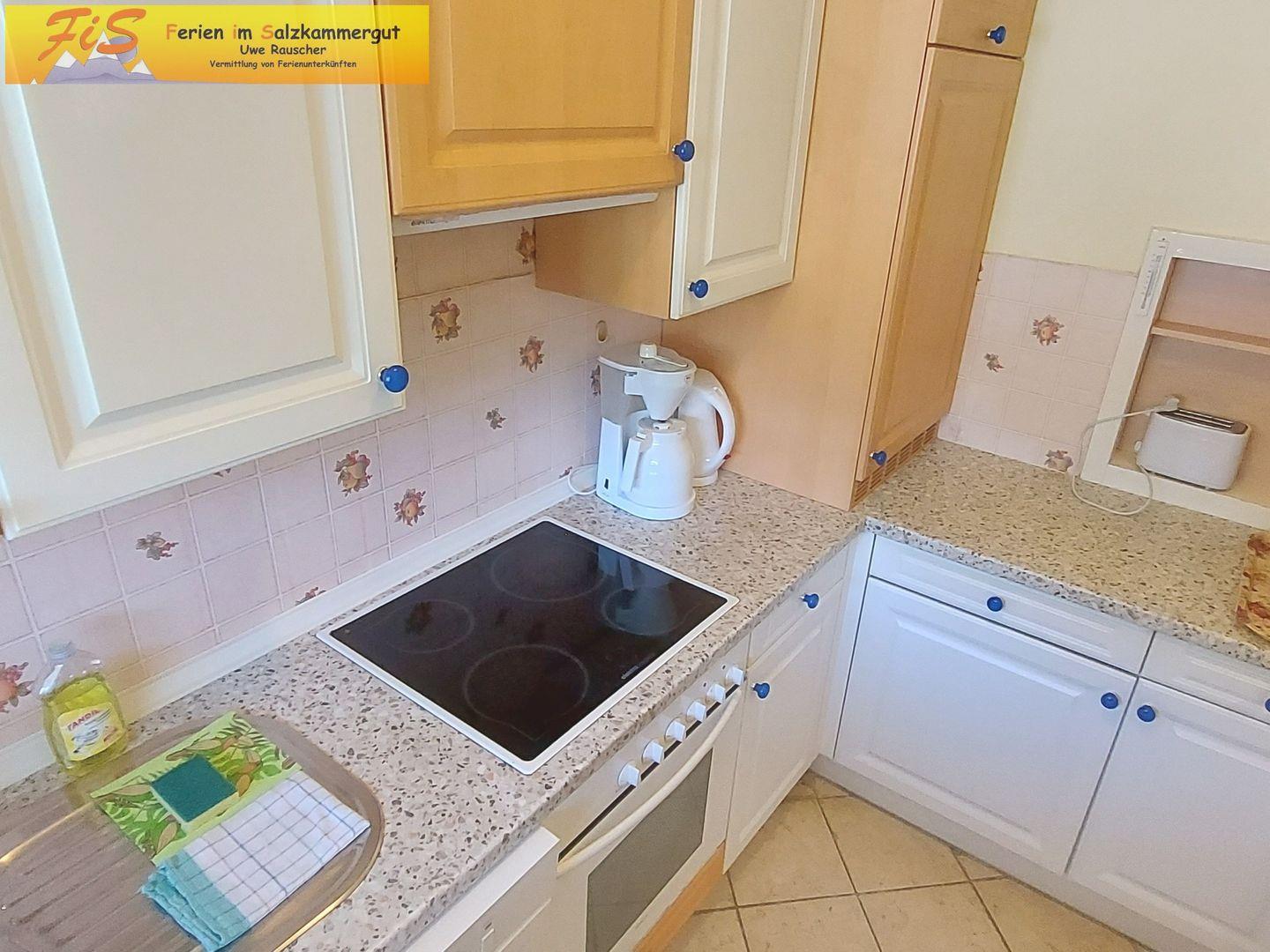 Die geschlossene Küche verfügt über einen Herd mit vier Platten, Backofen, Mikrowelle, Kühlschrank mit Gefrierfach, Geschirrspüler, Kaffeemaschine, Wasserkocher, Toaster sowie umfassende Küchenutensilien, Geschirr und Besteck. Der separate Essbereich mit Esstisch bietet ausreichend Platz für geselliges Beisammensein.