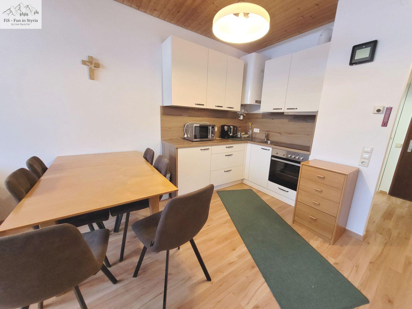 Die Grimmingsuite besticht durch einen offenen Wohnraum, der eine einladende Atmosphäre ausstrahlt. Die voll ausgestattete Küche, die sich harmonisch in den Wohnbereich einfügt, lädt zum Kochen und Verweilen ein. Freundliche Küchenutensilien, ein Herd, Mikrowelle und Kühlschrank stehen bereit, damit Sie Ihre Lieblingsgerichte zubereiten können. Genießen Sie Ihr Essen am Esstisch, während Sie den atemberaubenden Ausblick auf die umliegenden Berge bewundern.