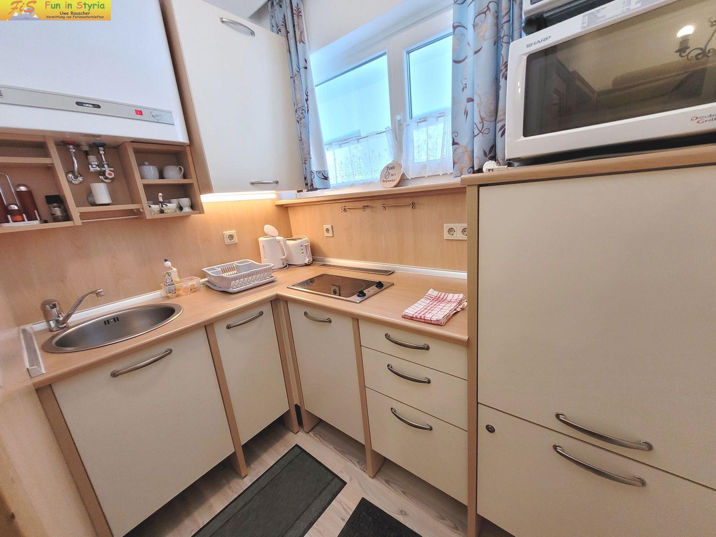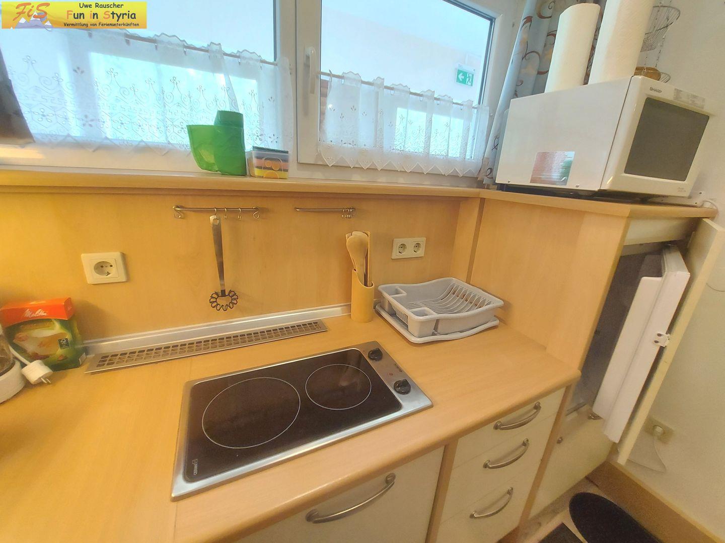 Die voll ausgestattete Küche, die als abgeschlossen konzipiert ist, ist mit allen notwendigen Küchenutensilien ausgestattet. Dazu gehören ein Herd mit zwei Platten, ein Kühlschrank mit Gefrierfach, eine Mikrowelle und eine Kaffeemaschine. Hier können Sie nach einem aktiven Tag Ihre Mahlzeiten zubereiten und am Esstisch im Essbereich gemeinsam genießen. Für zusätzlichen Komfort sorgt eine Dusche im Badezimmer, die durch moderne Badausstattung ergänzt wird.