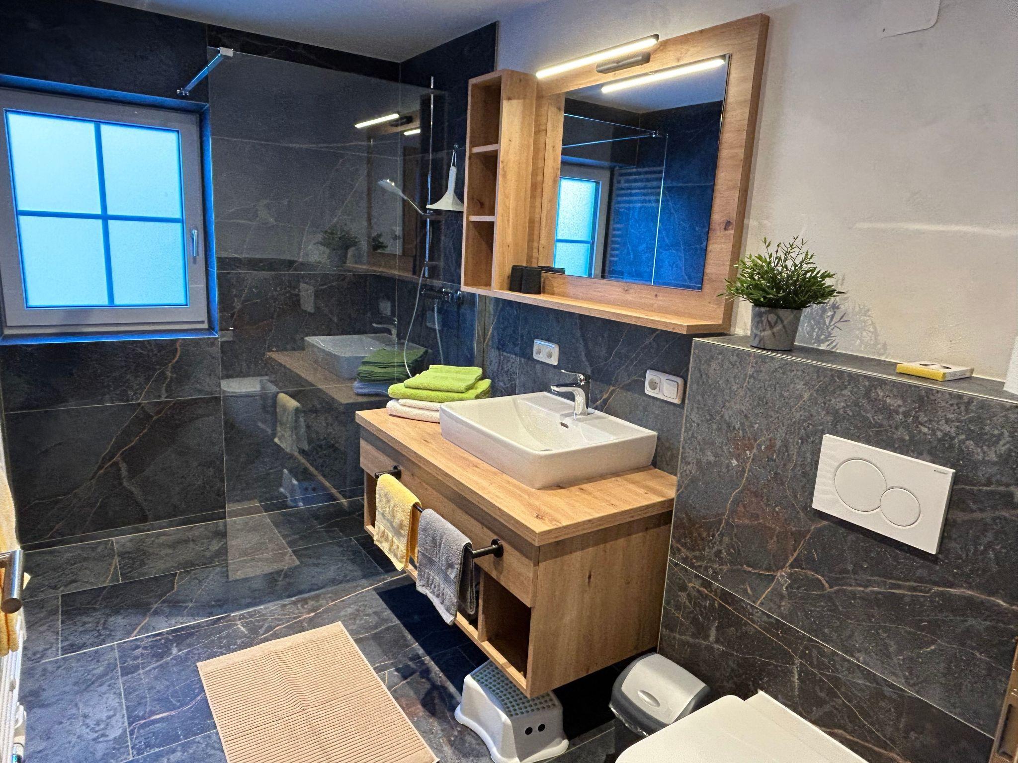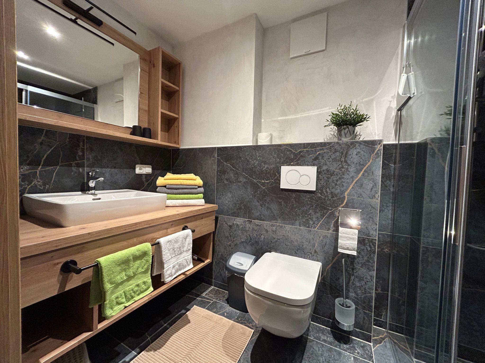 This is a completely newly built flat (first occupancy from winter 2025) and can accommodate up to 8 people. On 85m² (see plan, photos of the final furnishings will follow as soon as everything is ready) you will find everything you need to spend a pleasant holiday with your family or friends. Three bedrooms with double beds (+ 2 sleeping possibilities in the living room), two bathrooms and a large living room with well-equipped kitchen as well as the large terrace (27m²) with evening sun offer enough space for everyone! In the play corner in the hallway, young and old will find various games, puzzles, books etc. to play or even some friends who would like to play with you.