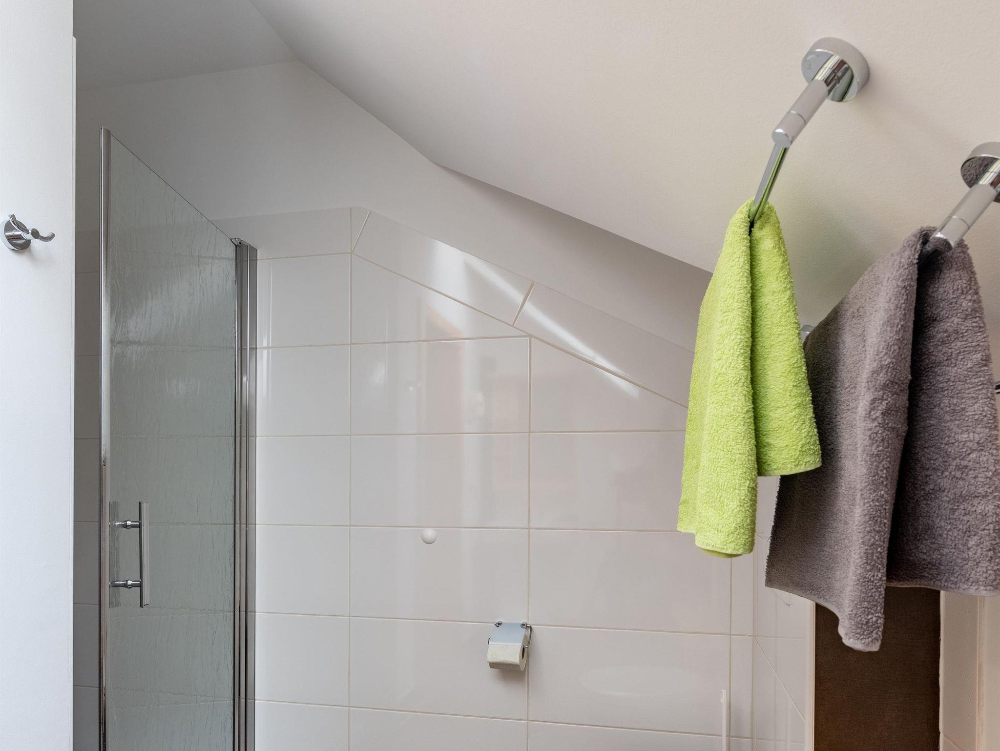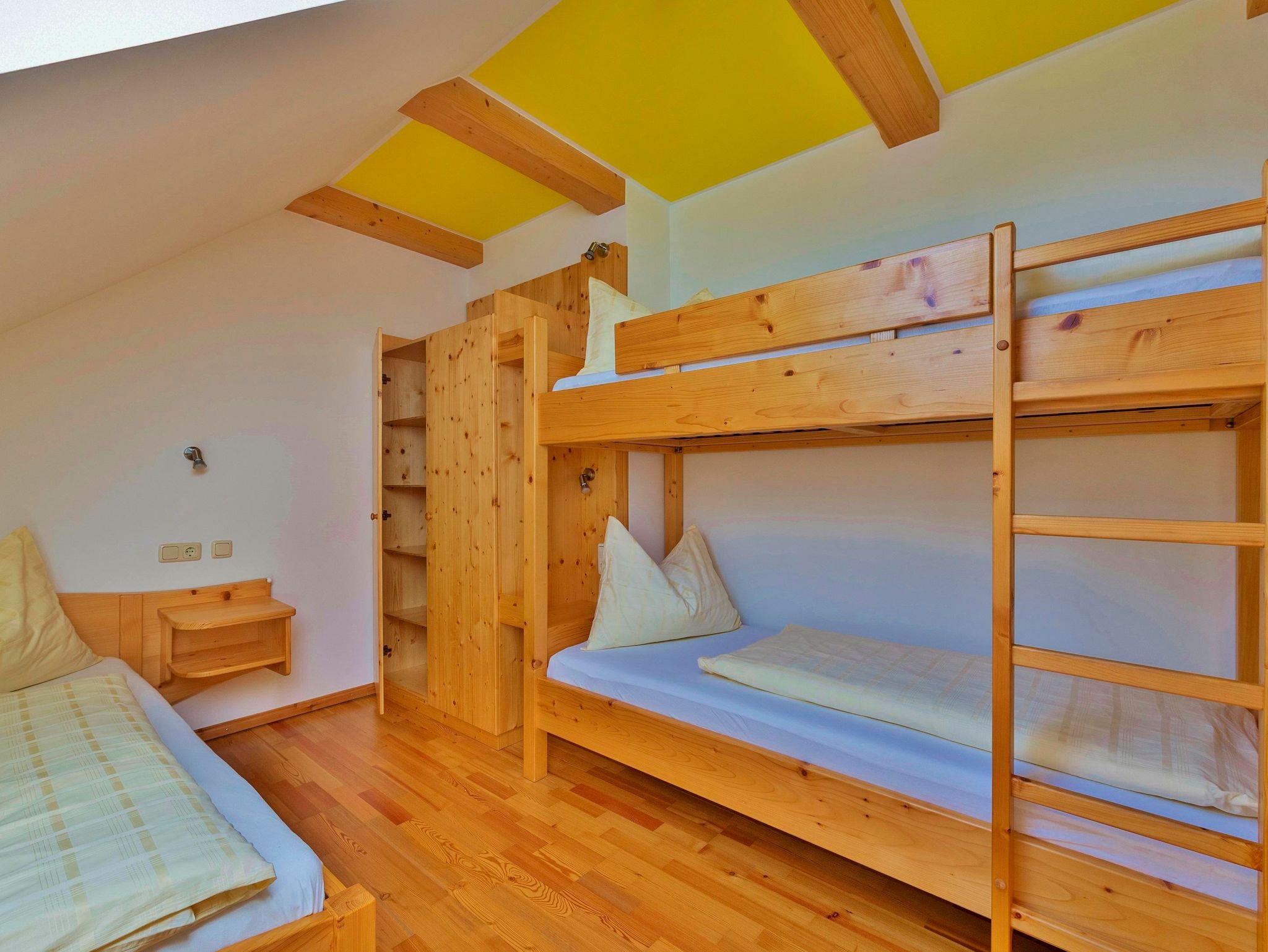Holztreppe ins Obergeschoß mit Gitter gesichert, 2 Schlafzimmer davon ein 3 Bettzimmer mit Stockbett, Dusche, WC