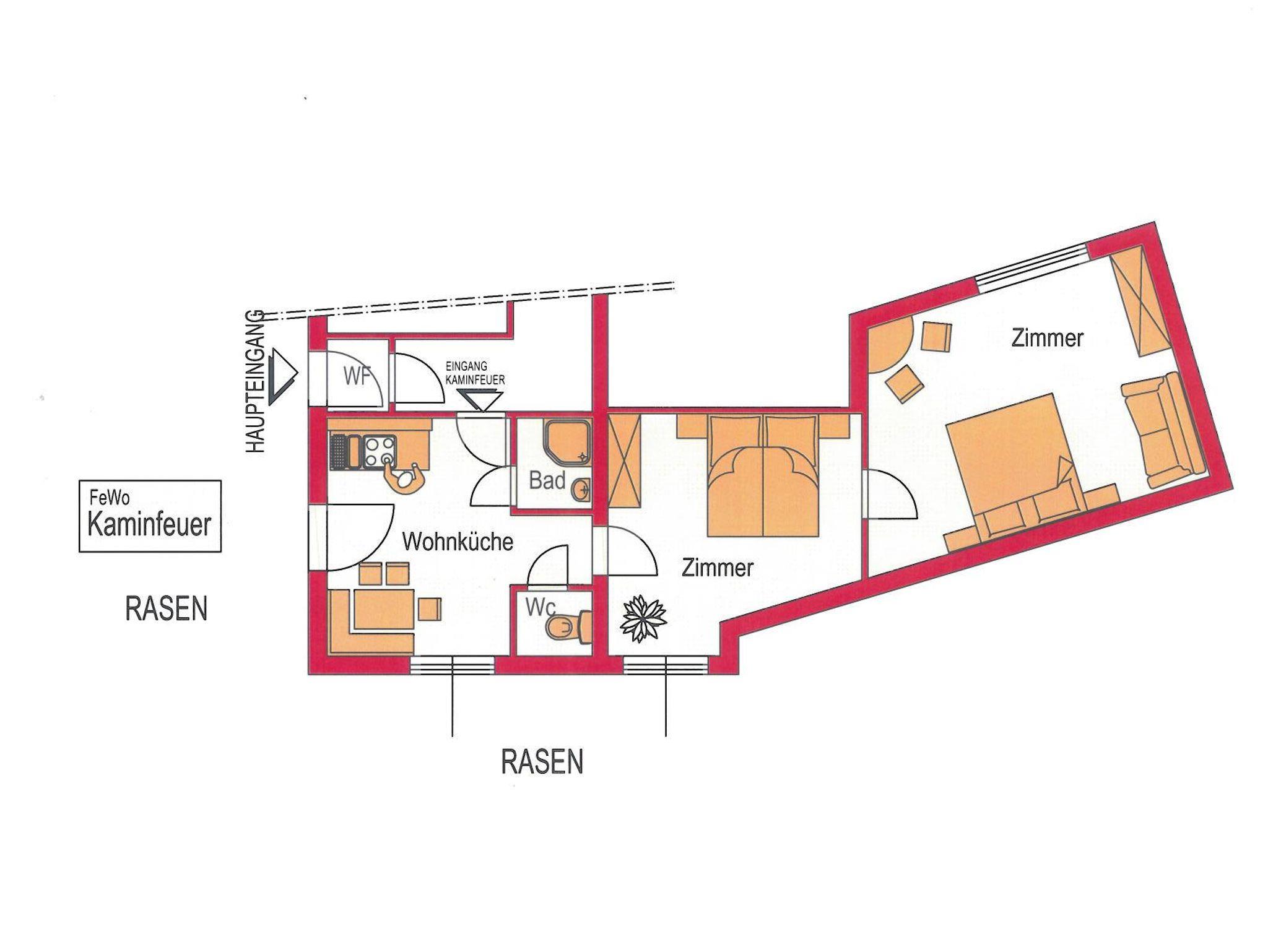 Wohnküche mit direktem Zugang zum eigenen Sitzgarten, Dusche, WC getrennt, 2 Schlafzimmer (Durchgehzimmer) mit je 2 Doppelbetten. Selbstgetischlerte Möbel verleihen eine angenehme Atmosphäre.
