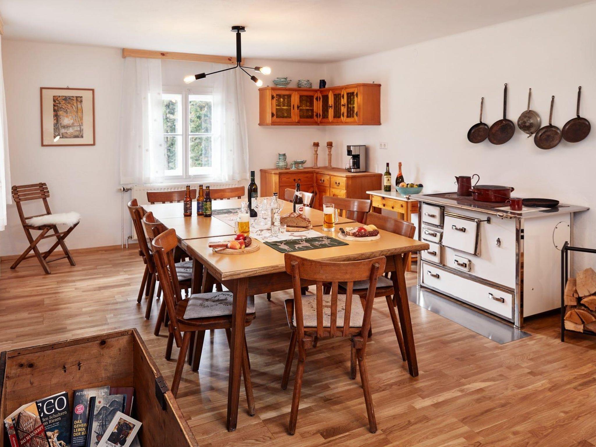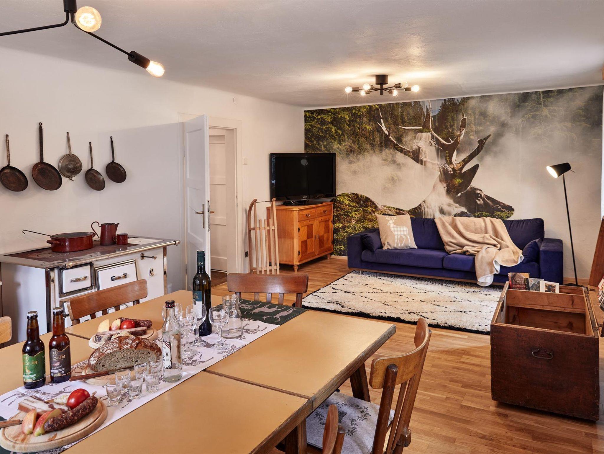 Gastfreundliche Stube mit TV, Holzherd für echtes Hüttenfeeling, Kaffeemaschine mit Kapseln, Kühlschrank und Couch.