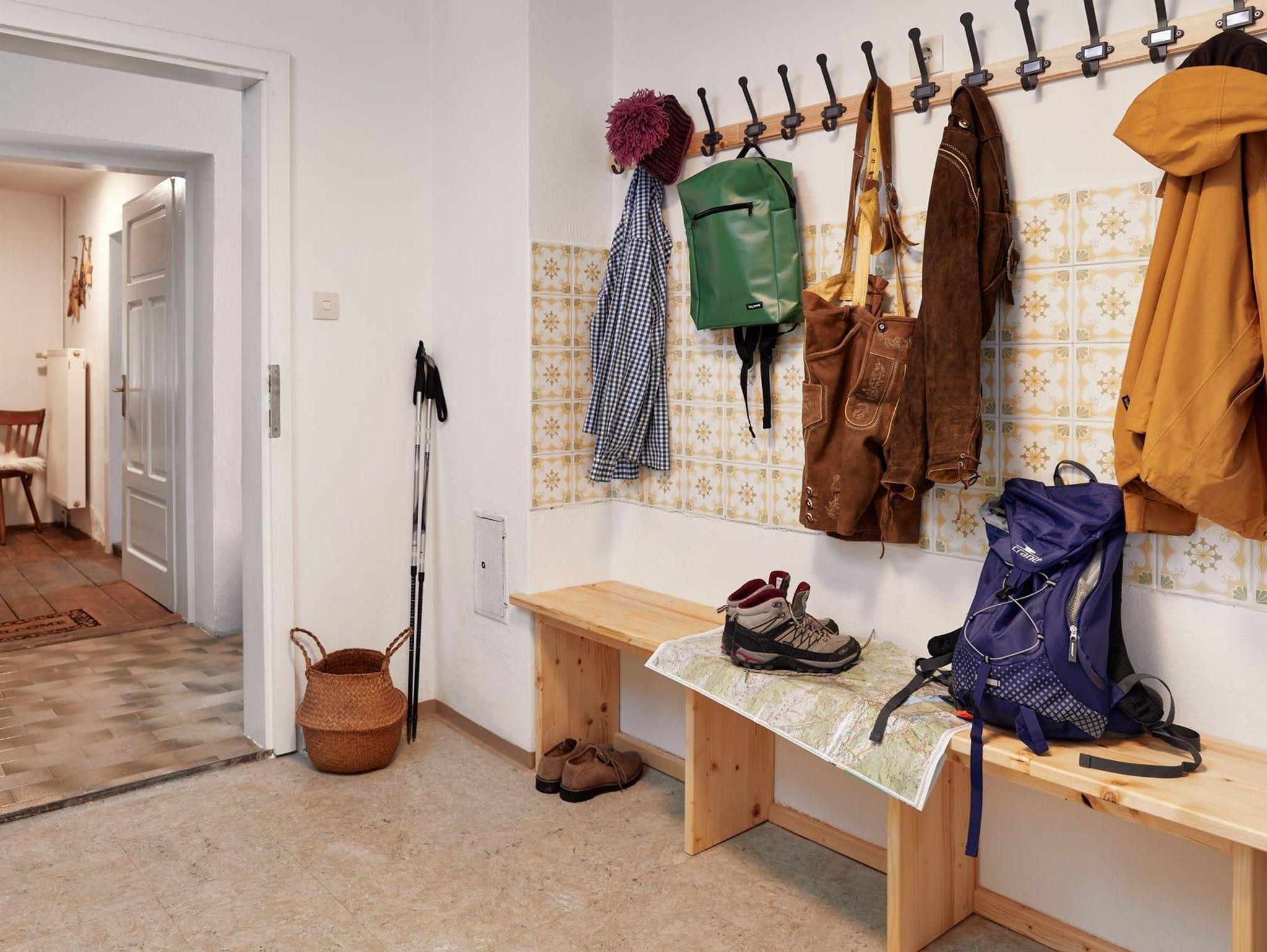 Großzügiger Garderobenraum mit Sitzbank aus Holz.