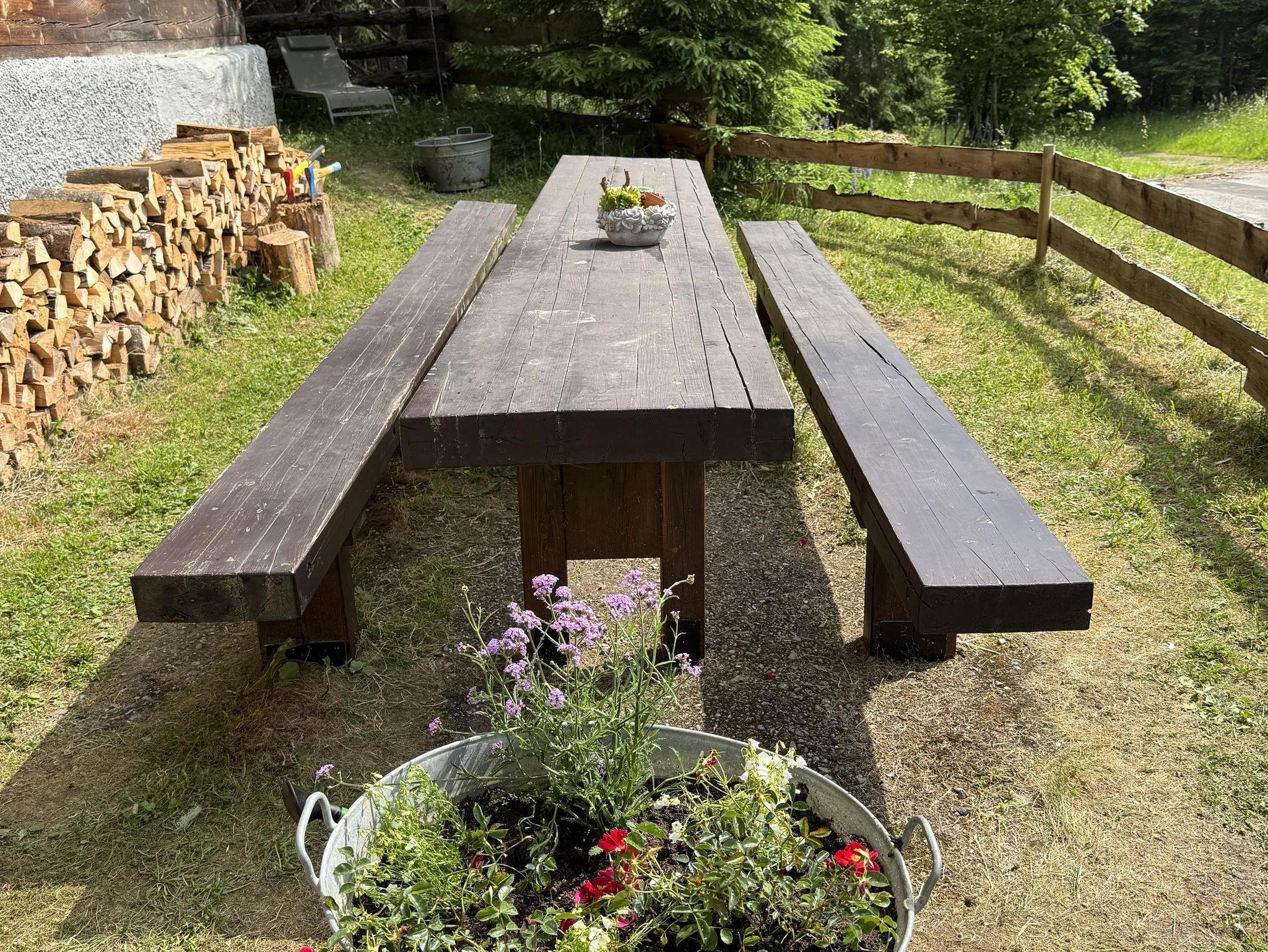 Grill und Tisch mit Bank auf der Wiese vor der Nockstern Hütte.