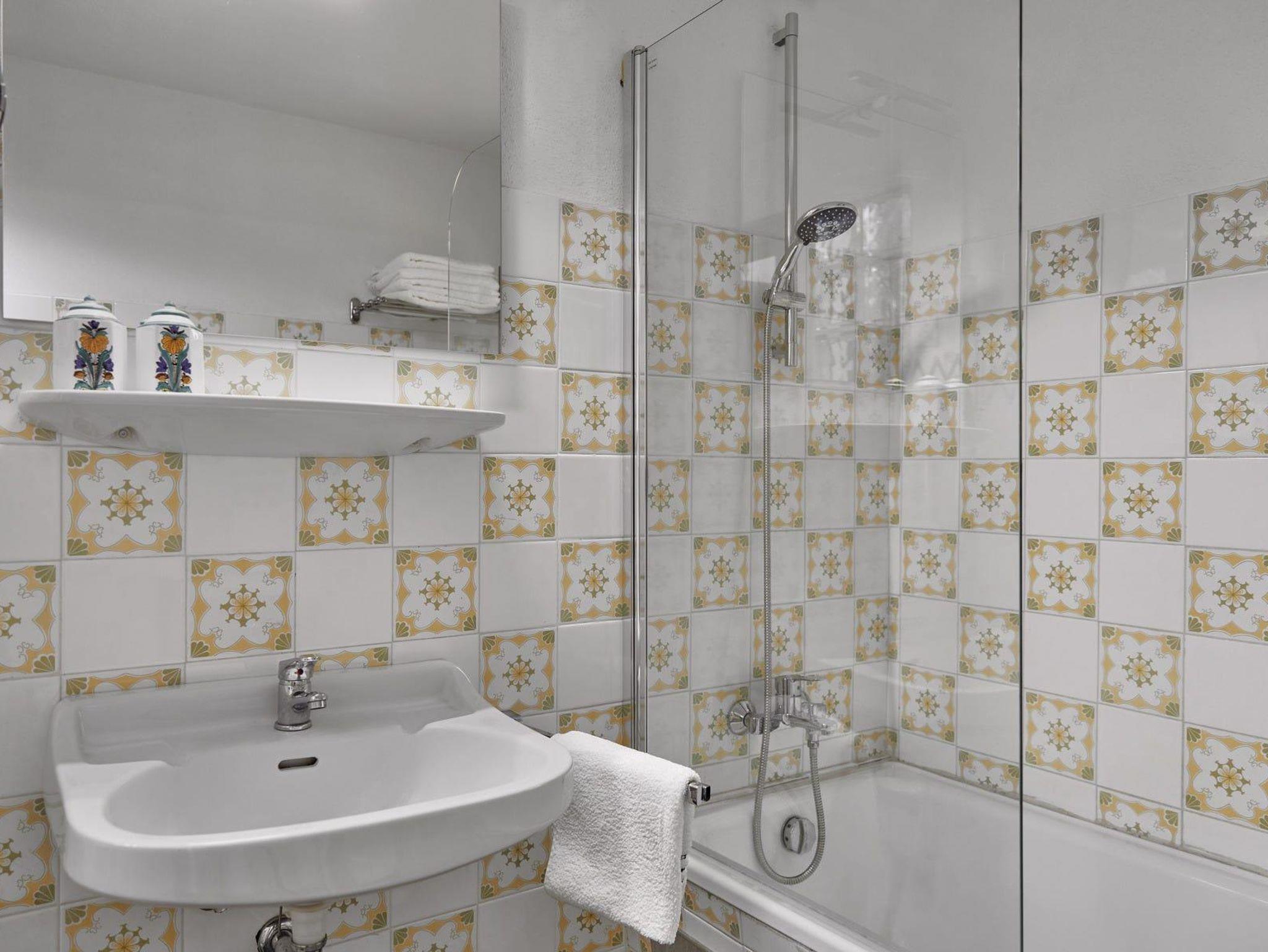 Ein Badezimmer mit Badewanne/Dusche, Waschbecken und WC im Obergeschoss, eine Dusche, ein WC, Waschbecken und Waschmaschine im Untergeschoss.