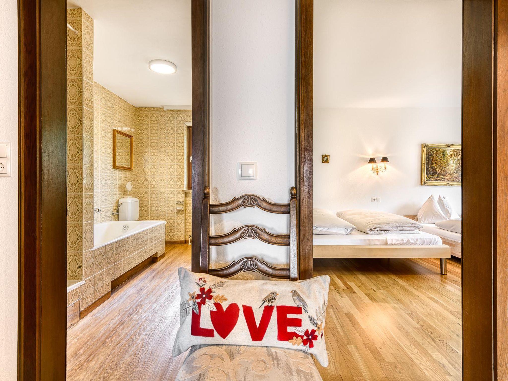 Die Villa hat 5 Schlafzimmer, 2 davon mit jeweils einem Doppelbett. Ein Schlafzimmer im Erdgeschoß hat ein Stockbett sowie ein Einzelbett. Ein weiteres Schlafzimmer im Obergeschoss hat zwei Stockbetten. Das fünfte Schlafzimmer bietet mit jeweils zwei Doppelbetten Platz für weitere vier Personen. Insgesamt zählt die gesamte Villa also 15 Standardbetten.