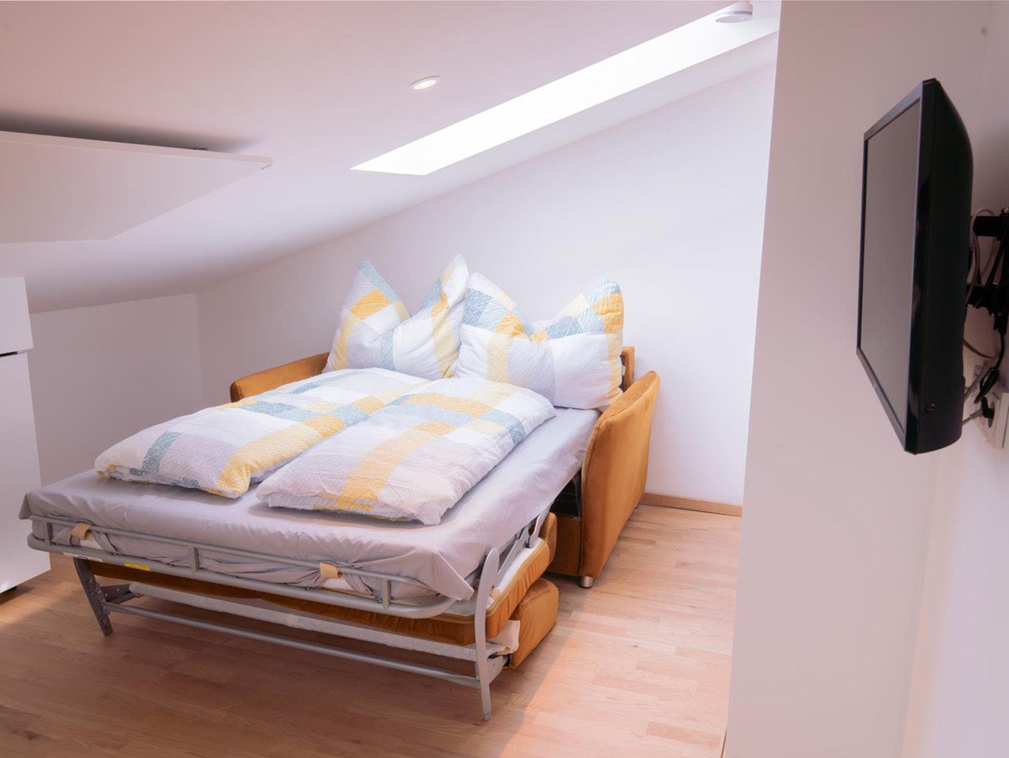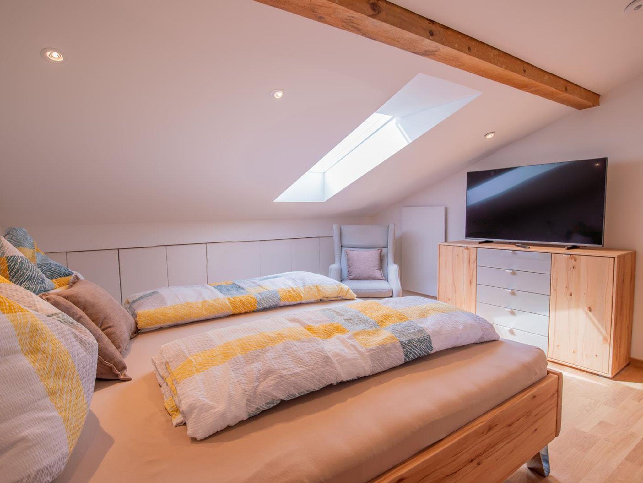 Unsere neu renovierte Dachgeschosswohnung besteht aus zwei getrennten begehbaren Schlafzimmern (1 Doppelbettzimmer und 1 Vierbettzimmer), ein Bad mit Dusche, Waschtrockner, Föhn, einem grossen Wohn-Essbereich mit Schlafcouch . In jeden Zimmer gibt es TV und Radio über Lautsprecher. Das Apartment verfügt über einen Autoabstellplatz sowie ein Abstellraum für Ski und Golfausrüstung. Die Terrasse befindet sich hinter dem Haus mit Markise und Sitzplätzen sowie ein Grill. Im Winter haben wir ein Kaminzimmer mit Dartscheibe und Kühlschrank im Aussenbereich, was zum Feiern und Verweilen einlädt