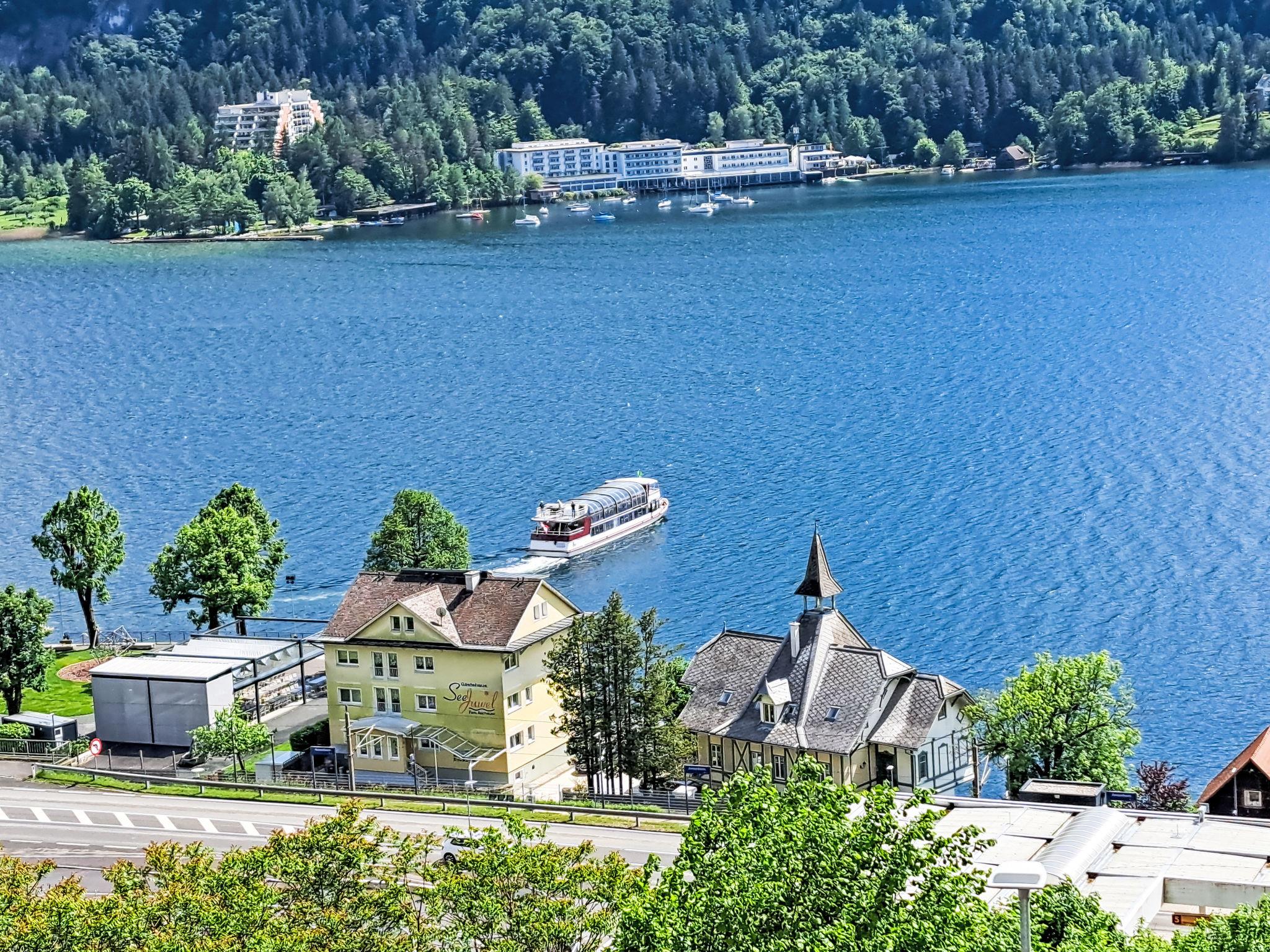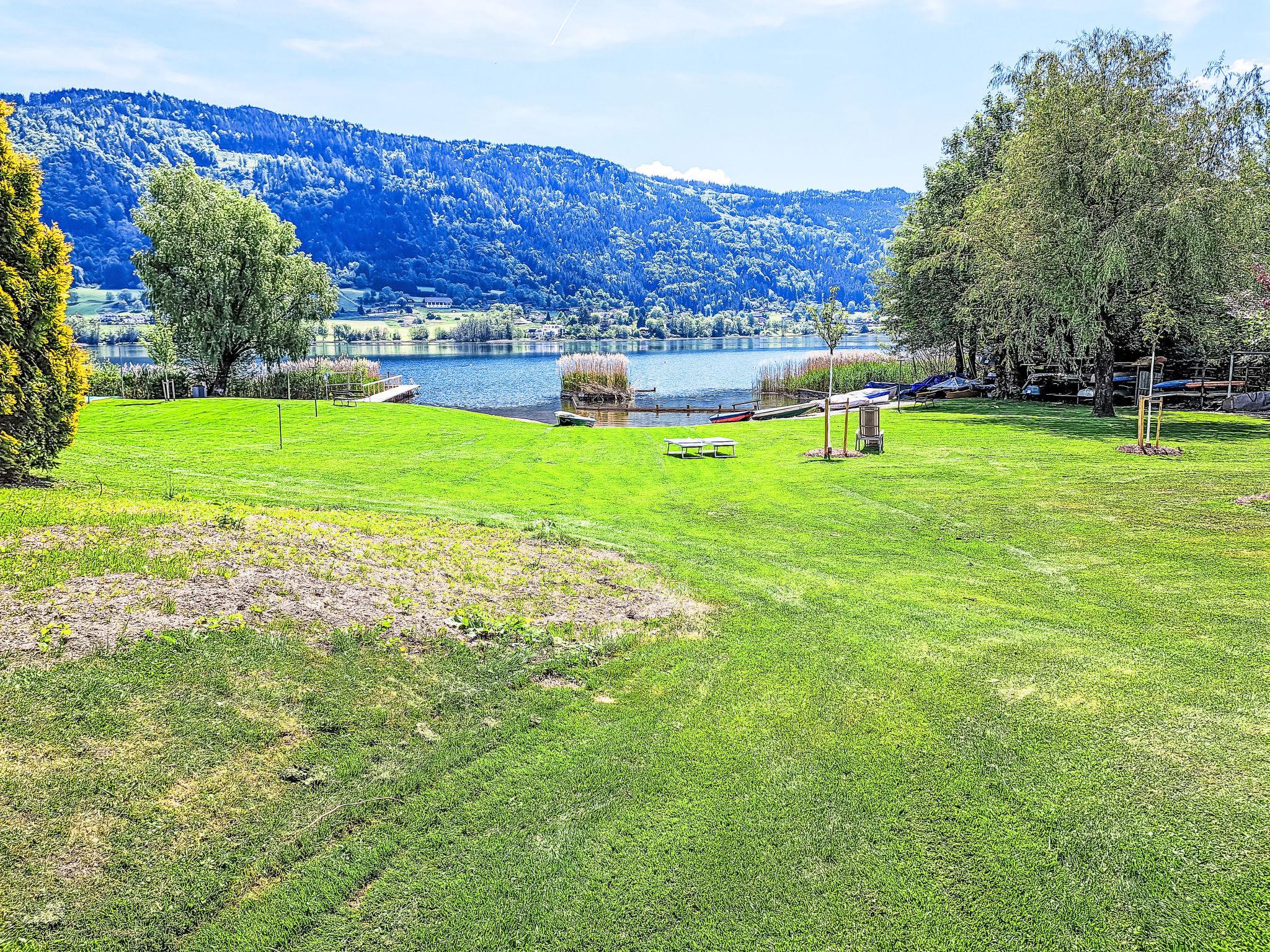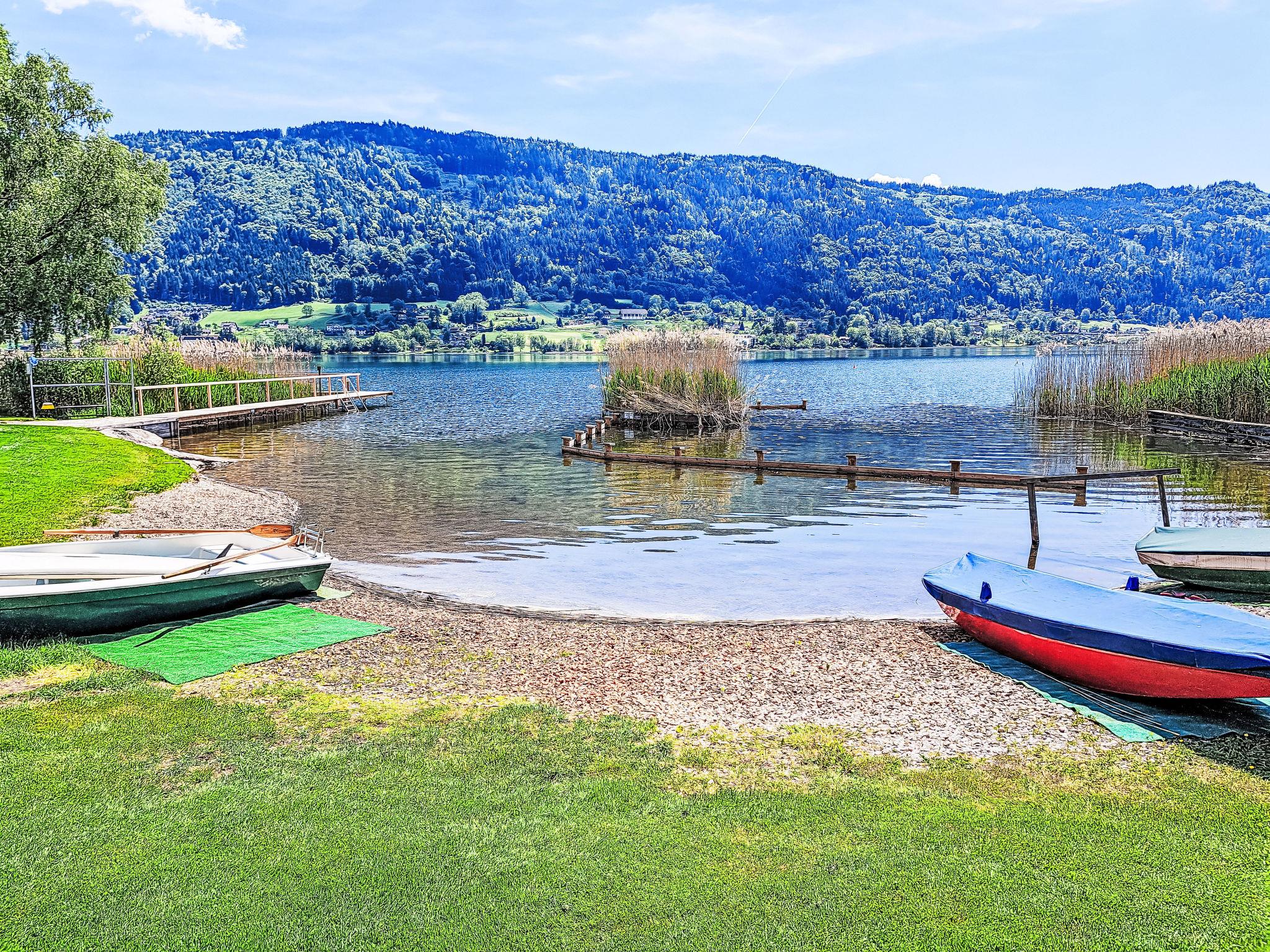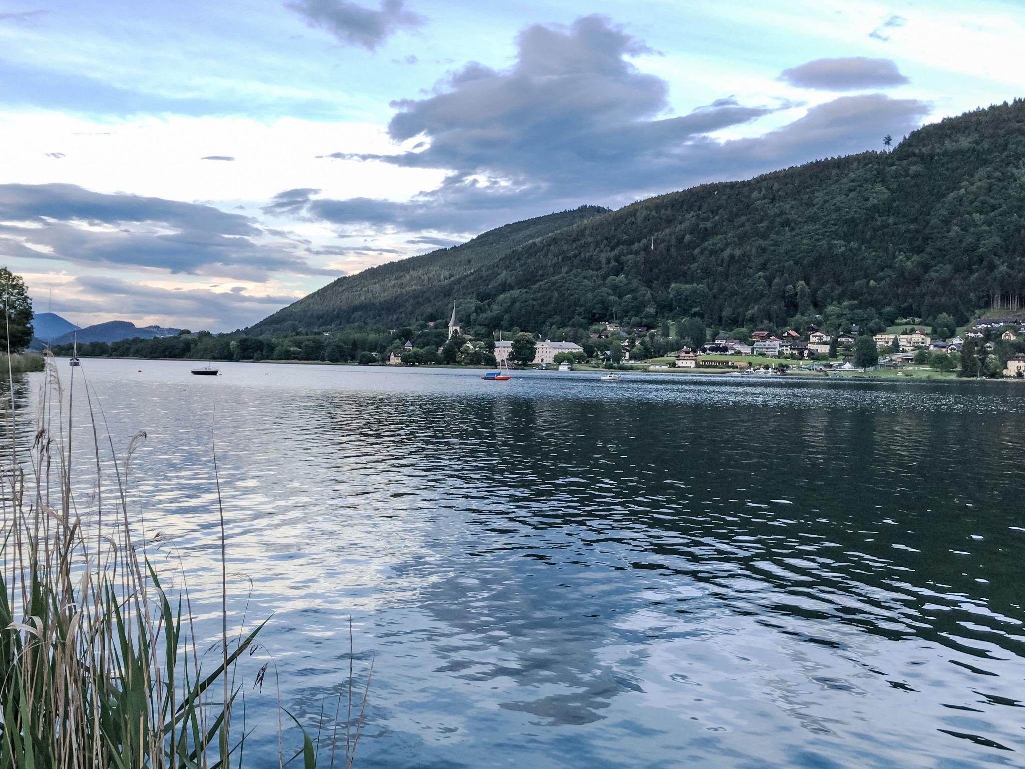 "Seezugang & Ski Ossiacher See", 2-room apartment 52 m2 on 2nd floor. Bright, fully renovated, very comfortable and modern furnishings: entrance hall. 1 room with 1 double bed. Exit to the balcony. Living/dining room with 1 double sofabed, dining table and satellite TV (flat screen). Exit to the balcony. Kitchen (oven, dishwasher, 4 ceramic glass hob hotplates, toaster, kettle, microwave, electric coffee machine). Shower/WC. Heating. Large balcony 10 m2. Balcony furniture, deck chairs (2). Very beautiful panoramic view of the lake. Facilities: iron, mosquito net, baby cot for up to 2 year olds, hair dryer. Internet (WiFi, free). Parking at the house. Please note: non-smokers only.