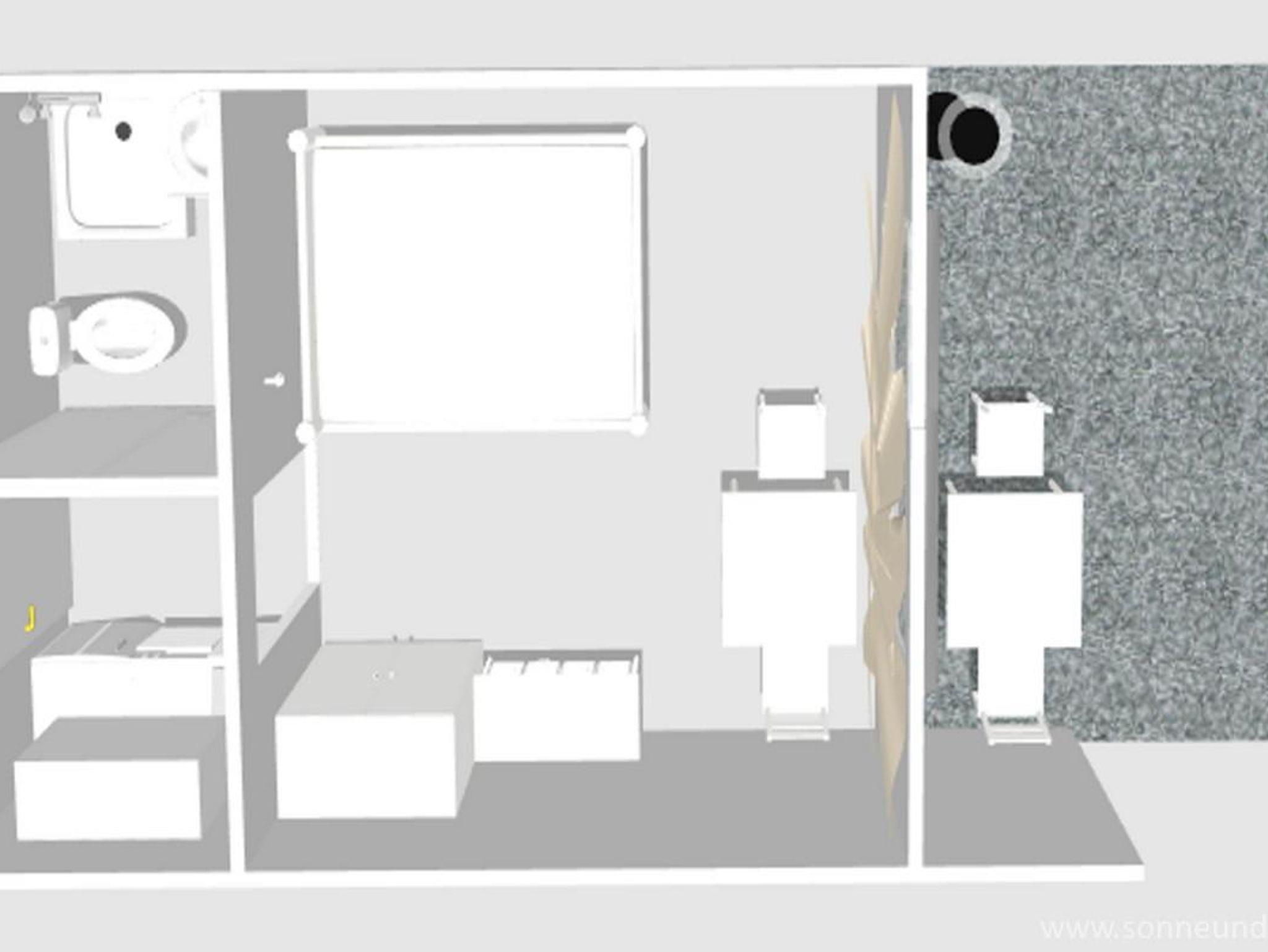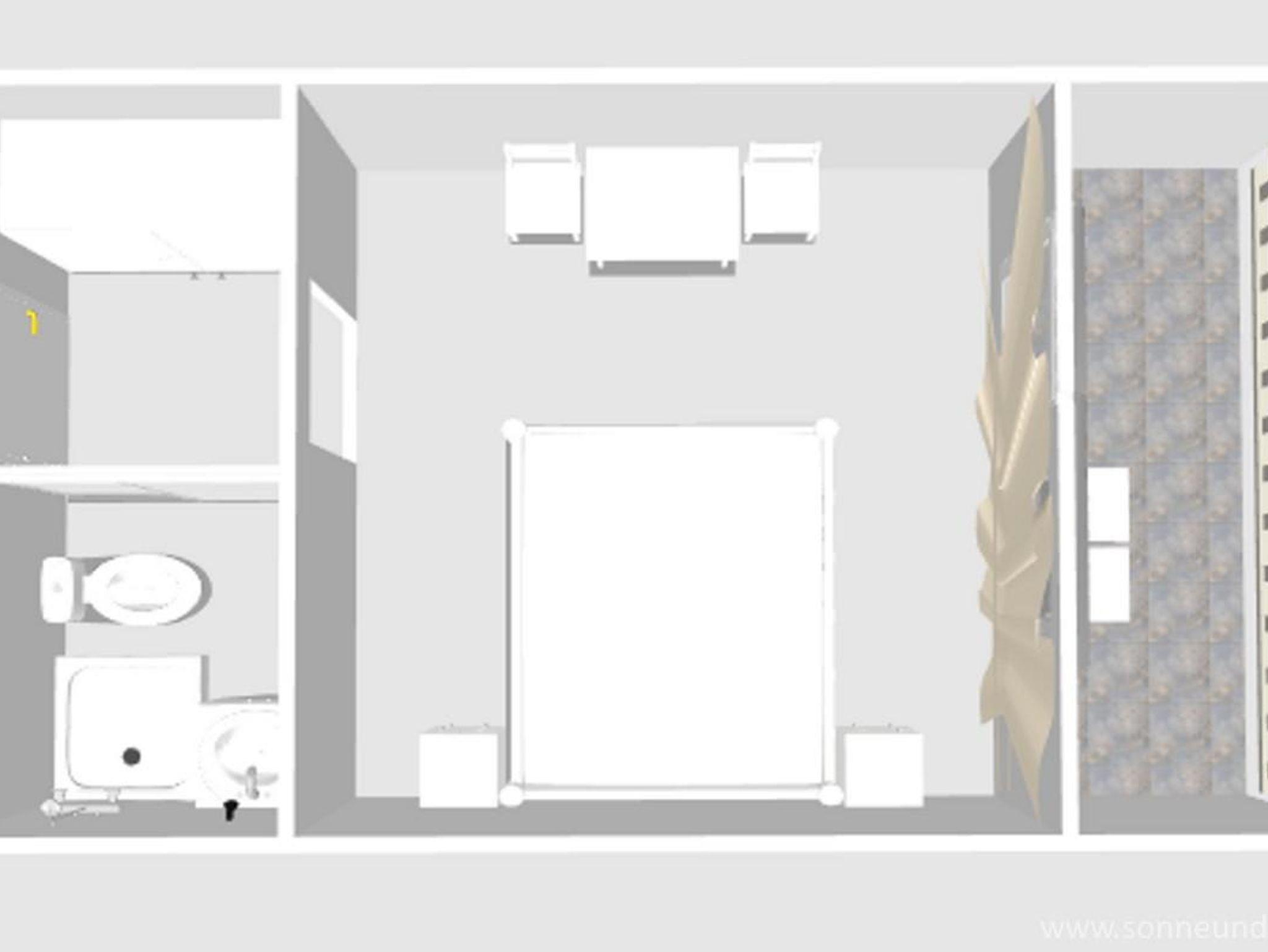 Aufteilung: Wohnküche, zwei getrennt begehbare Zimmer mit Doppelbett, Bad (Dusche & WC), Balkon.