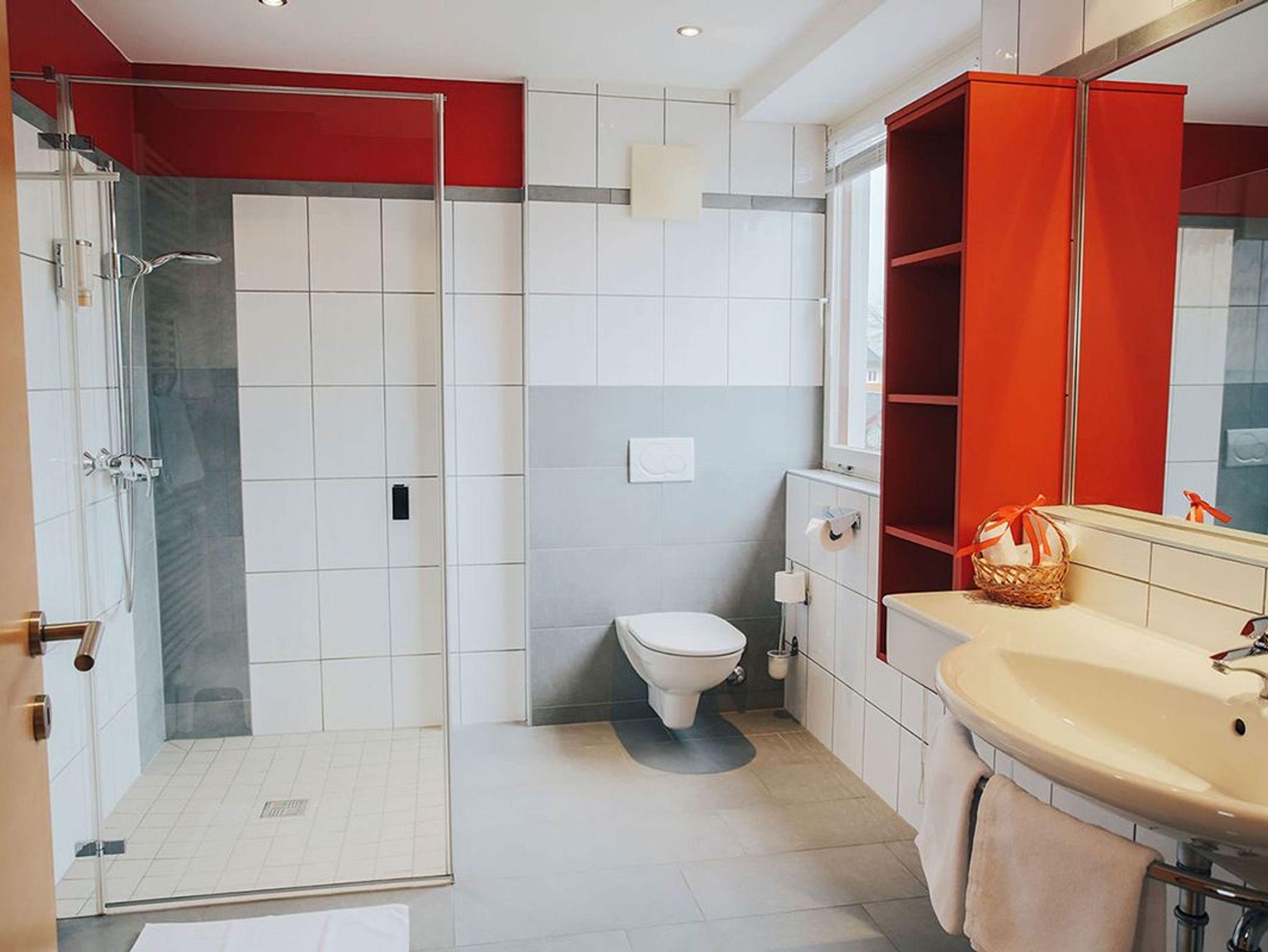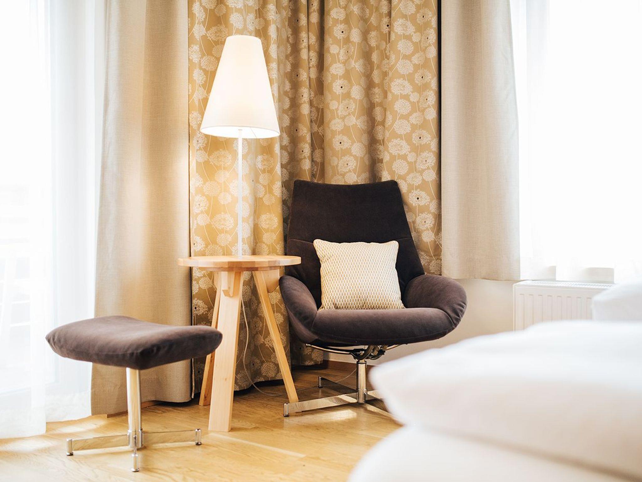 Doppelzimmer „Landskron“ mit 32 m² Schlafzimmer mit Relax-Stuhl. Seebalkon mit traumhaftem Blick auf den See. Dusche, teilweise separates WC, Sat-TV, Telefon und Glasfaser-WLAN.