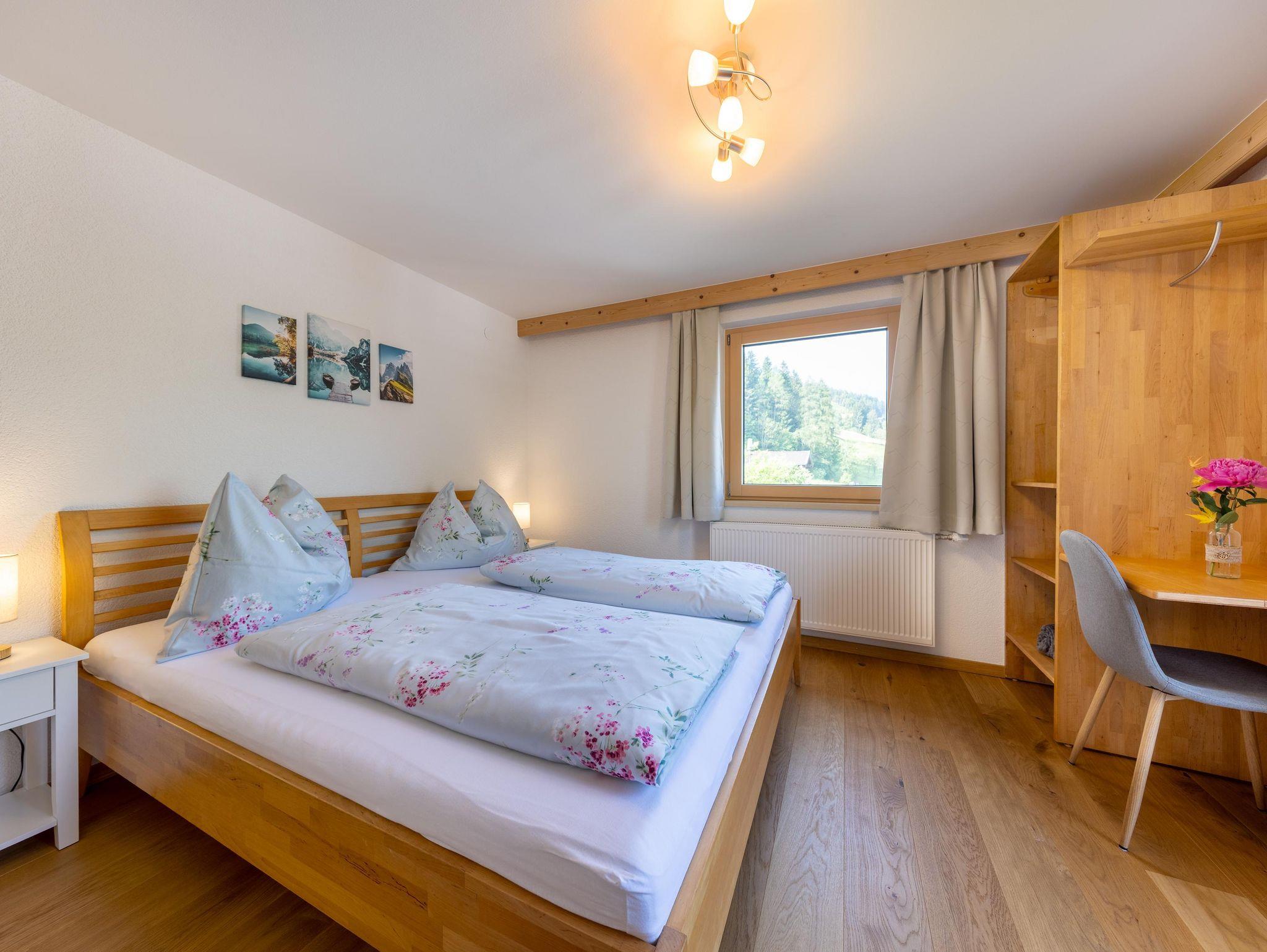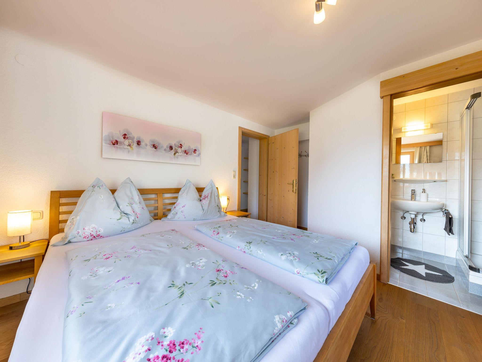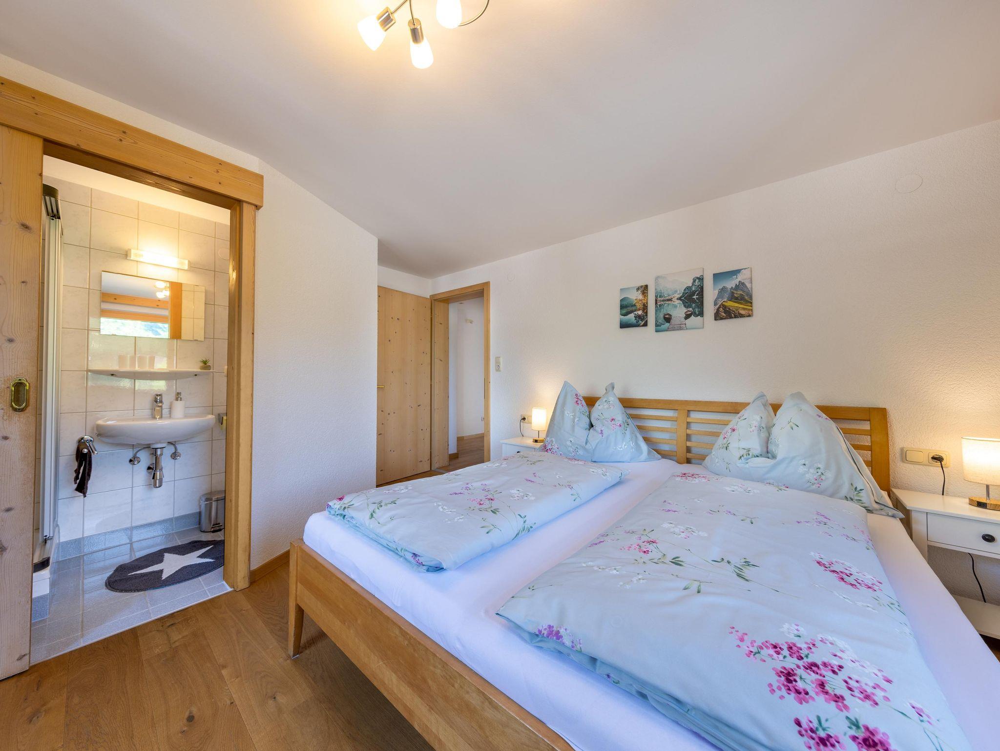 Diese großzügige Ferienwohnung verfügt über zwei Schlafzimmer (ein Doppelbett, zwei Einzelbetten), ein Badezimmer mit Dusche sowie ein separates WC. Die helle Wohnküche bietet einen wundervollen Blick auf die Berge und in den Garten. Highlight ist die große Terrasse mit edlem Zirbenholzboden – ideal zum Entspannen.