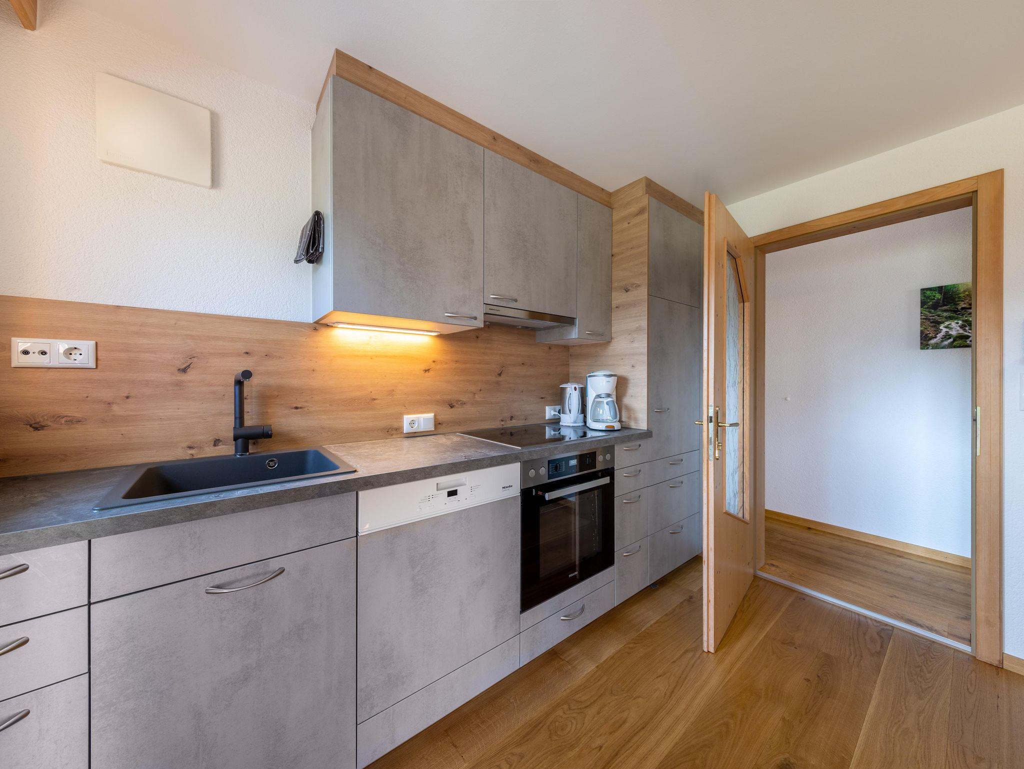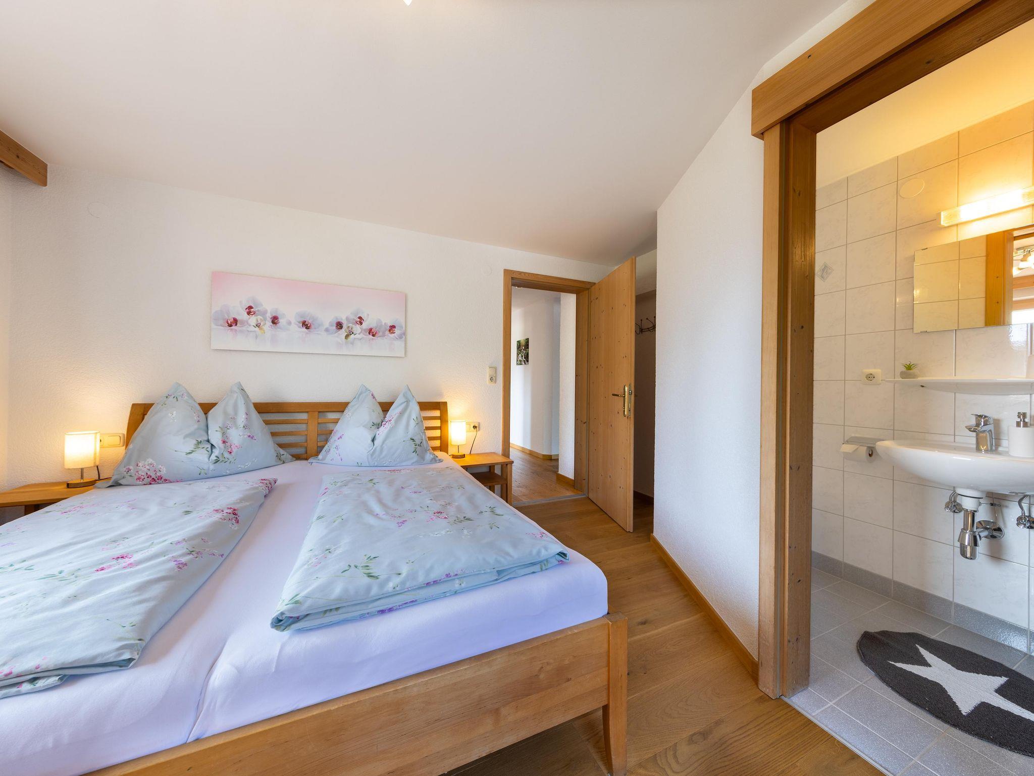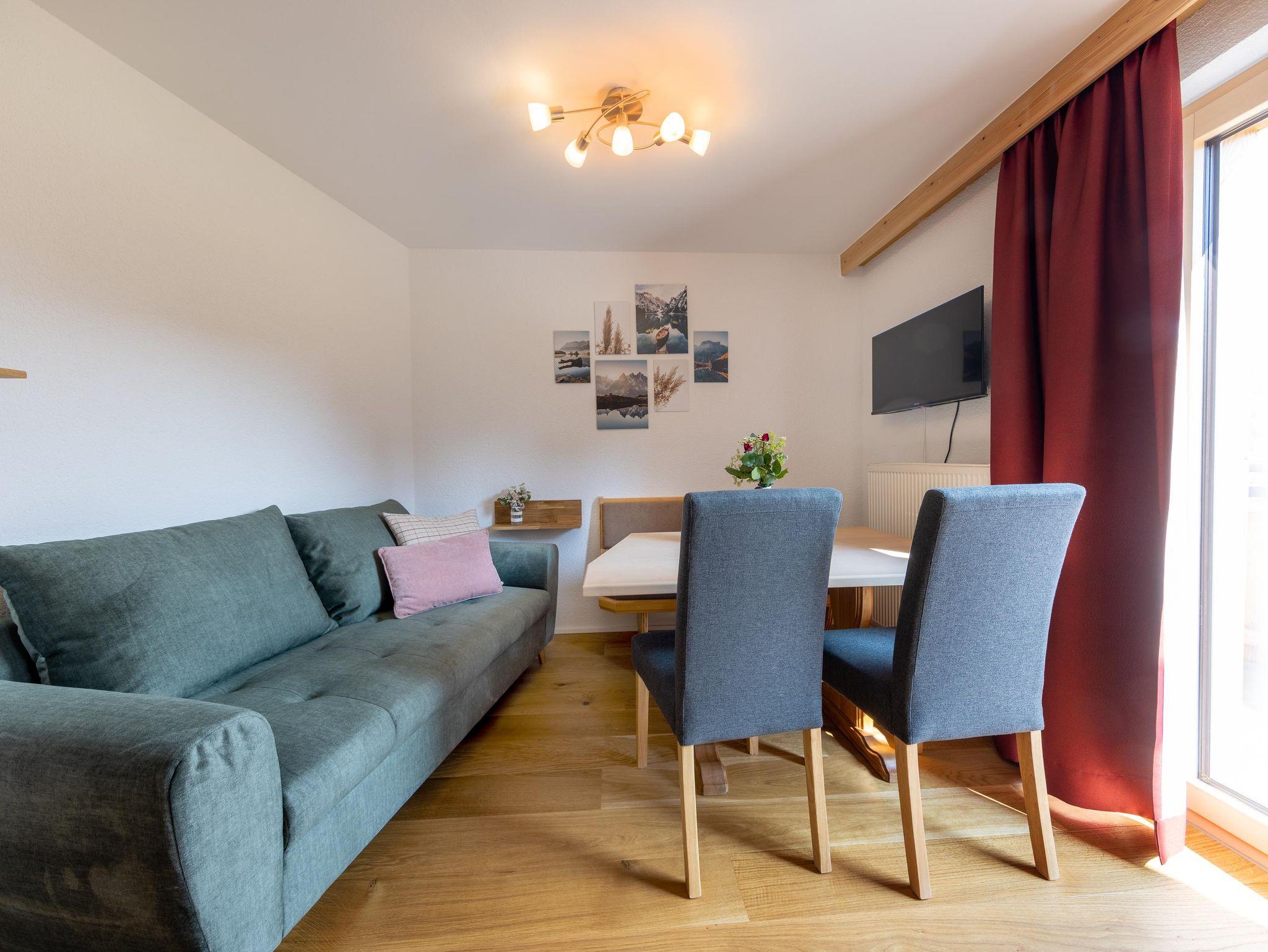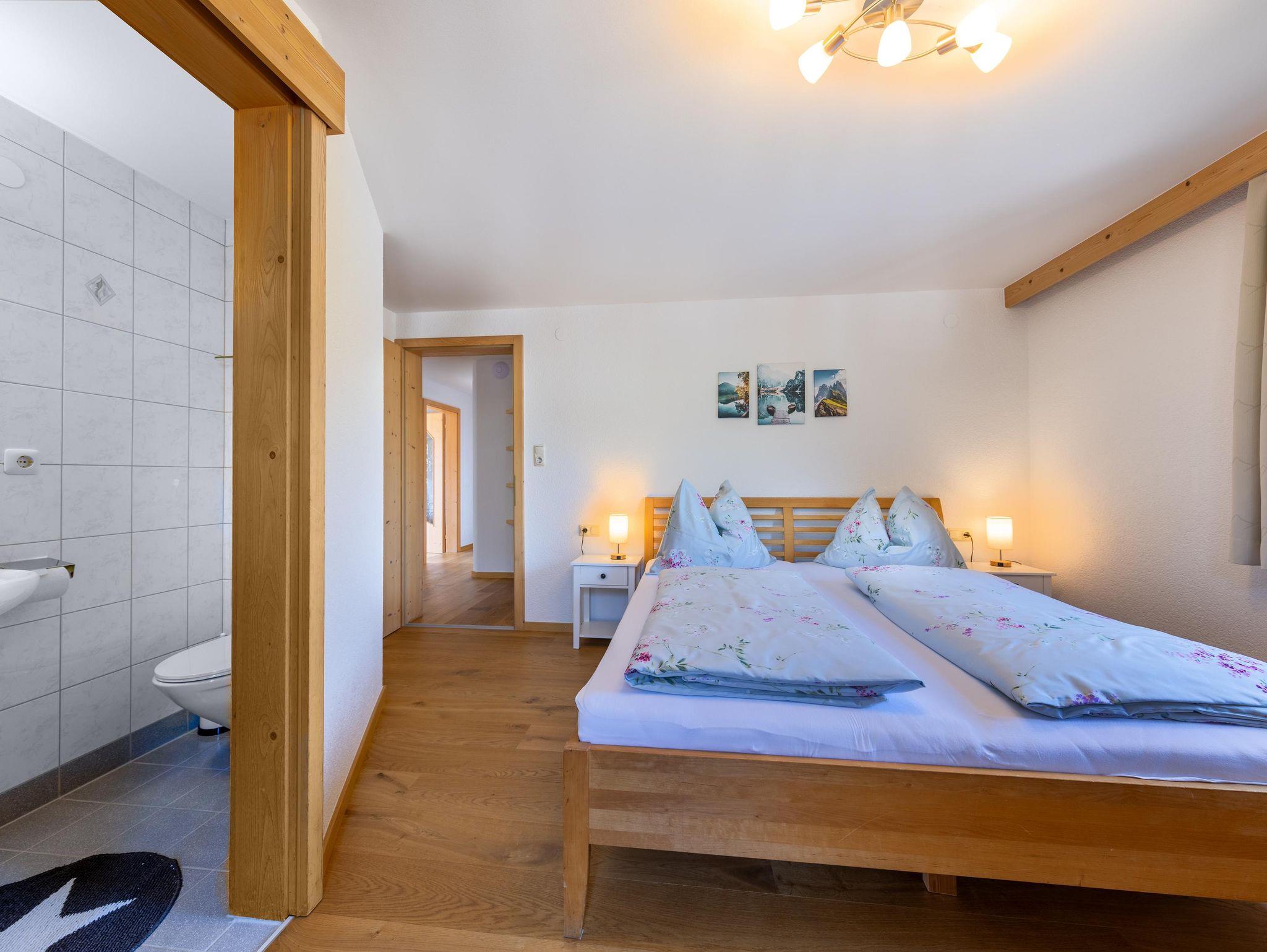 Diese großzügige Ferienwohnung verfügt über zwei Schlafzimmer (ein Doppelbett, zwei Einzelbetten), ein Badezimmer mit Dusche sowie ein separates WC. Die helle Wohnküche bietet einen wundervollen Blick auf die Berge und in den Garten. Highlight ist die große Terrasse mit edlem Zirbenholzboden – ideal zum Entspannen.