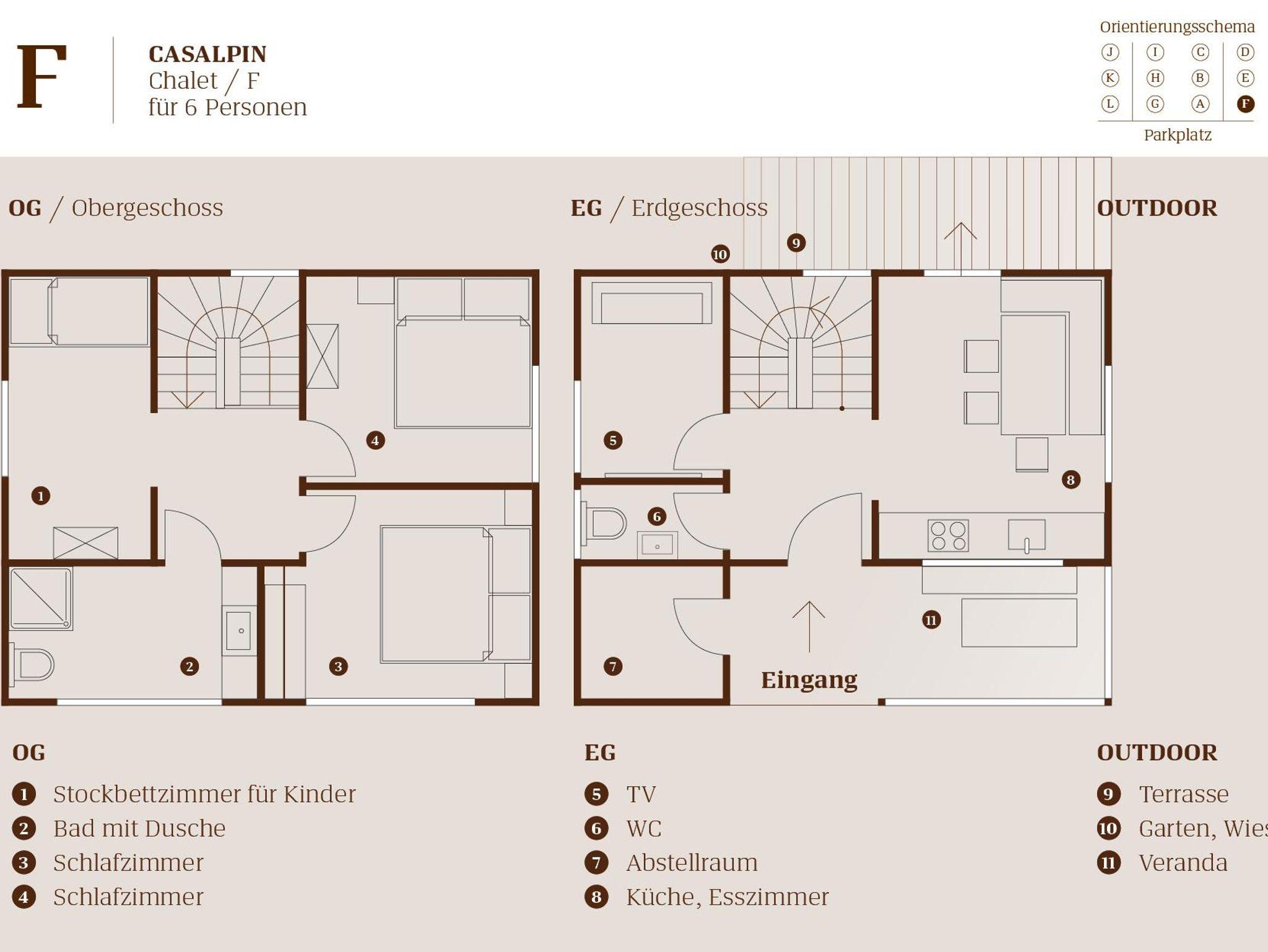 Das Chalet bietet auf 80?m² Platz für bis zu 6 Personen und erstreckt sich über zwei Stockwerke. Im Obergeschoss befinden sich zwei Schlafzimmer mit Doppelbetten sowie ein Kinderschlafzimmer mit Stockbett. Darüber hinaus verfügt das Chalet über eine komplett ausgestattete Küche mit allen wichtigen Küchenutensilien, ein Badezimmer mit Dusche, eine Terrasse, einen Garten, eine überdachte Veranda mit Sitzbank und einen Parkplatz direkt vor der Hütte.