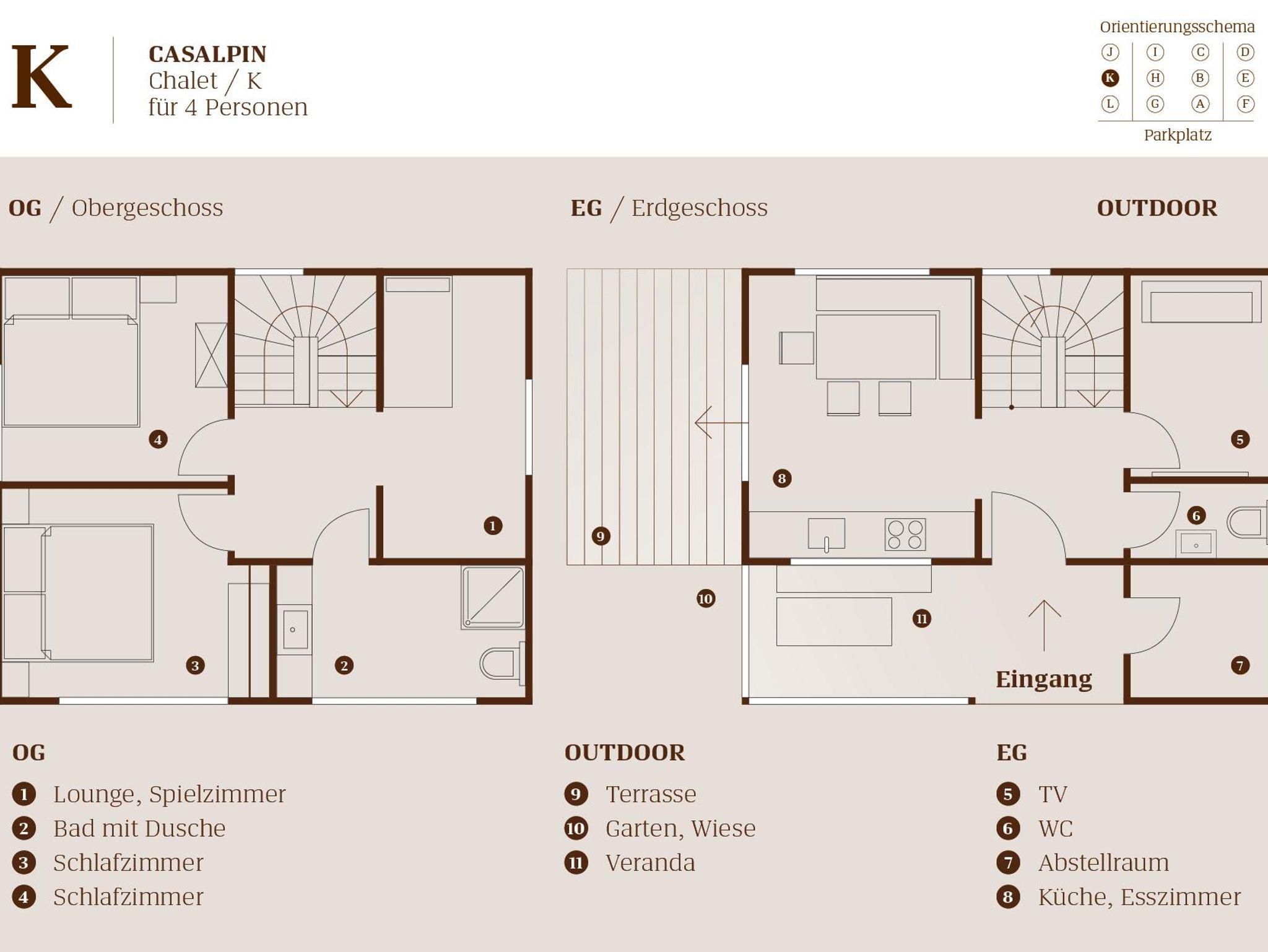 Das Chalet bietet auf 80?m² Platz für bis zu 4 Personen und erstreckt sich über zwei Stockwerke. Im Obergeschoss befinden sich zwei Schlafzimmer mit Doppelbetten sowie ein Ruheraum mit Couch. Darüber hinaus verfügt das Chalet über eine komplett ausgestattete Küche mit allen wichtigen Küchenutensilien, ein Badezimmer mit Dusche, eine Terrasse, einen Garten, eine überdachte Veranda mit Sitzbank und einen Parkplatz direkt vor der Hütte.