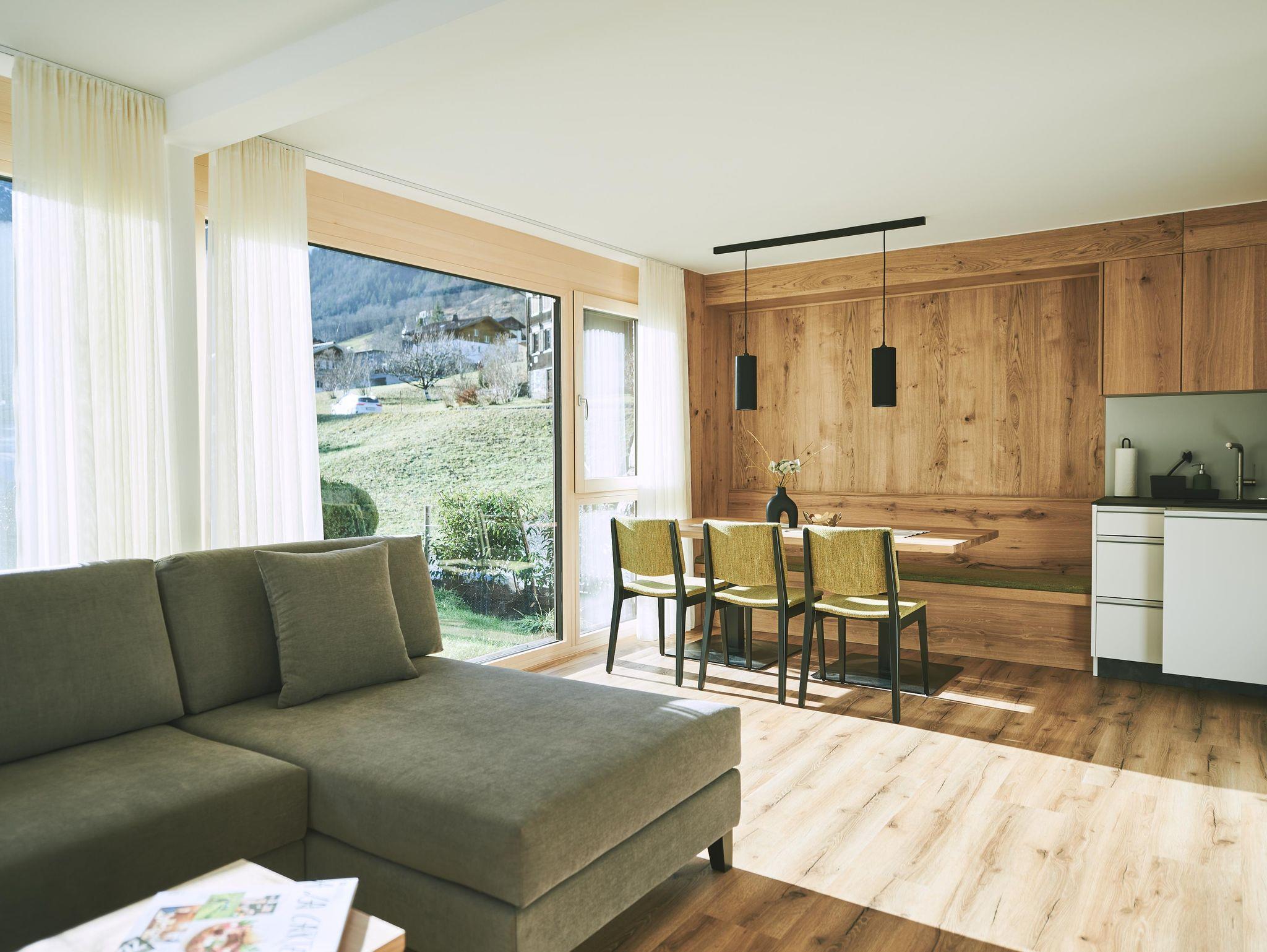 NATÜRLICHES WOHLBEFINDEN ERFAHREN Direkt an das Restaurant angrenzend befindet sich das 59 Quadratmeter große Appartement Schesaplana im OG2/EG und bietet Platz für zwei bis vier Personen. Ausgestattet mit einem kleinen Wohn-Essbereich, einer umso größeren südseitigen Panoramaterrasse mit Bergblick auf die Schesaplana die Königin des Rätikonmassivs, 2 Doppelzimmern, Badezimmer mit Dusche und WC sowie einem separaten WC. In der vollausgestatteten Küche befinden sich Geschirrspüler, Induktionskochfeld, Backofen und Kapsel-sowie Filterkaffeemaschine. Heimeliges Wohngefühl und viel Holz gibt es von uns gerne obendrauf!