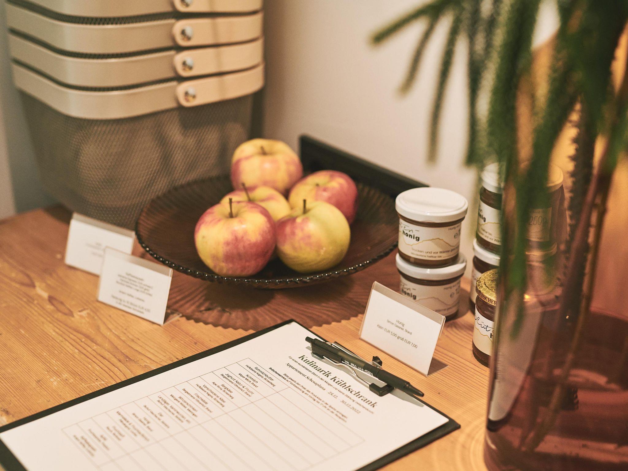 Für einen wunderbaren Start in den Morgen gibt es unseren frei zugänglichen Honesty Kühlschrank/Bar (SB 24/7) mit regionalen Produkten von unseren Bauern und Lieferanten (Butter, Käse, Schinken, Milch, Joghurt, Marmelade, Müsli, Honig, Getränke, Kaffeekapseln uvm.) sowie Brötchenservice von unserem Bäcker auf Vorbestellung.