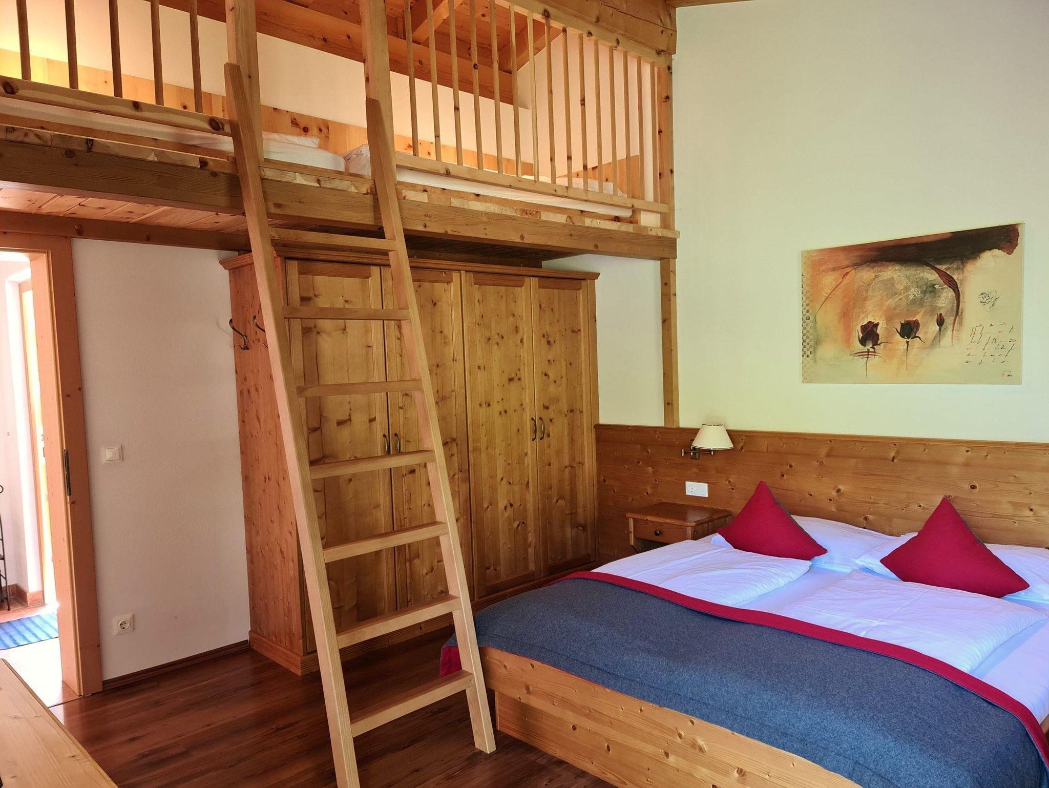 Großzügiges und urgemütliches Ferienhaus: Wohnraum mit offenem Kamin, TV, Sitzgruppe mit Schlafsofa, Küche mit Sitzecke, Badezimmer mit Dusche und WC, ein Schlafzimmer mit Doppelbett und Galeriebetten und TV, Abstellraum, W-Lan