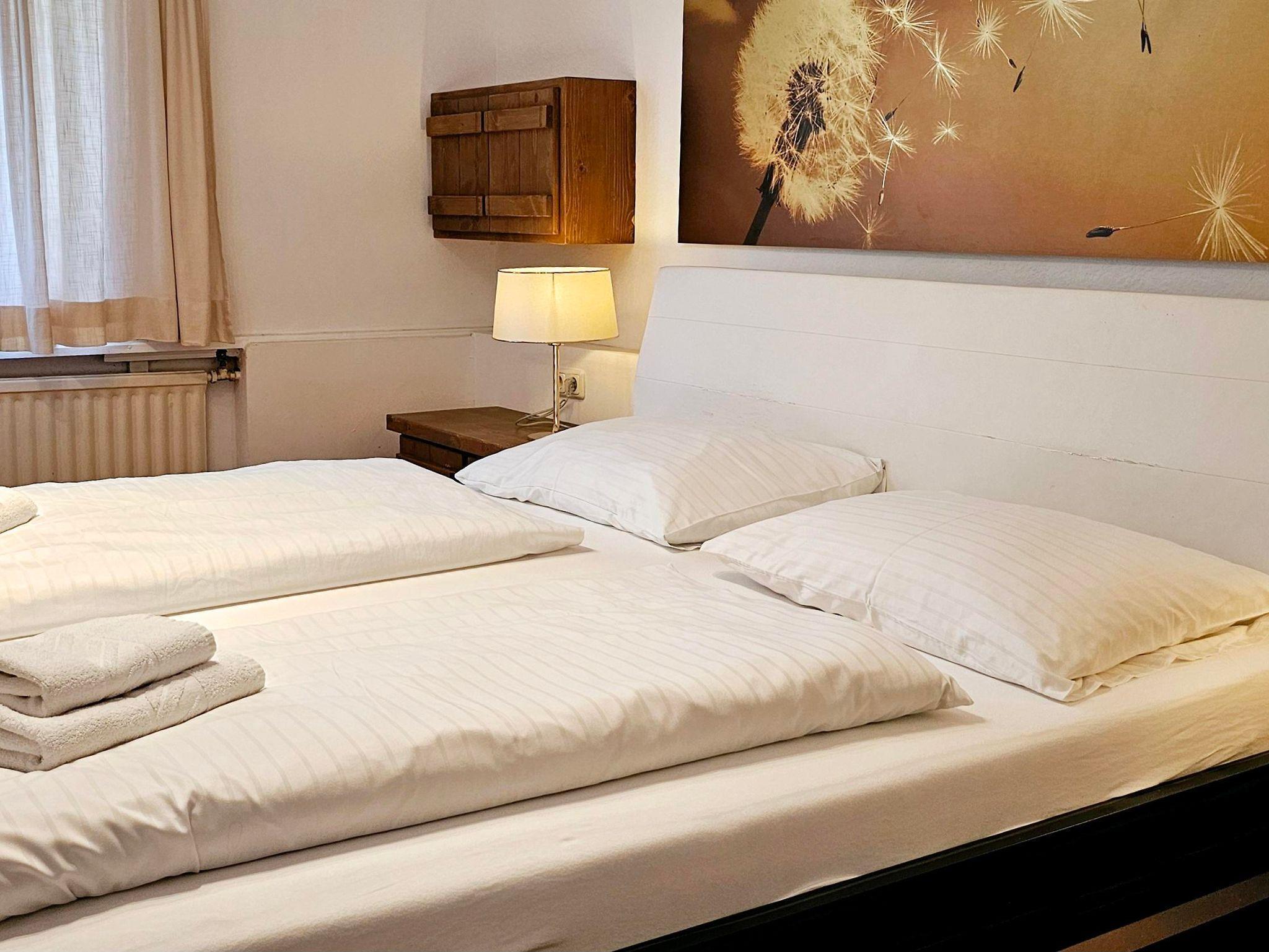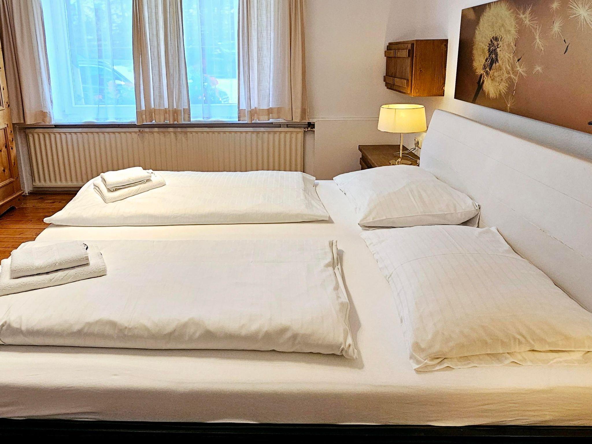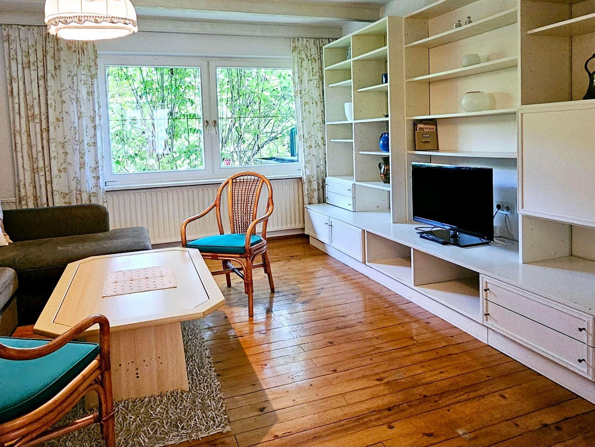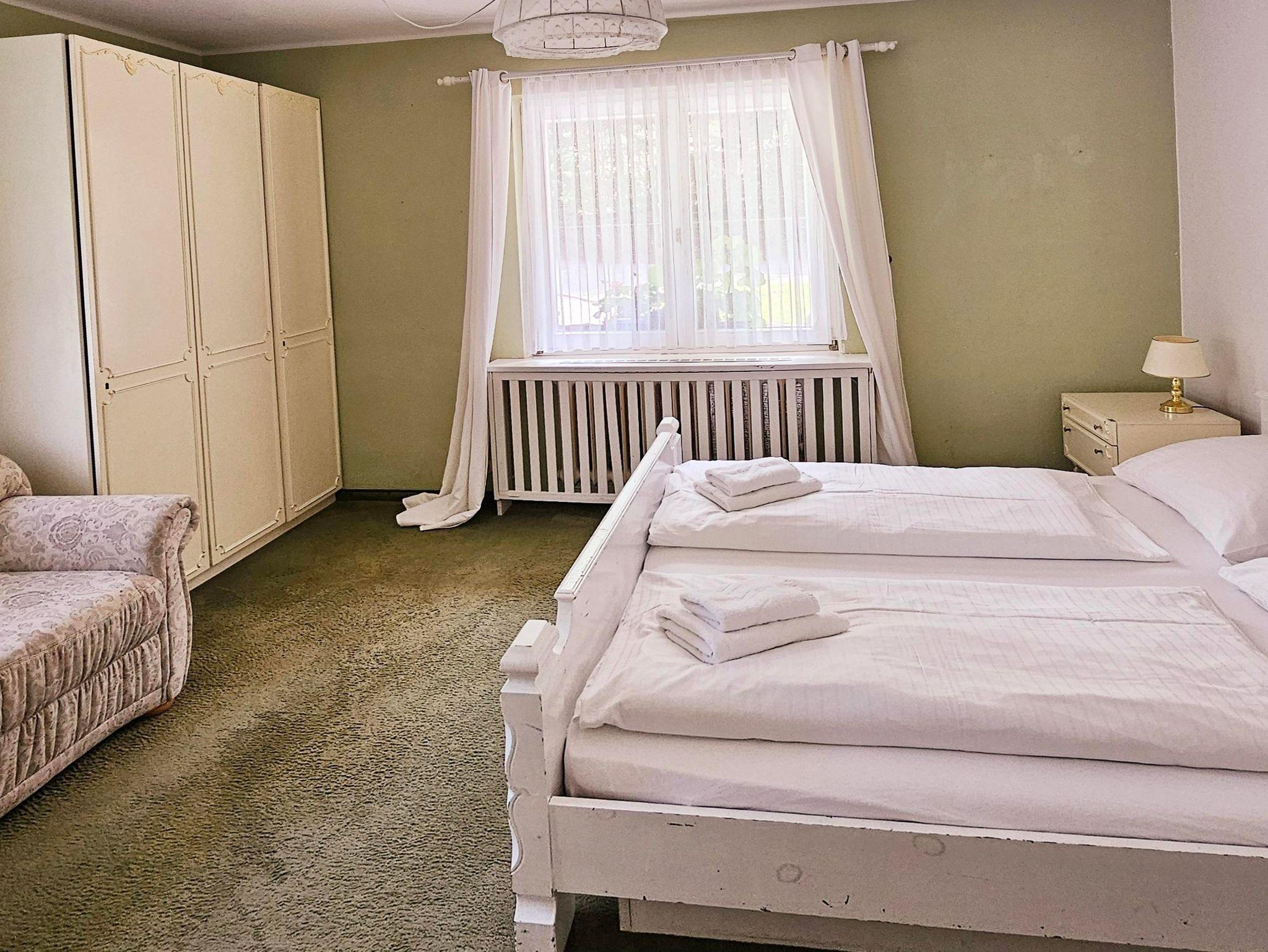 Großzügiges Appartement im Erdgeschoss. Zwei Schlafzimmer mit Doppelbett. Badezimmer mit Dusche und WC. Große Küche. Wohnzimmer mit Schlafcouch für 2 andere Personen.