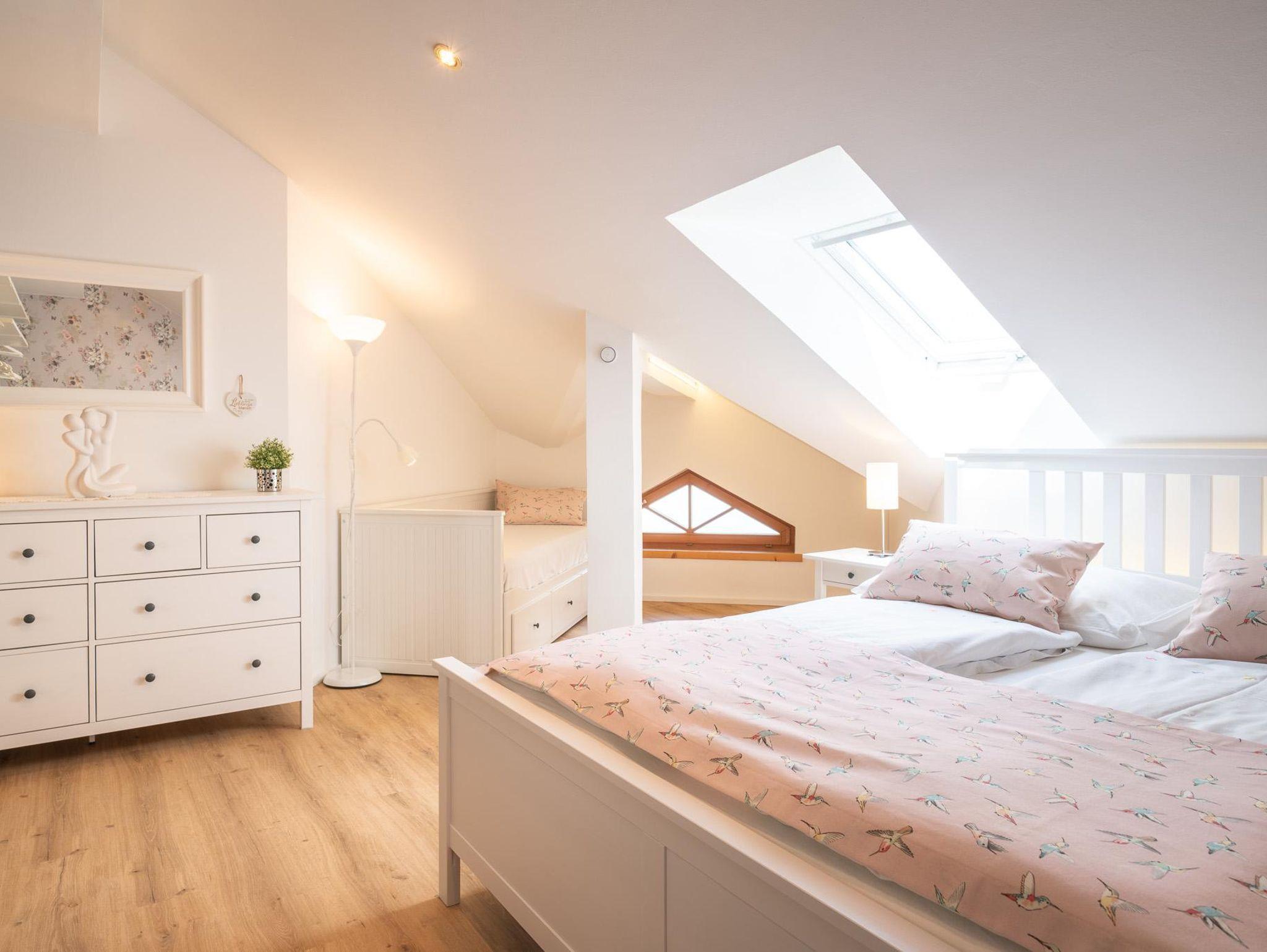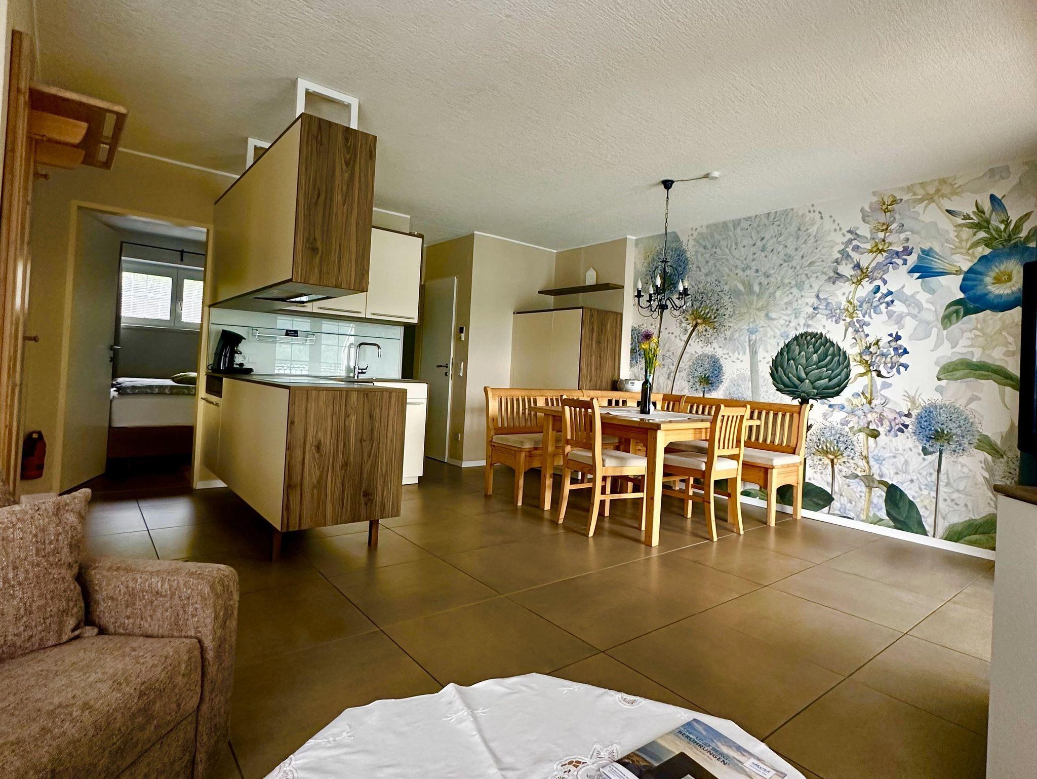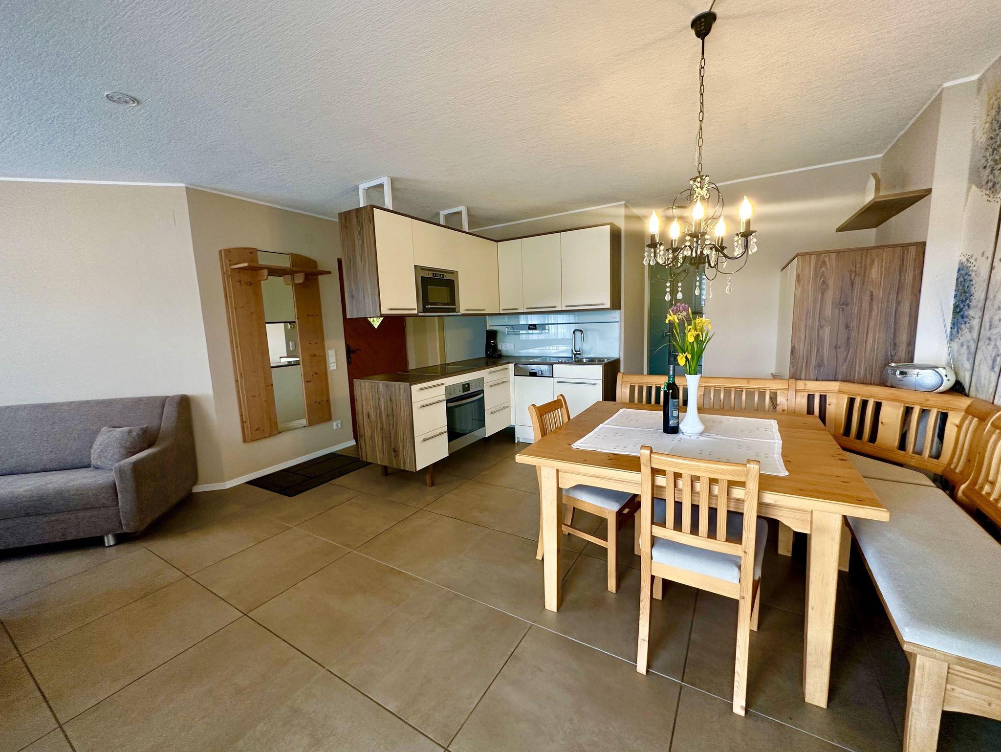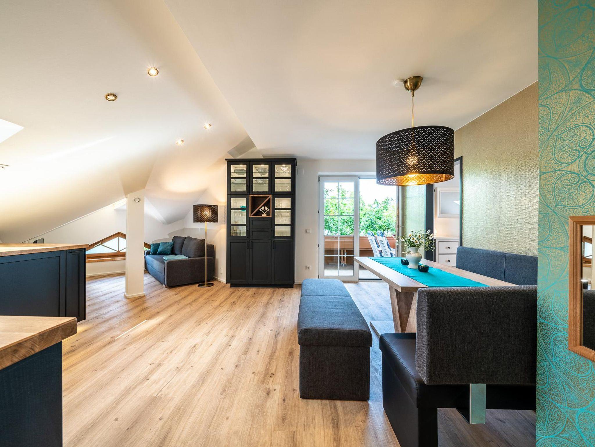 Ferienwohnung mit Seeblick für 2-4 Personen. Kinder bis 6 Jahre sind kostenlos. Die Wohnung hat eine Wohnfläche von 45 m² und einen Balkon zum See mit einer Fläche von 10 m². Der Wohnraum umfasst eine vollständig ausgestattete Küche, eine bequeme Doppelausziehcouch (2x2m) zum Schlafen, eine Essecke mit großem Esstisch und eine Garderobe. Im Schlafzimmer befinden sich Boxspringbetten (180 x 200 cm) und ein Kleiderschrank. Das Badezimmer verfügt über einen Duschbereich, eine Badewanne und ein separates WC.